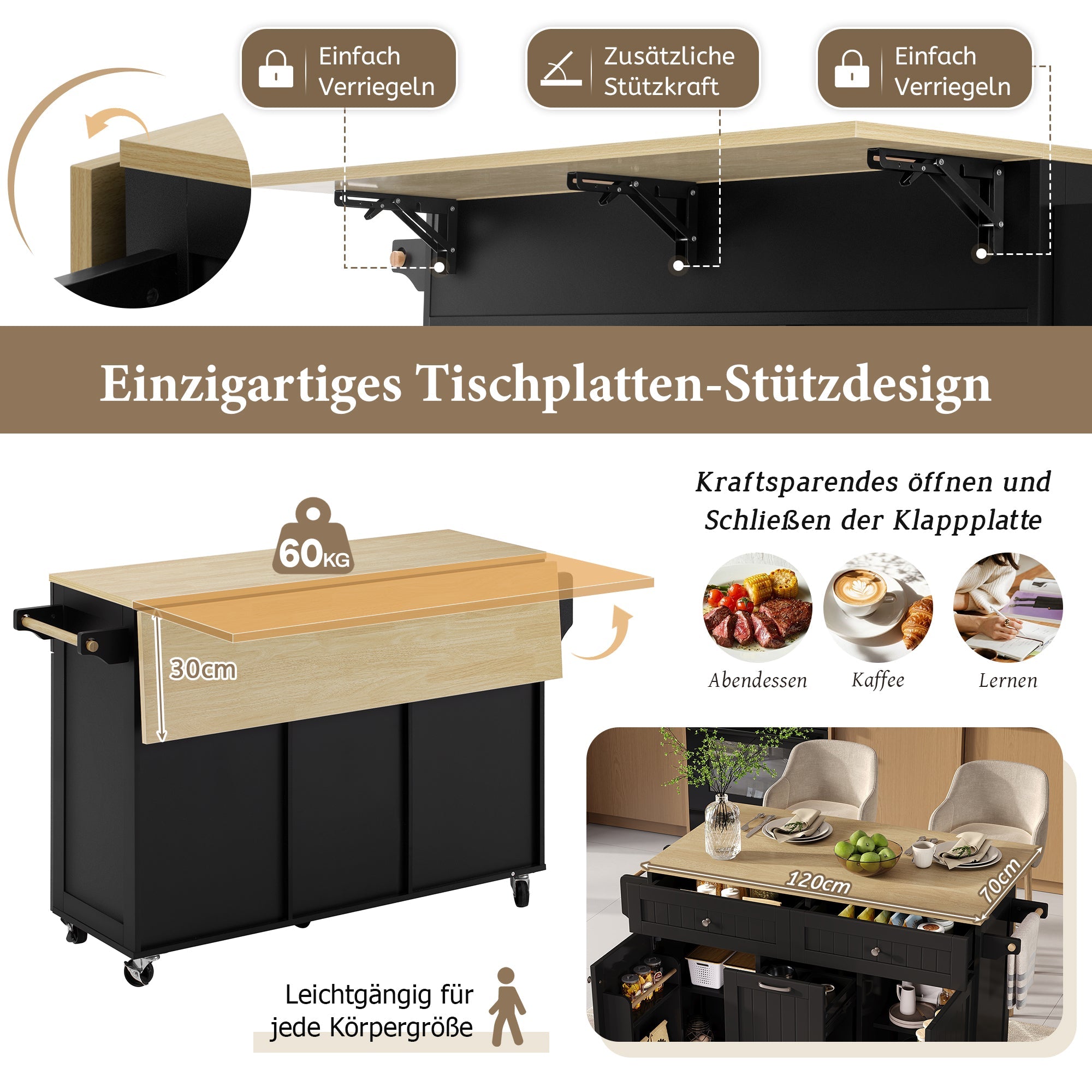 Extendable Work Surface: This kitchen island features an extendable and foldable work surface. When preparing a lavish meal, simply unfold it, and the kitchen island instantly provides a huge work area. After use, it folds back just as easily, so your small kitchen can be tidy again in no time. The work surface of this kitchen island is made of robust material and can support up to 60 kg.