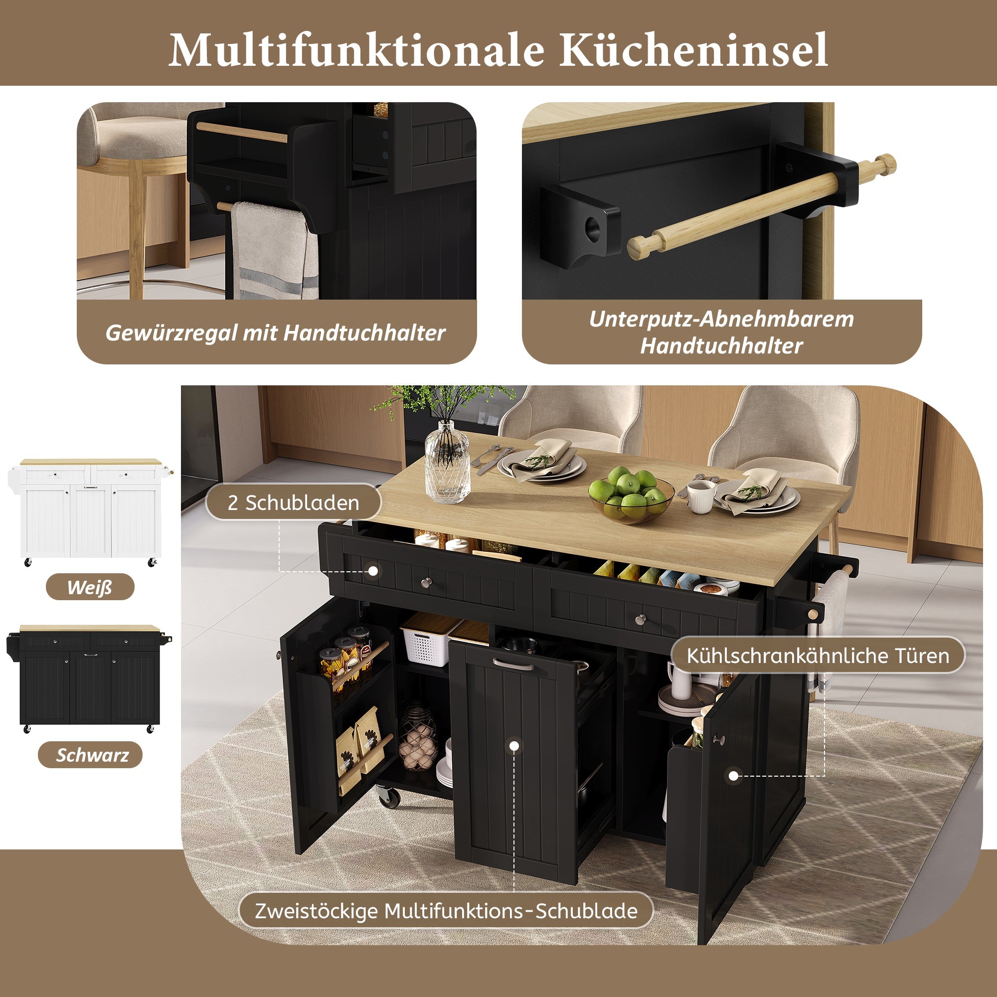 Kitchen Island, Extendable Mobile with Multifunctional Drawers, Black