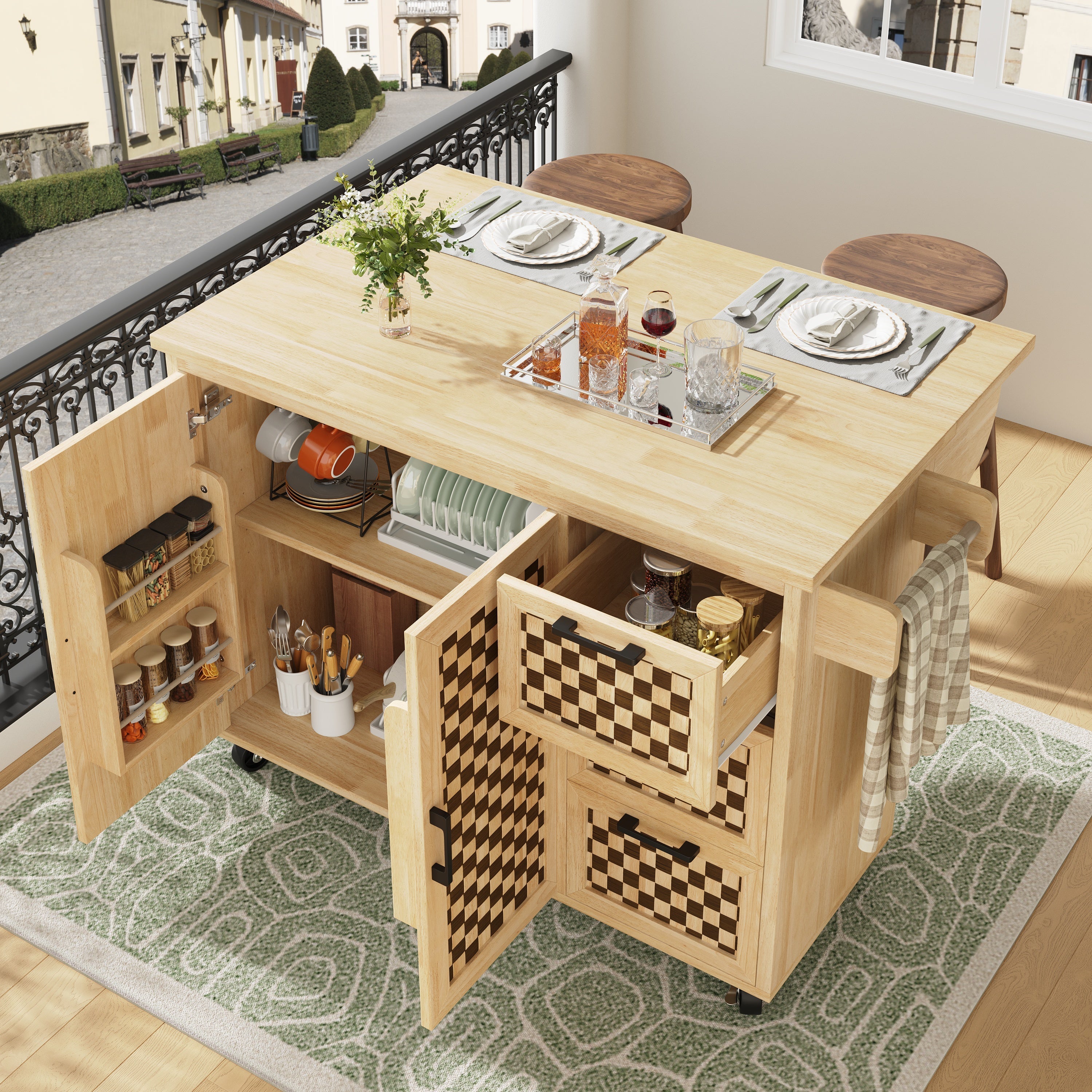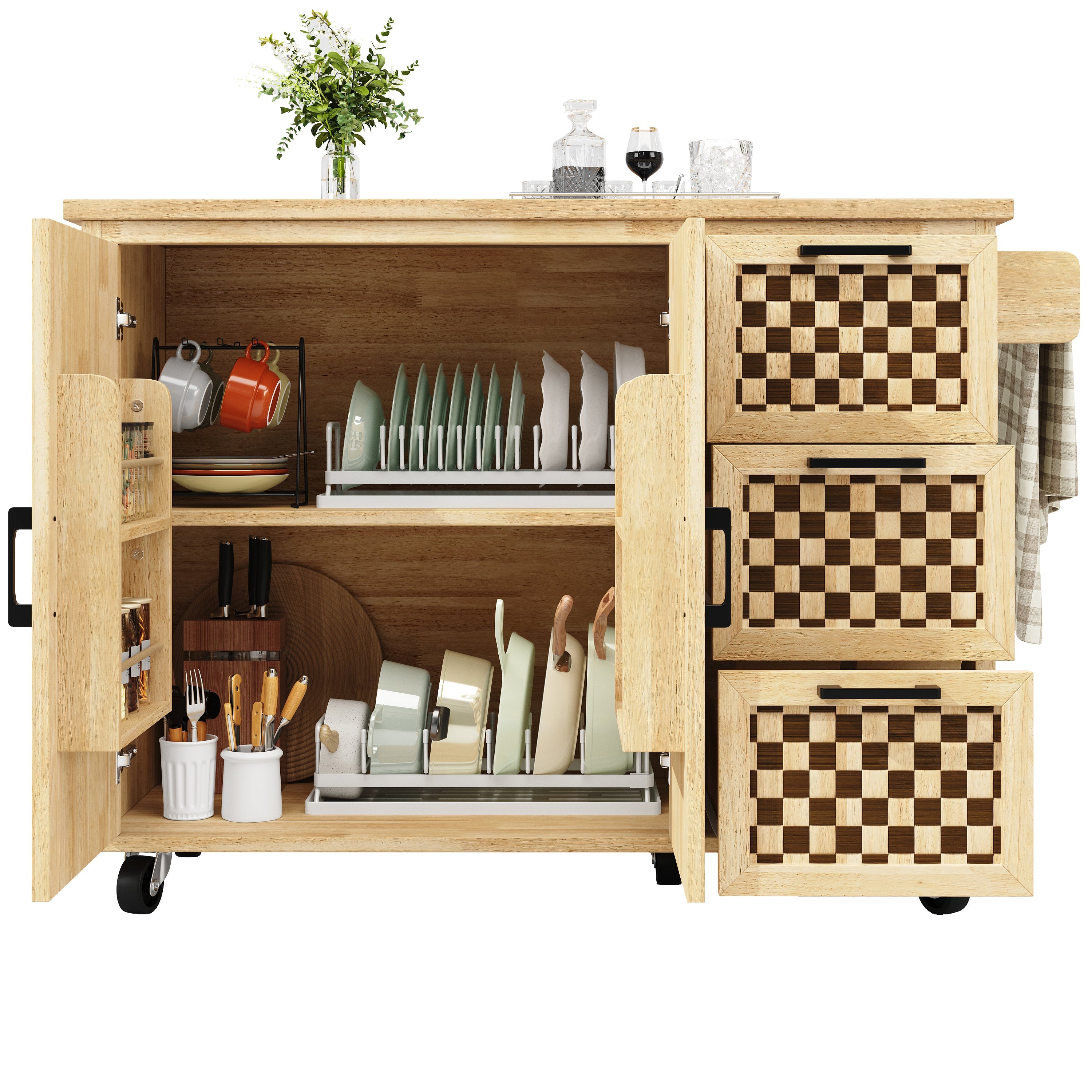 Ample Storage Space: This kitchen island features three spacious drawers for storage, two independent compartments with double doors for different needs, adjustable shelves, towel rails, and over-the-door shelves for added convenience and efficiency.