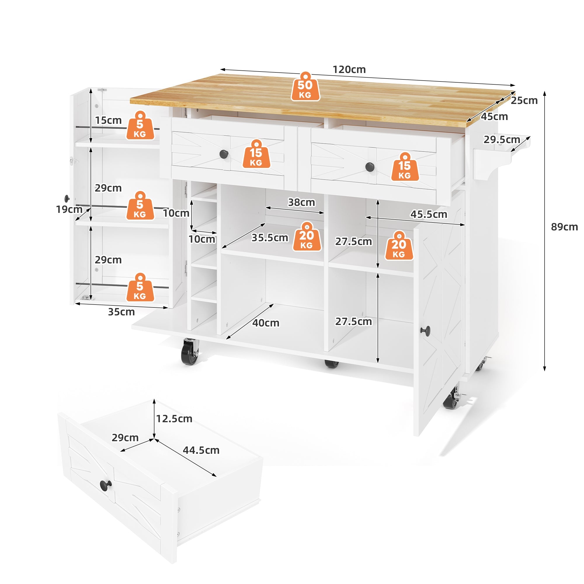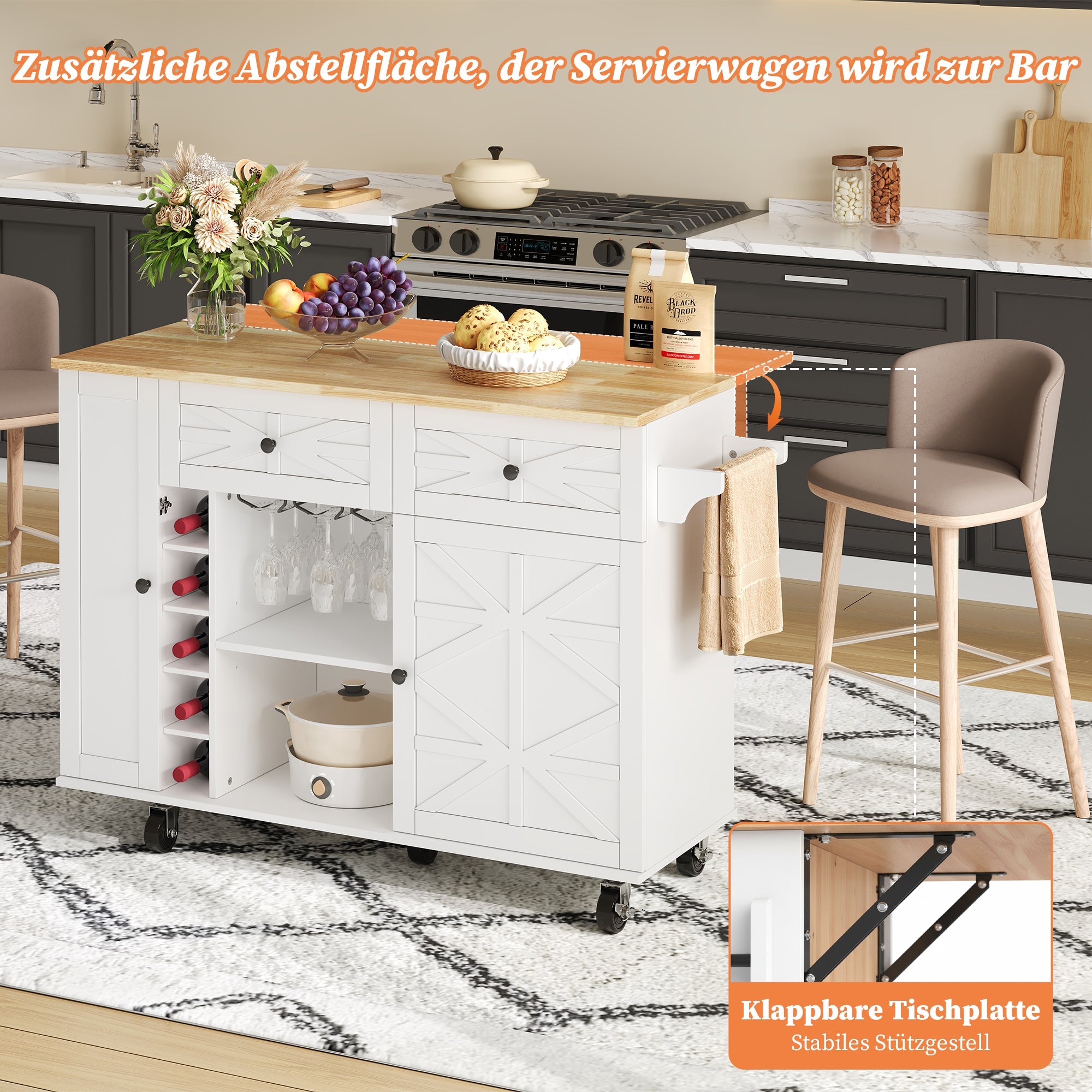 Kitchen Island, Fold-Down Worktop Wine Rack Lockable Casters, White