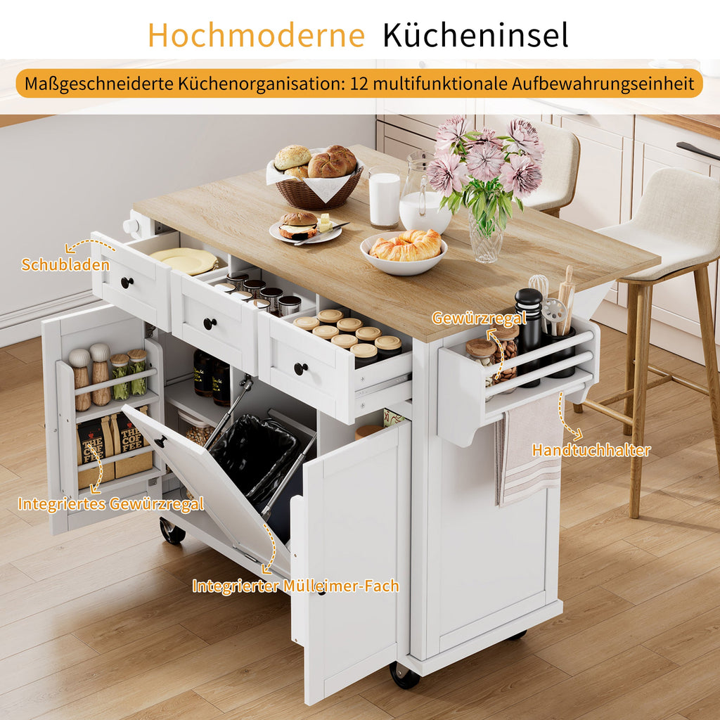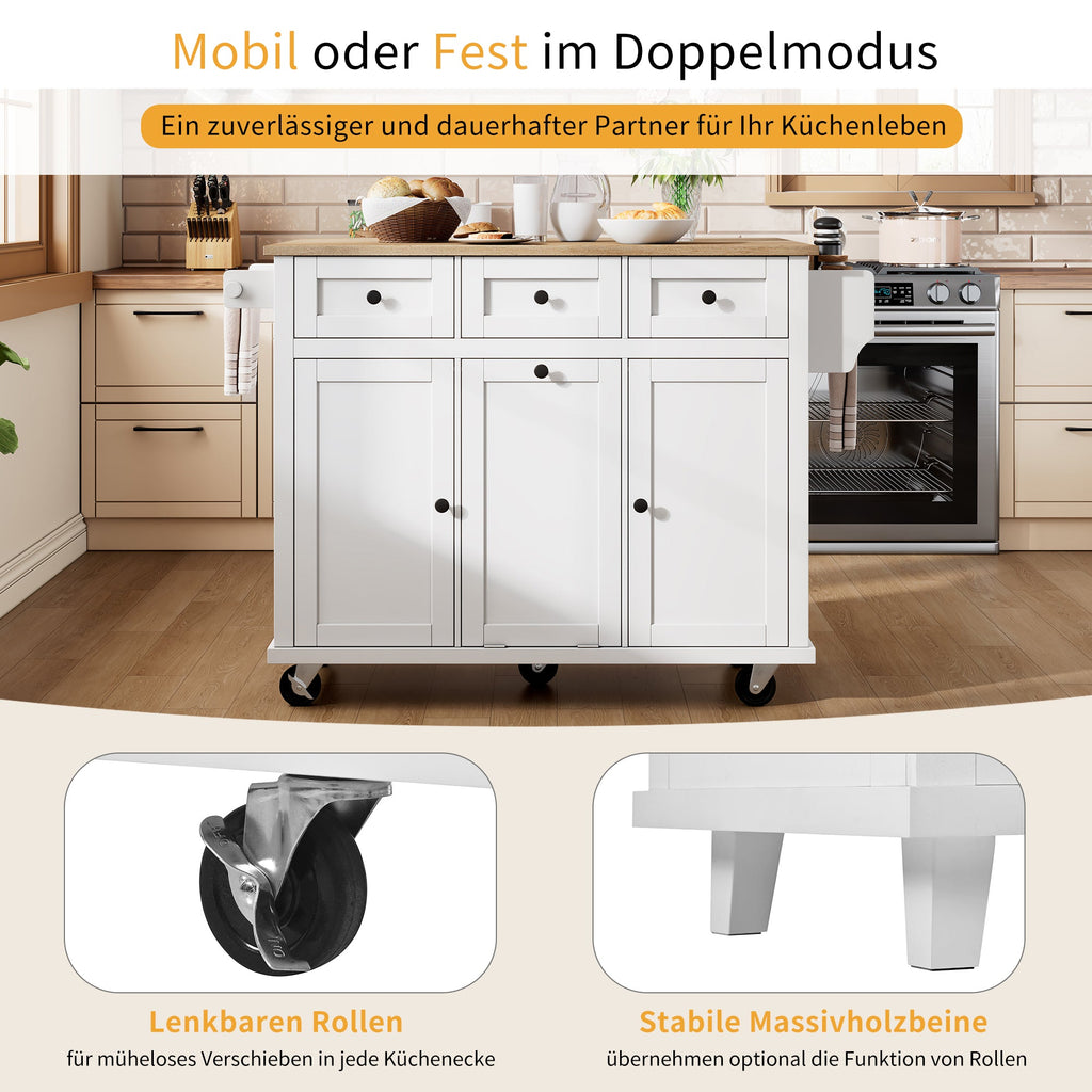 Kitchen Island, Mobile with Wheels, Extendable Dining Area & Drawers, White