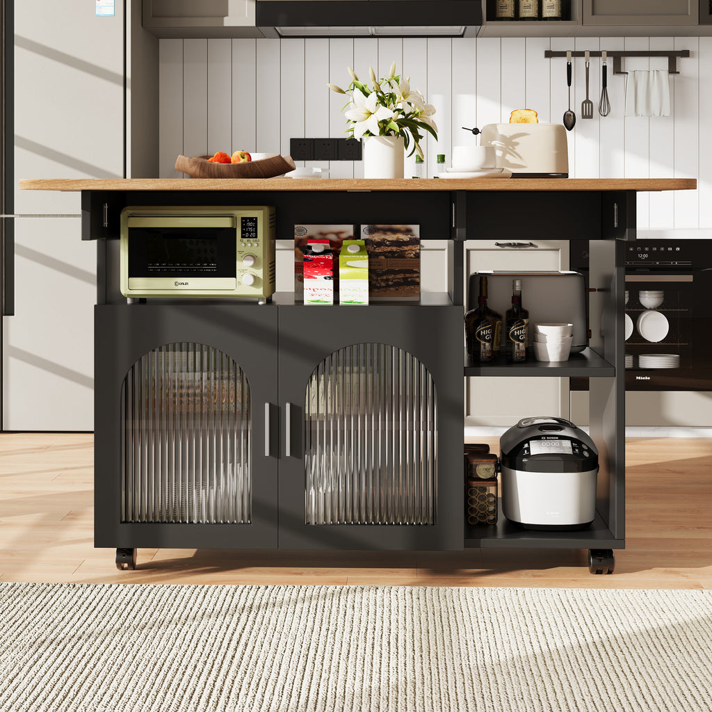 In addition to its eye-catching design, this dining cart is also very practical. The spacious countertop can be used as a temporary workbench or a dining table, while the storage space underneath accommodates a variety of kitchen utensils and appliances, such as a coffee maker, toaster, and more, making your kitchen more tidy and organized. The open shelves and glass-door cabinets beneath the dining cart offer flexible storage options, allowing you to sort and arrange items according to your needs, significantly improving space utilization.
