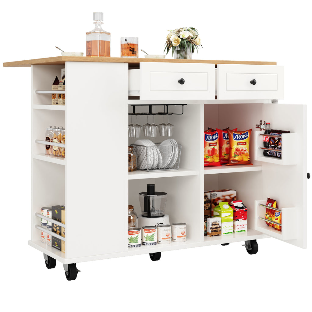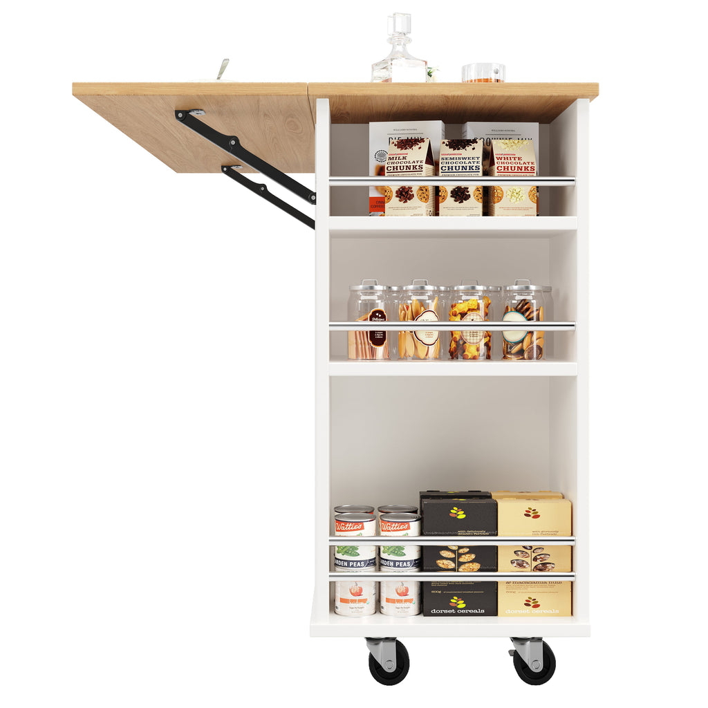 Practical Multi-Layer Side Shelves: The multi-layer design of the side shelf further expands storage space and provides convenient access to some frequently used items, such as cling film, kitchen towels, and spice bottles. The position of the side shelves is sensibly designed so that they do not detract from the overall appearance of the island, yet make optimal use of space and increase storage convenience.