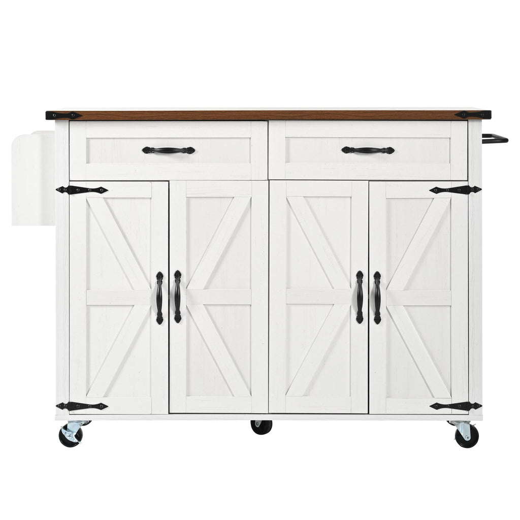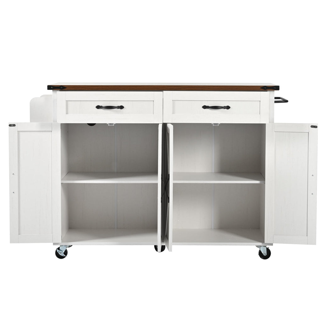 For convenient storage, this food cart features shelves for drinks, liquor, or spice jars on one side and a towel rack on the other. It also includes two cabinets with doors and two drawers for versatile storage options.