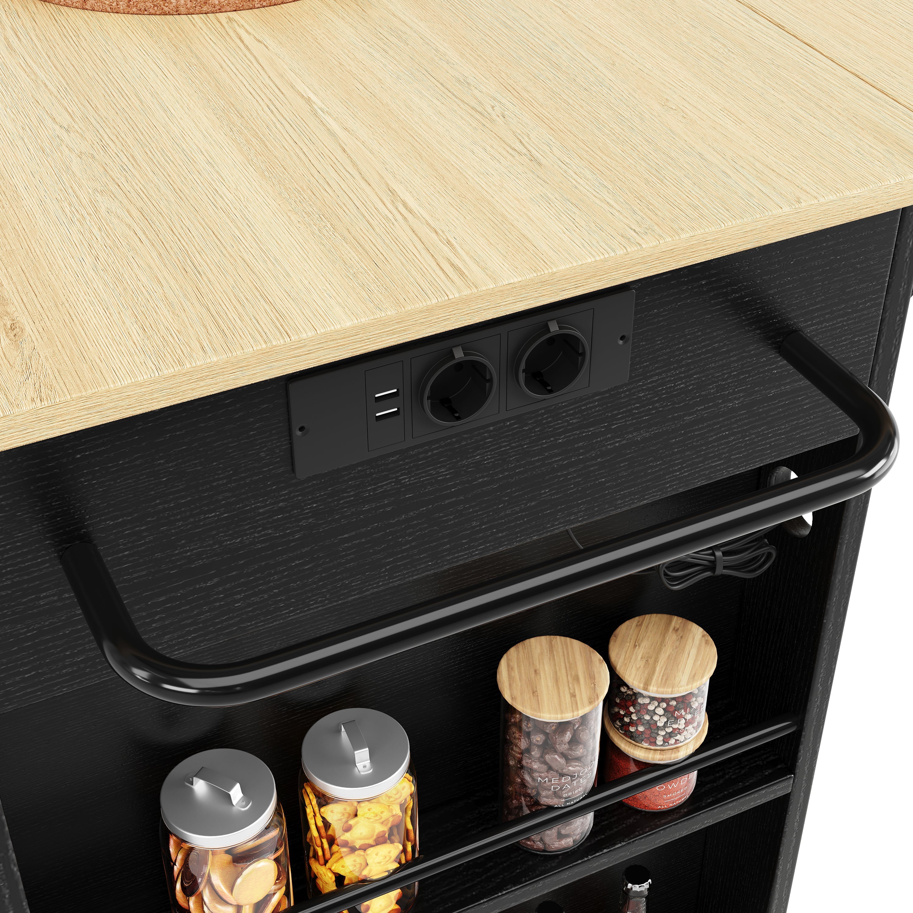 Kitchen Island, Serving Cart with Power Strip, Black
