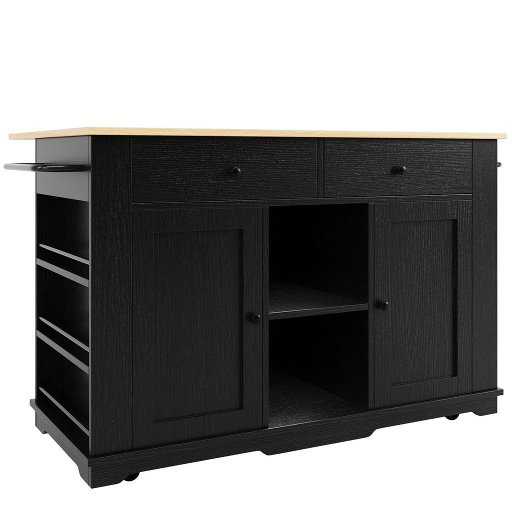 Equipped with shelves and towel racks on both sides, this kitchen island offers extremely practical storage space. The storage compartments can be used to store spices, cutlery, or other utensils, while the towel racks make it easy to hang cleaning cloths and towels.