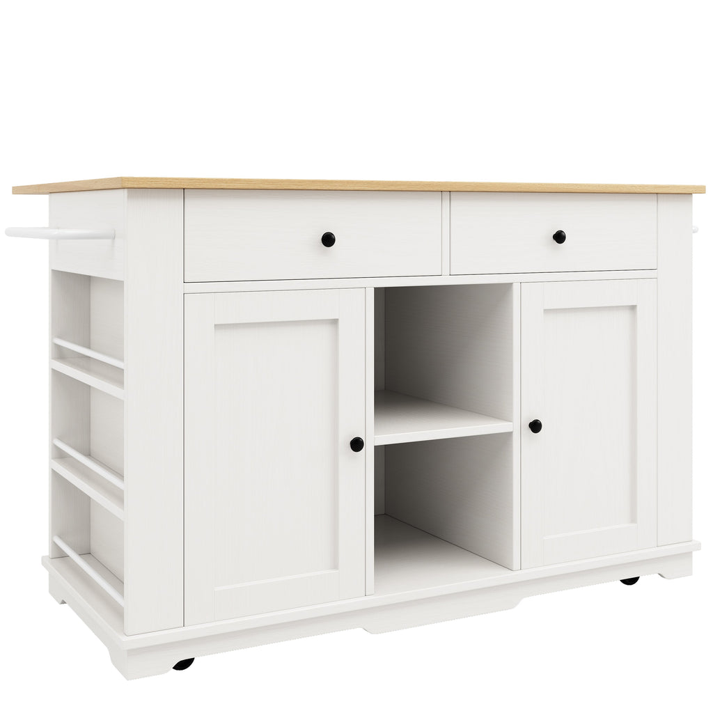 Equipped with shelves and towel racks on both sides, this kitchen island offers extremely practical storage space. The storage compartments can be used to store spices, cutlery, or other utensils, while the towel racks make it easy to hang cleaning cloths and towels.