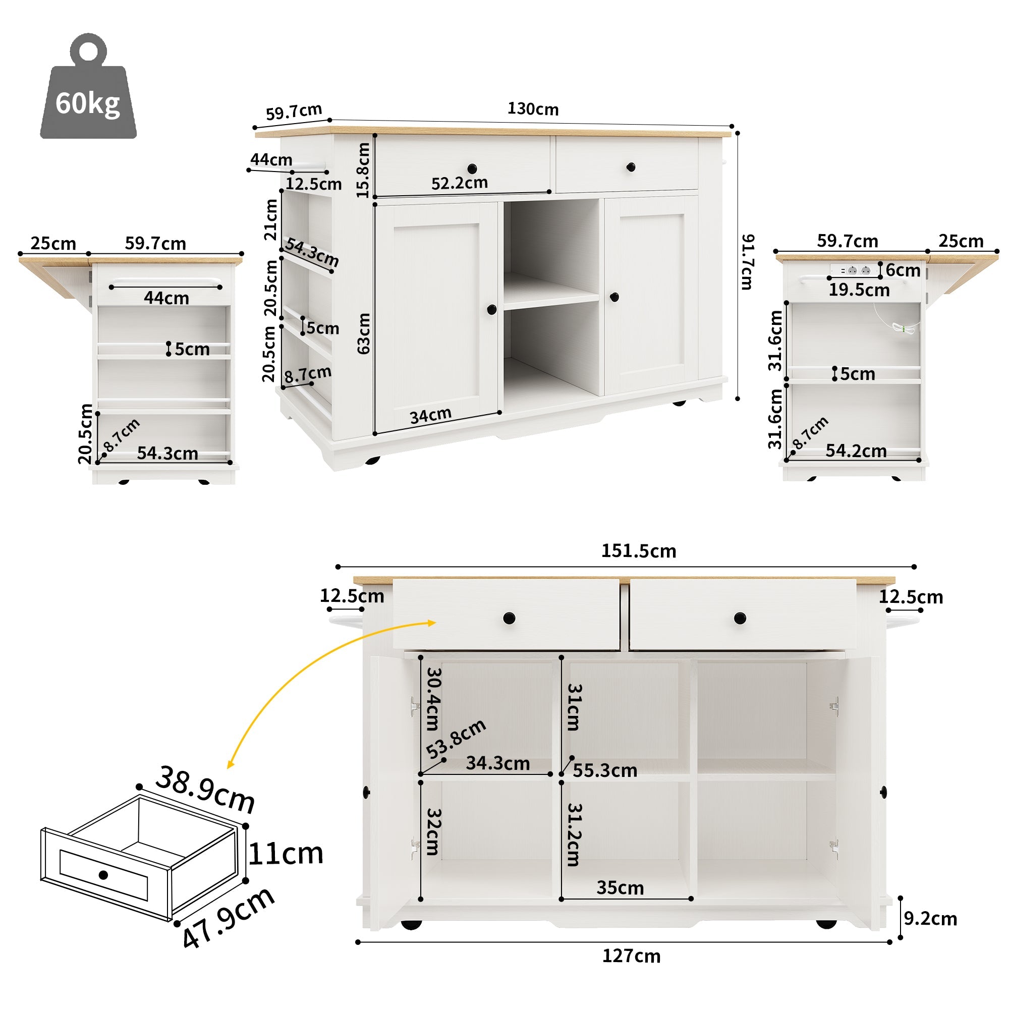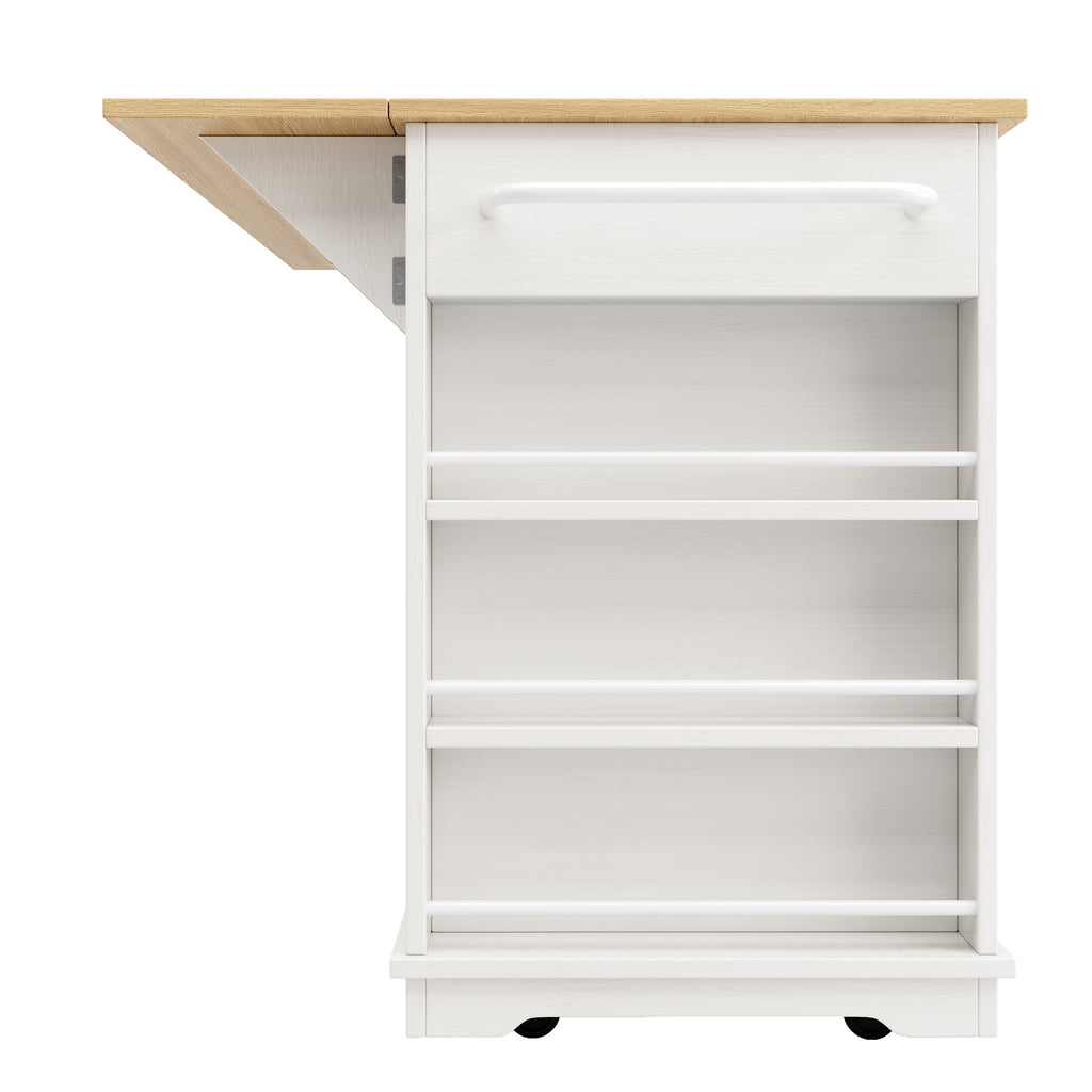 Kitchen Island, Serving Cart with Power Strip & Wood Grain, White