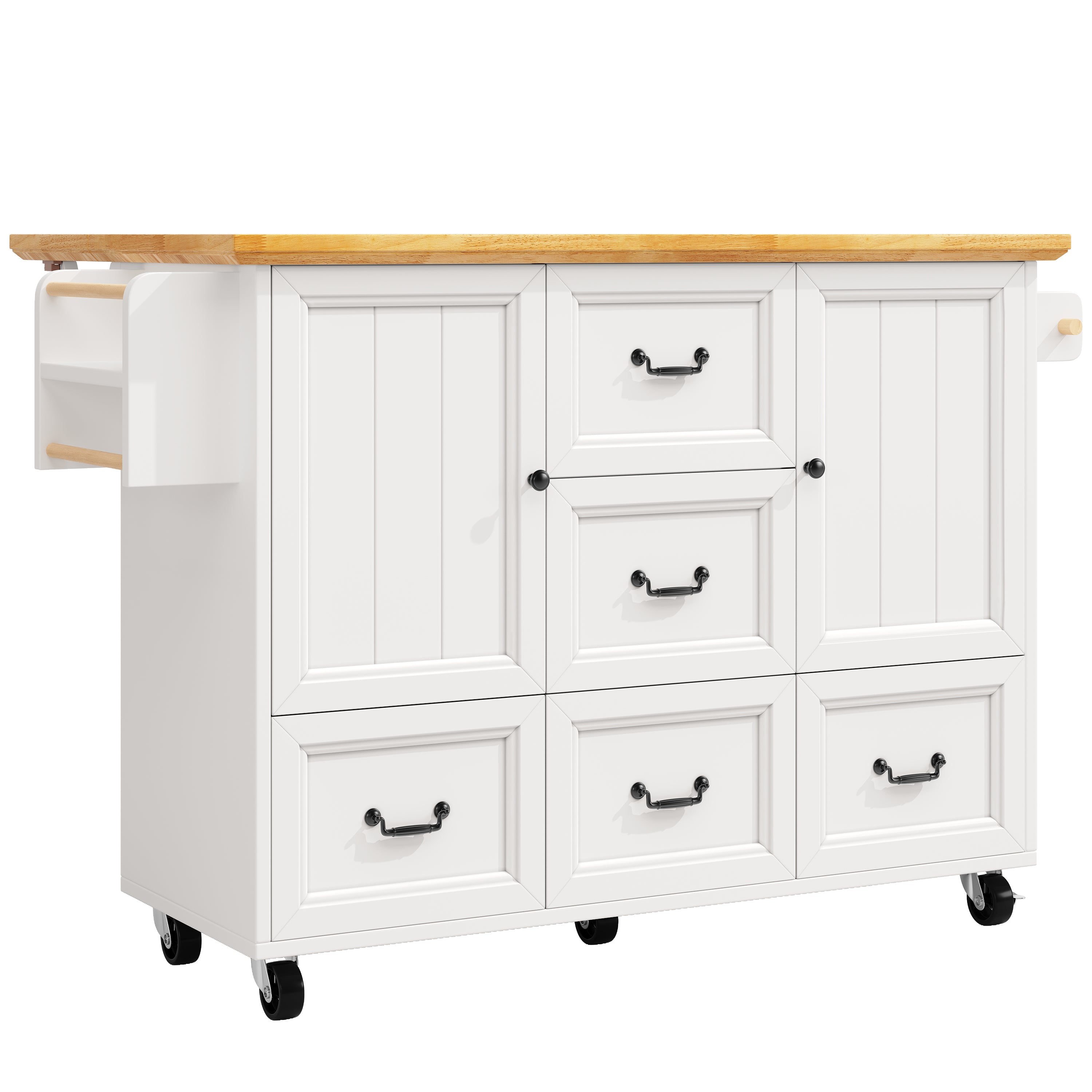This kitchen island features three-tier drawers for comprehensive storage, two doors with separate compartments, and adjustable shelves. For added convenience, towel rails and spice racks are included on both sides.