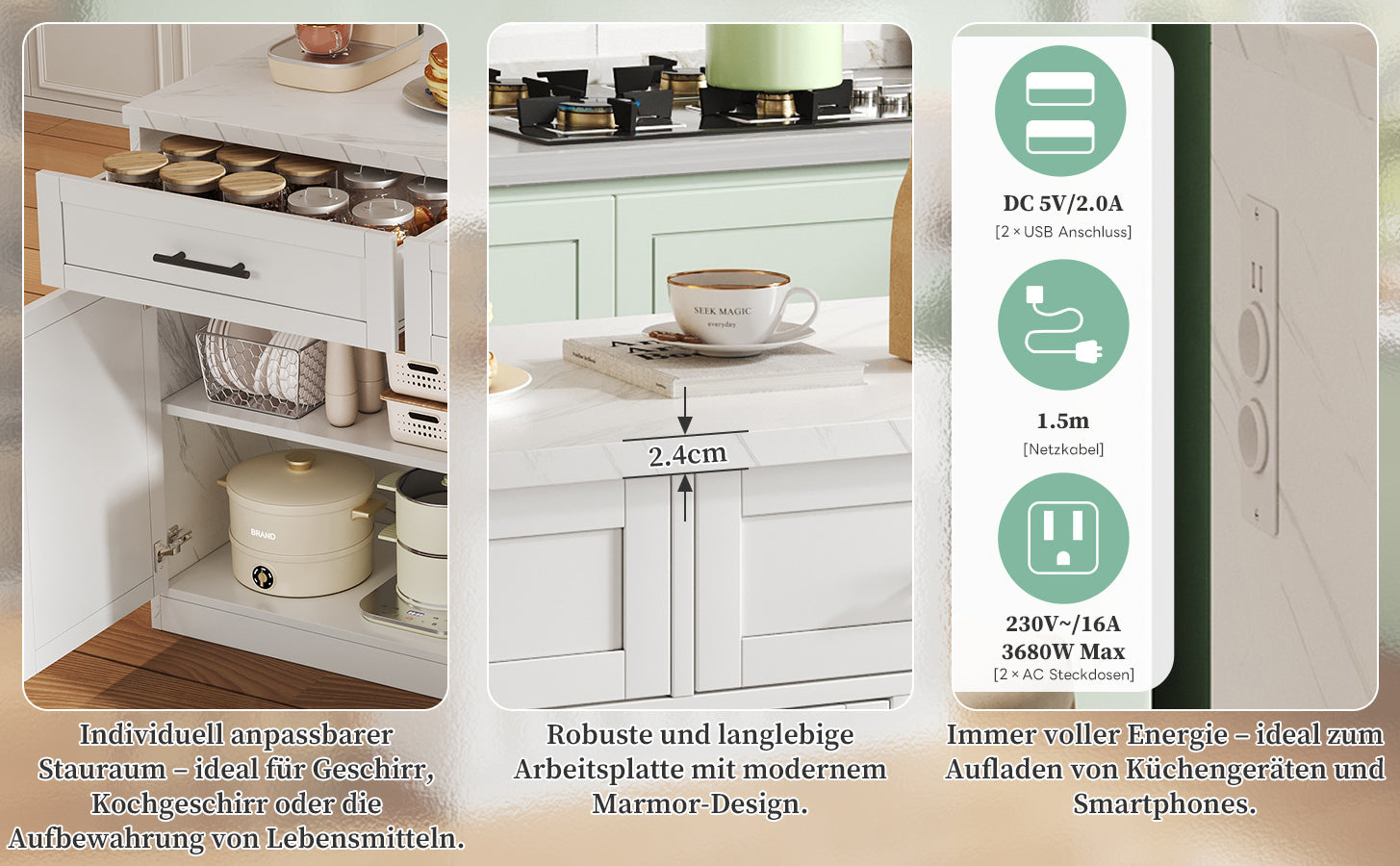 Kitchen Island with Power Outlets USB Adjustable Shelves, White