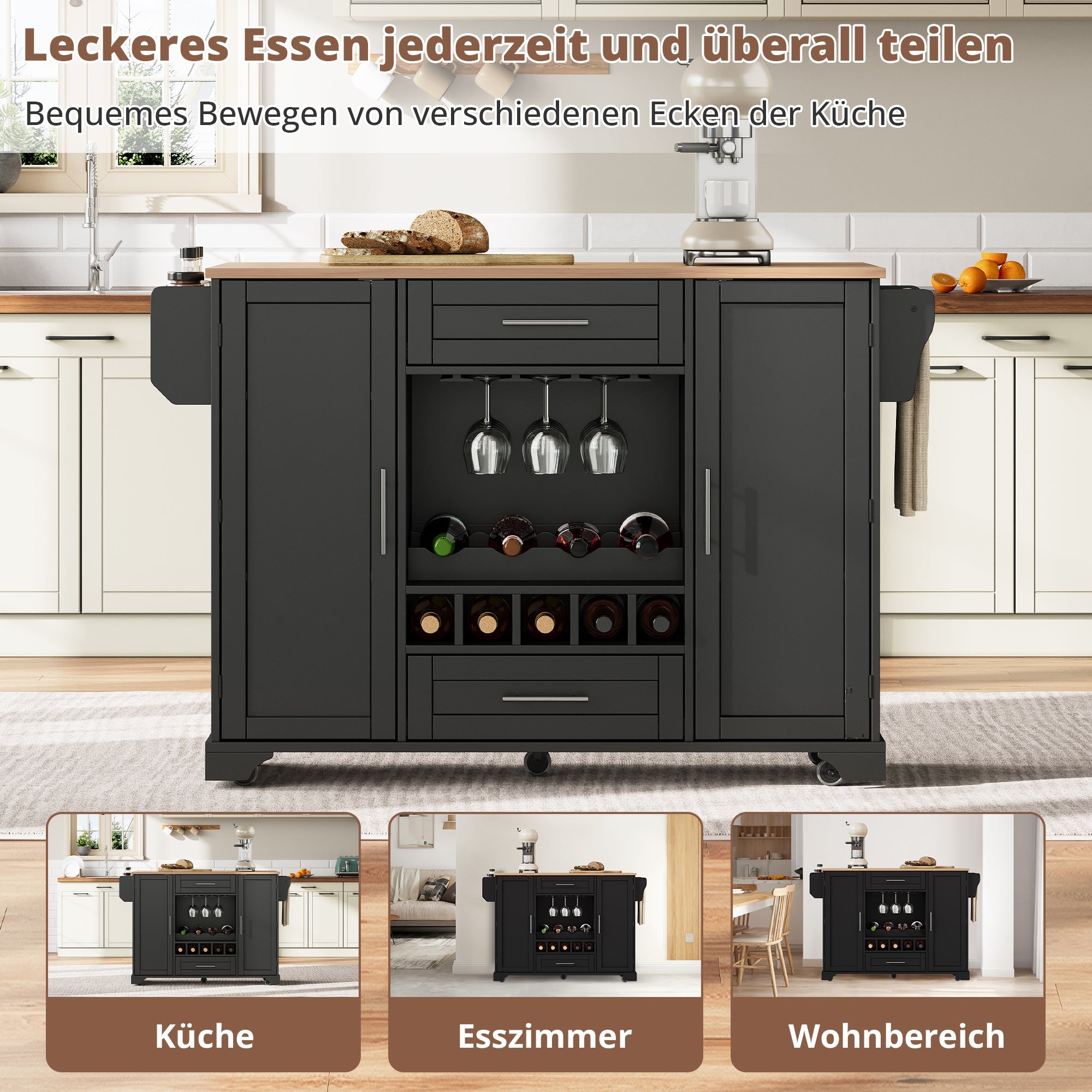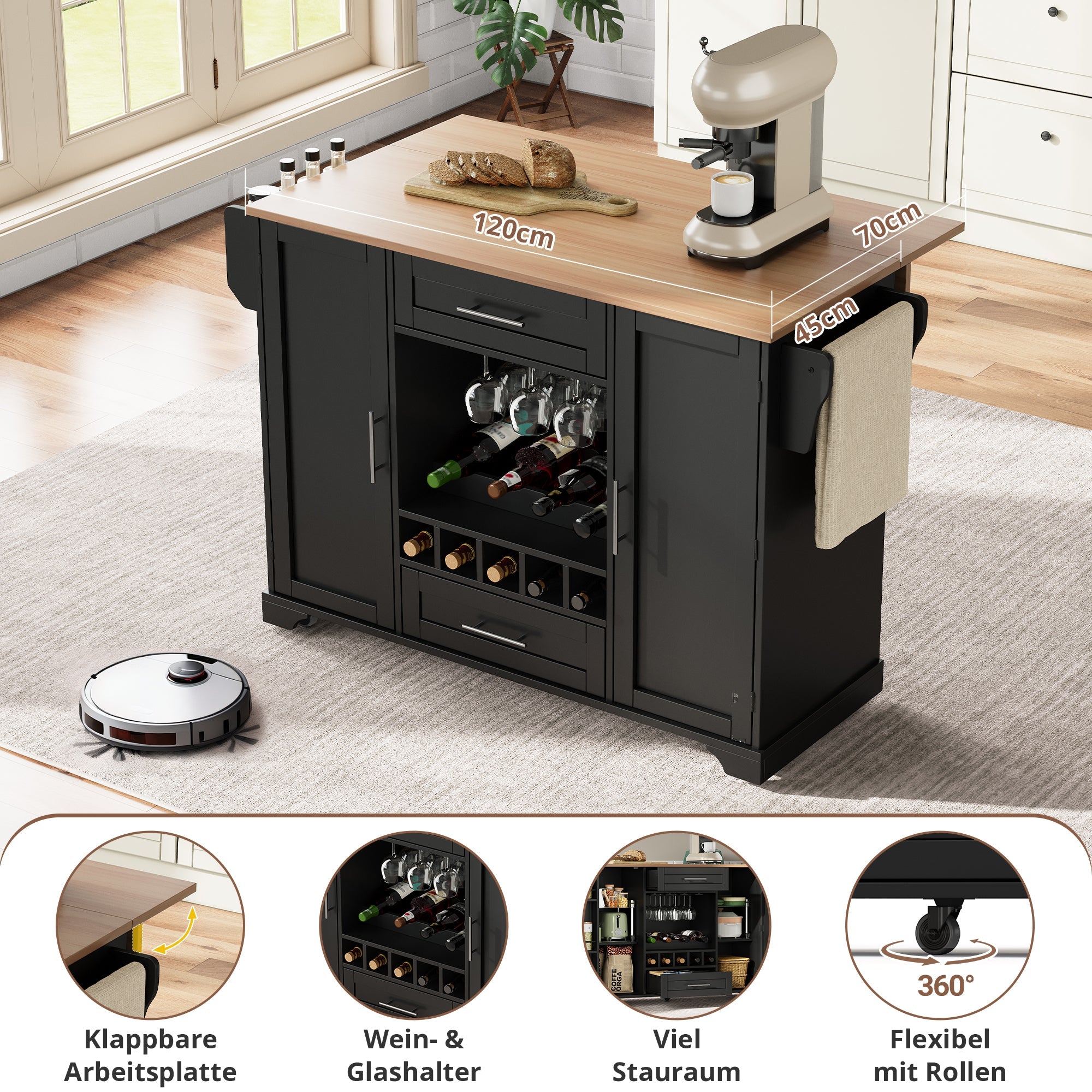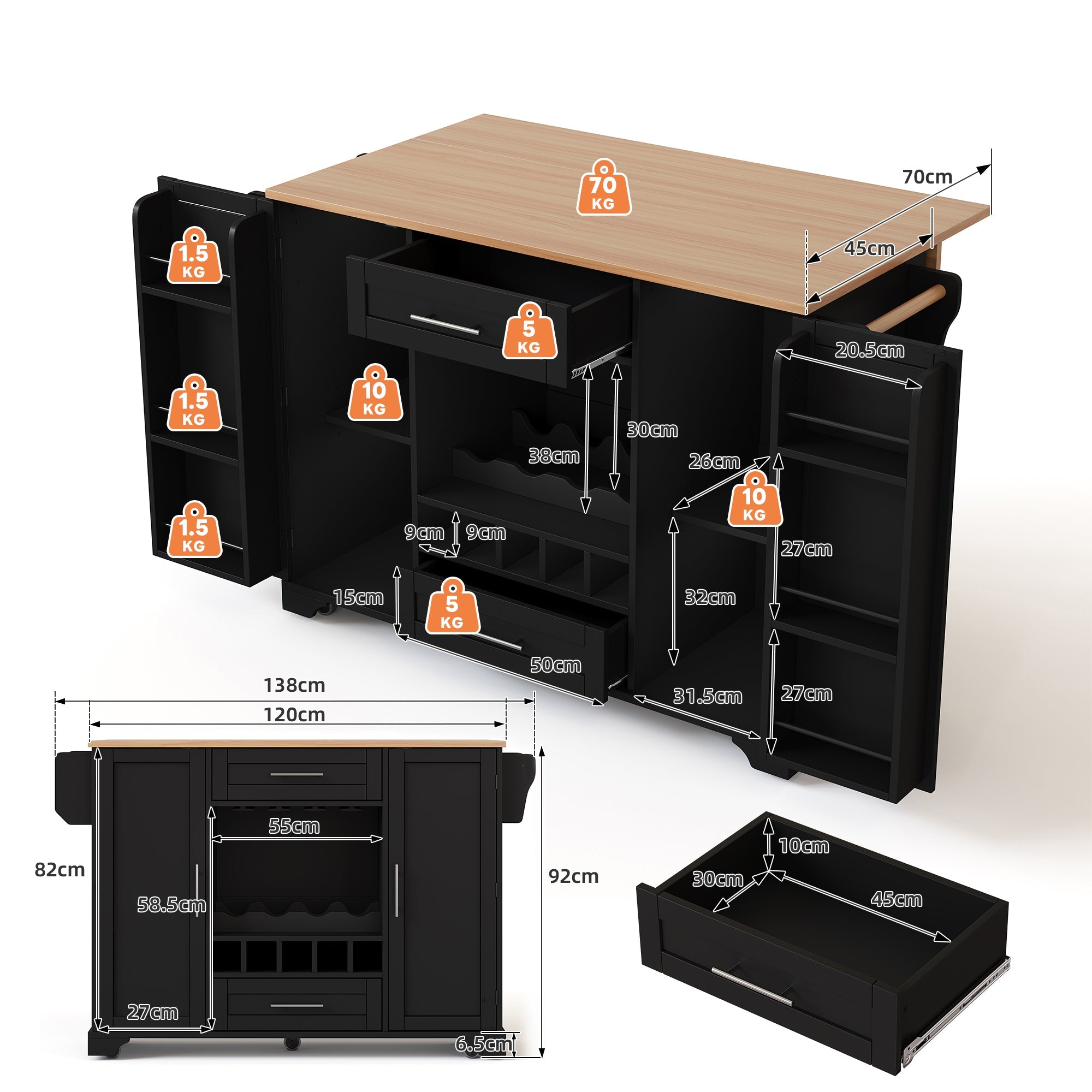 Kitchen Trolley Fold-Down Worktop Wine Rack Spice Rack Black