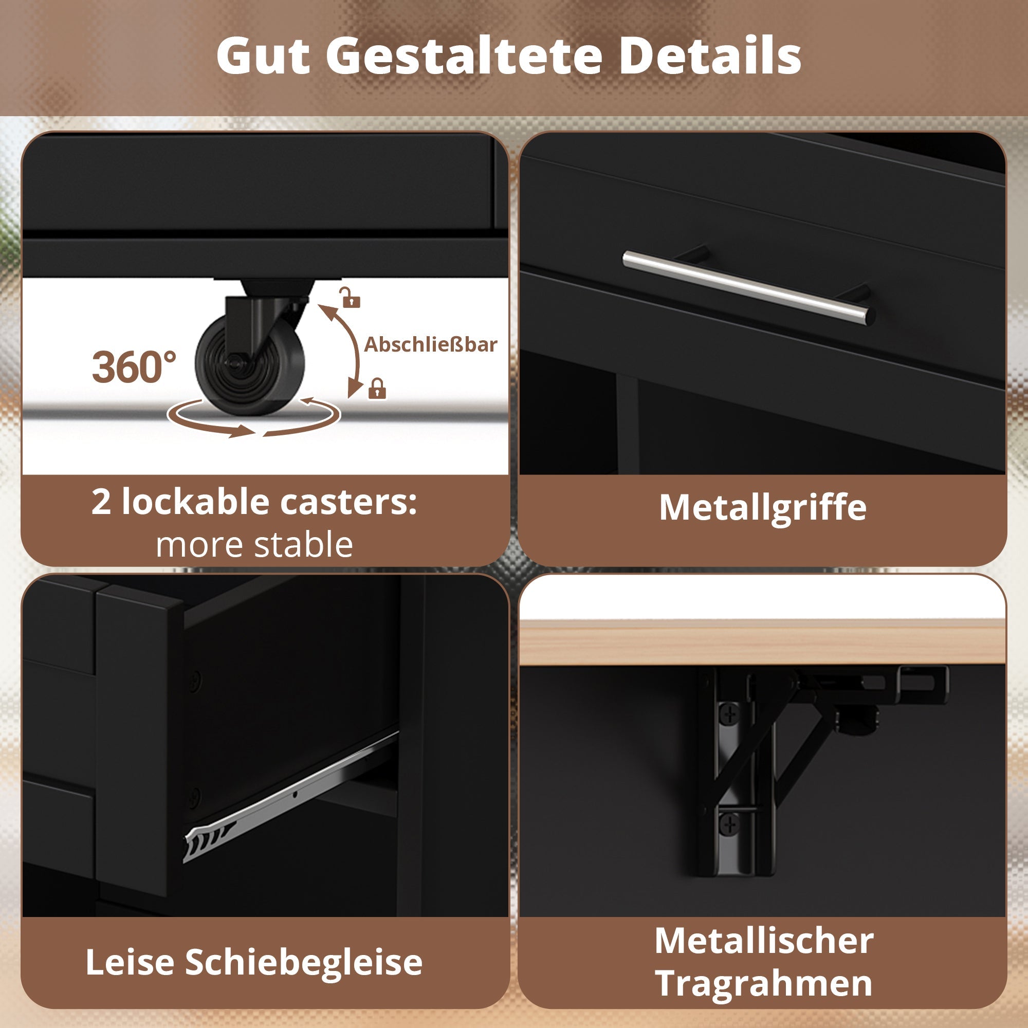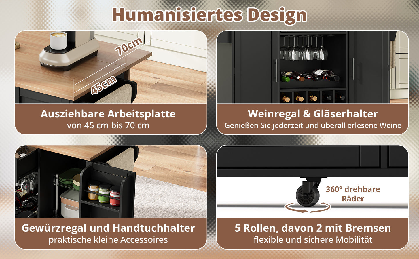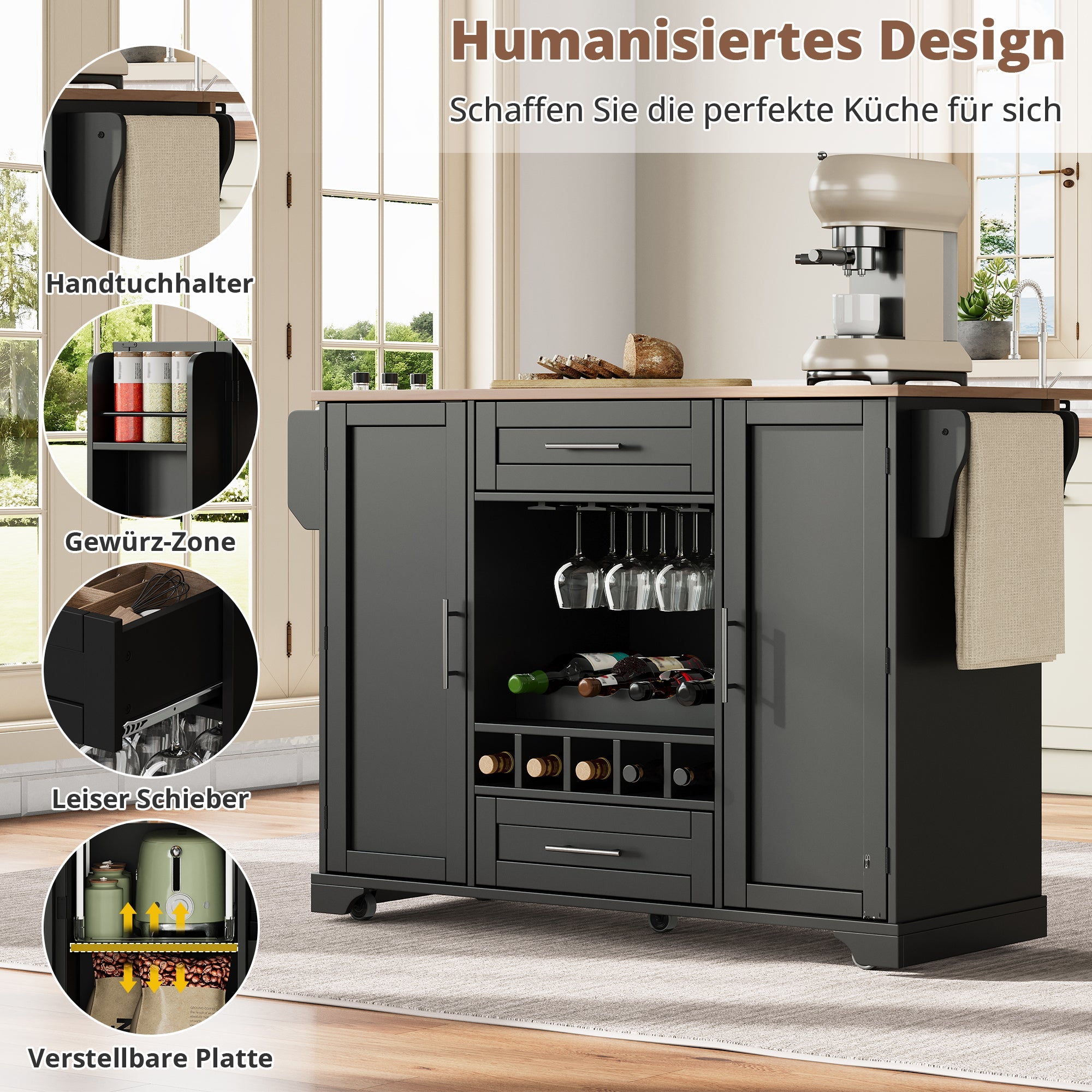 Kitchen Trolley Fold-Down Worktop Wine Rack Spice Rack Black