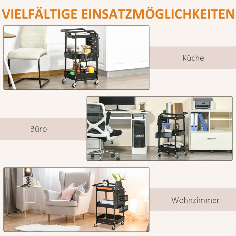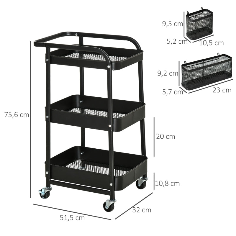 Kitchen Trolley with Perforated Board & Towel Holder, Storage Baskets, Black