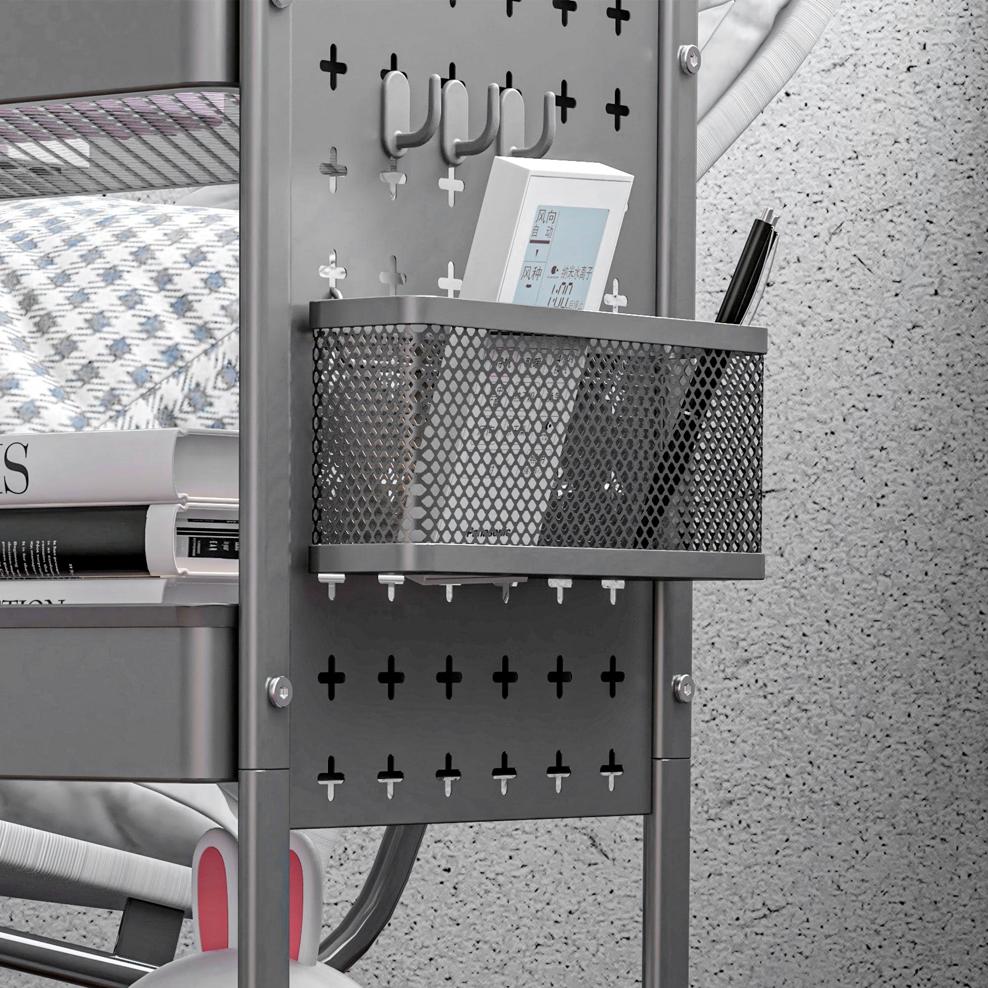 This utility cart offers versatile storage options with three large mesh baskets for everyday necessities, optimizing space utilization and organizing clutter. Two small hanging baskets and six hooks are removable for easy access to small items.