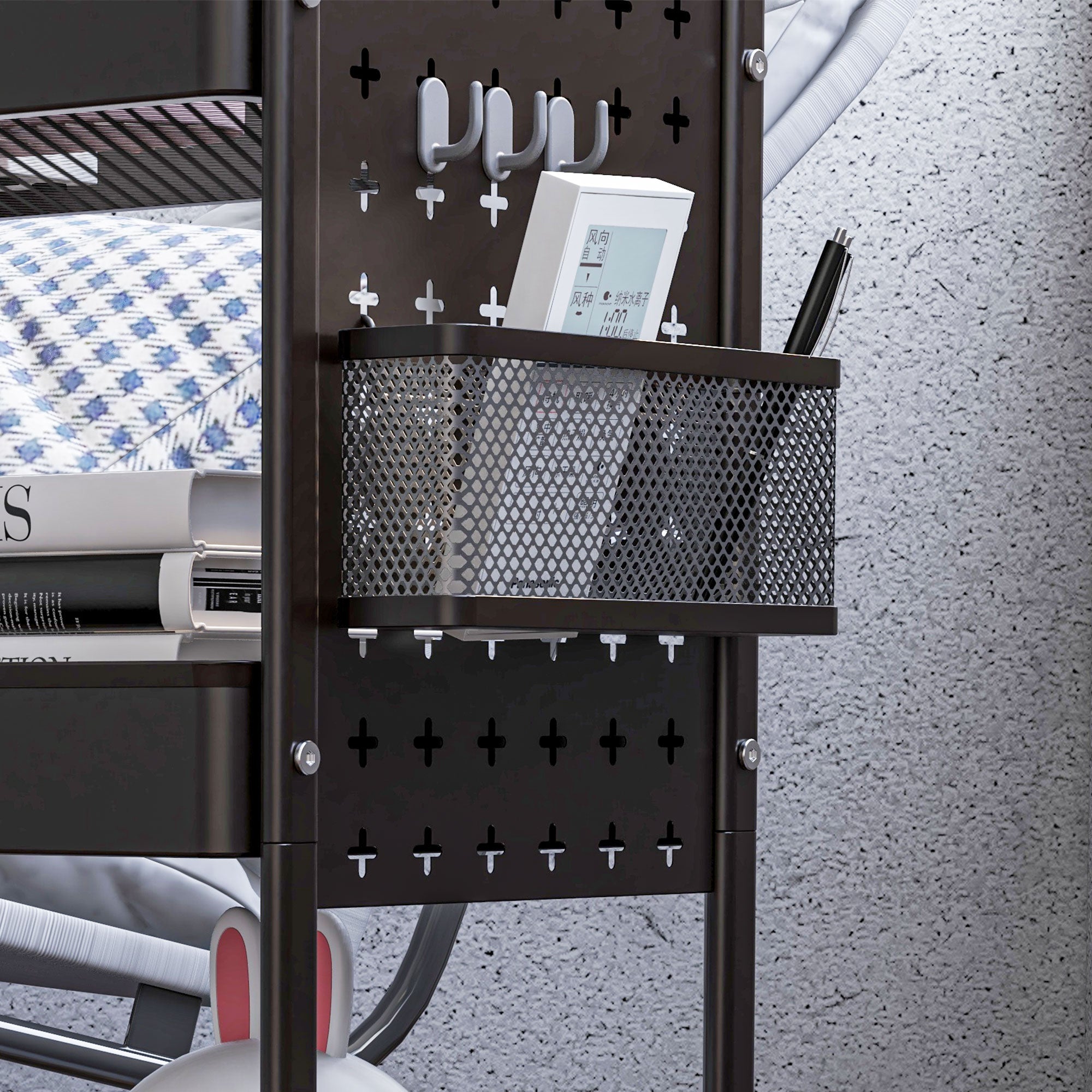 This versatile utility cart offers excellent storage with three large mesh baskets, providing ample space for everyday necessities and helping to organize clutter. Additionally, two small hanging baskets and six hooks are removable for easy access to smaller items.