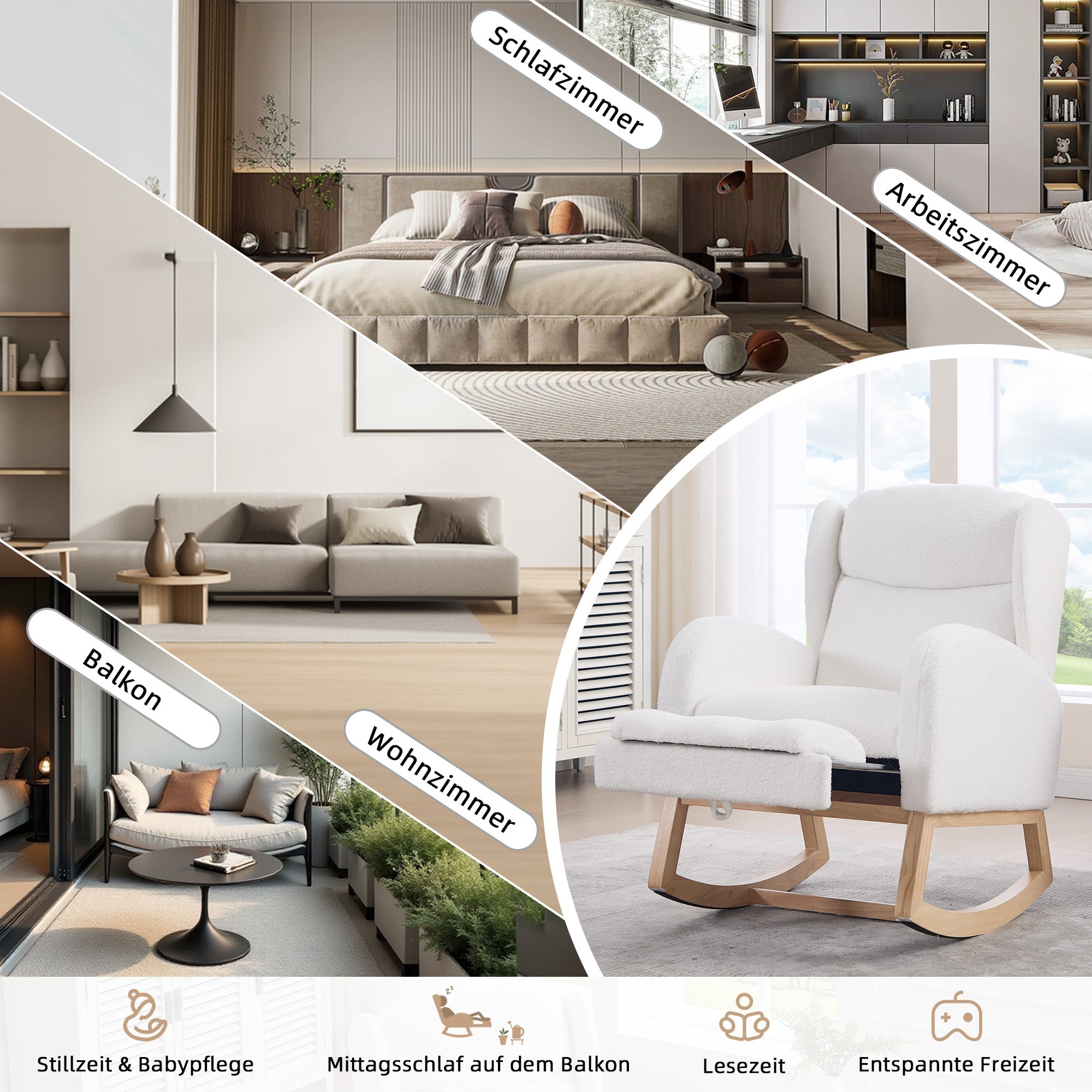 Product Composition: Teddy fabric + Foam padding + Wooden frame + Wooden rocking legs + Sliding footrest + Padded cover + Floor protection and insulation layer