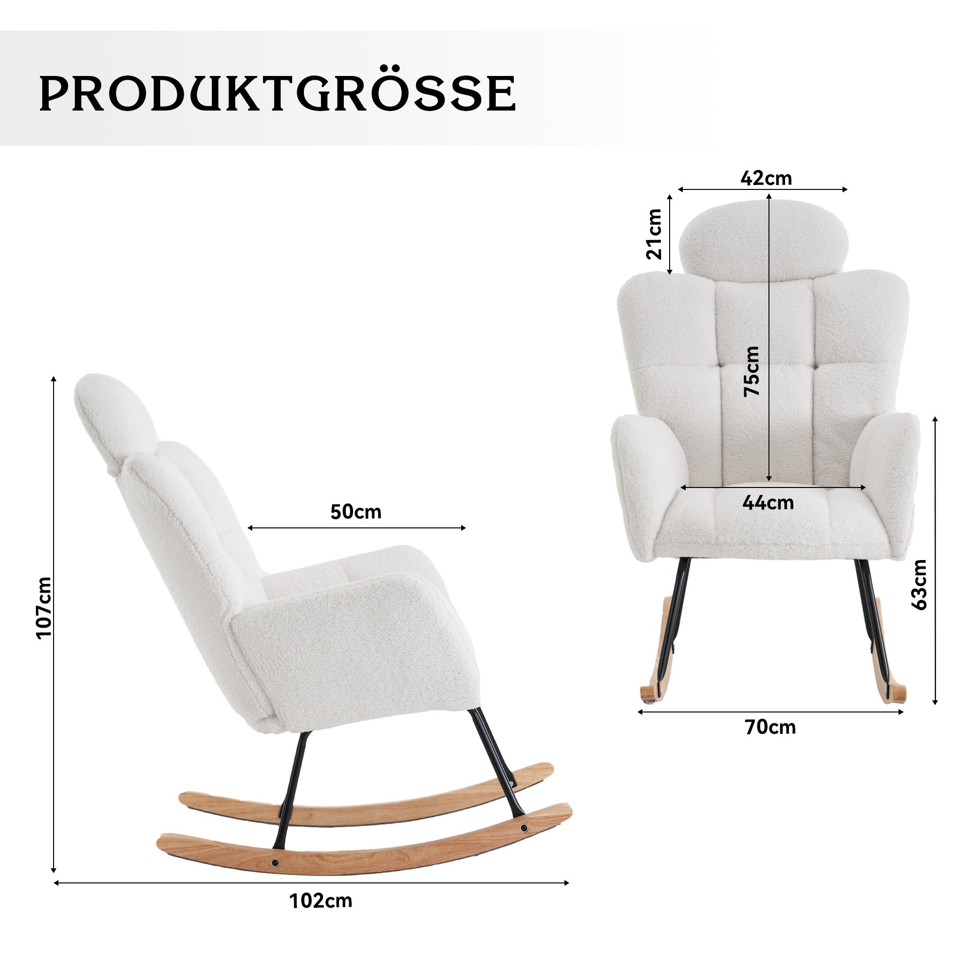 Product Composition: Soft plush material, foam padding, wooden frame, black painted metal base, wooden rocker legs, floor protection, and headrest.