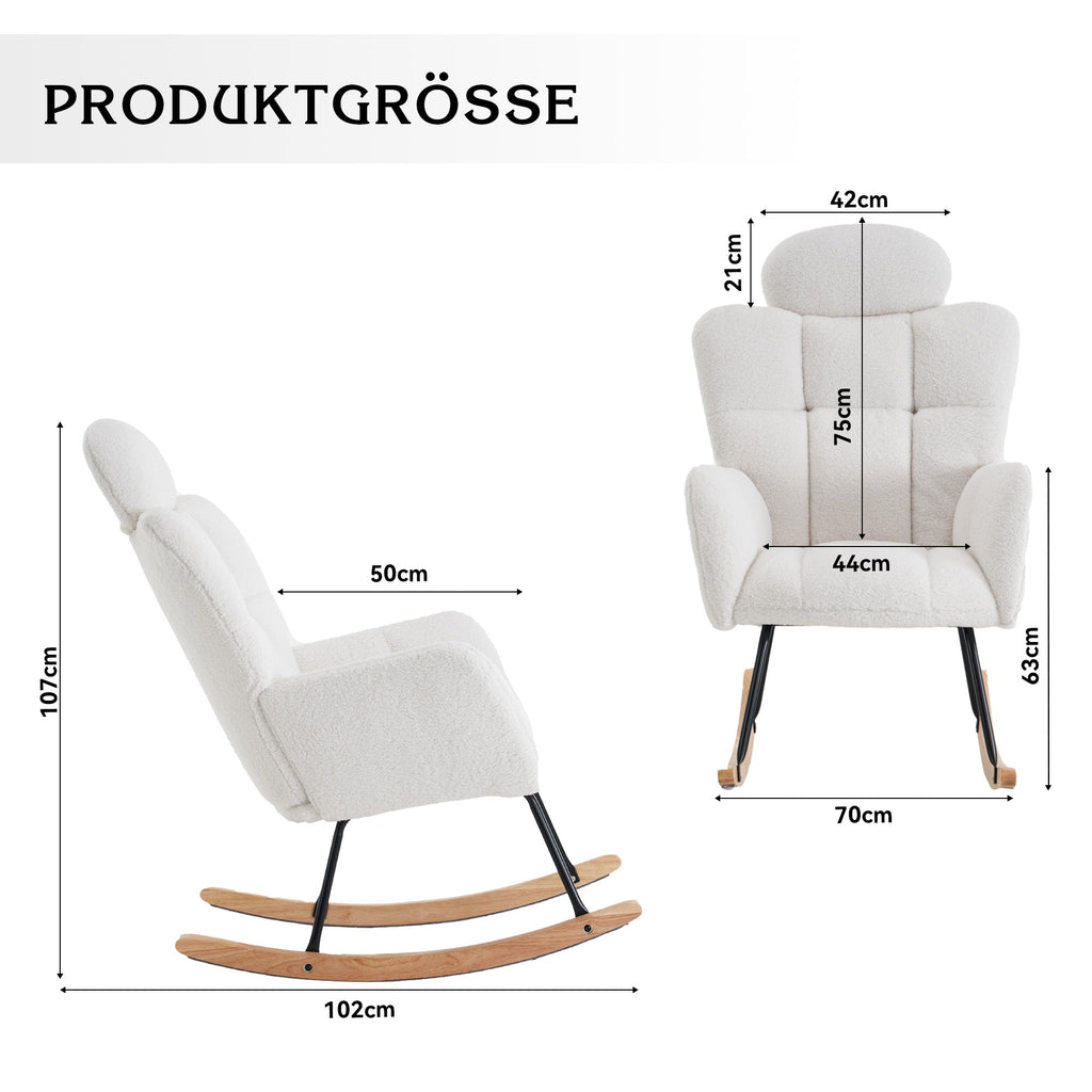Our rocking chair offers durability and comfort with double stitching to ensure a strong and lasting design. Crafted from soft teddy fabric and filled with foam, it features a sturdy wooden frame and a black-painted metal base for exceptional comfort. Assembly is quick and hassle-free, taking just 15 minutes. The quilted design and thick foam backrest with a headrest provide optimal support. Felt strips on the base ensure quiet rocking motion and protect your floors from scratches. With its clean, minimalist design, this timeless piece blends perfectly with various interior styles, offering a truly relaxing experience. The ergonomic design gently supports your head, neck, and back, relieving muscle tension and inviting you to unwind.