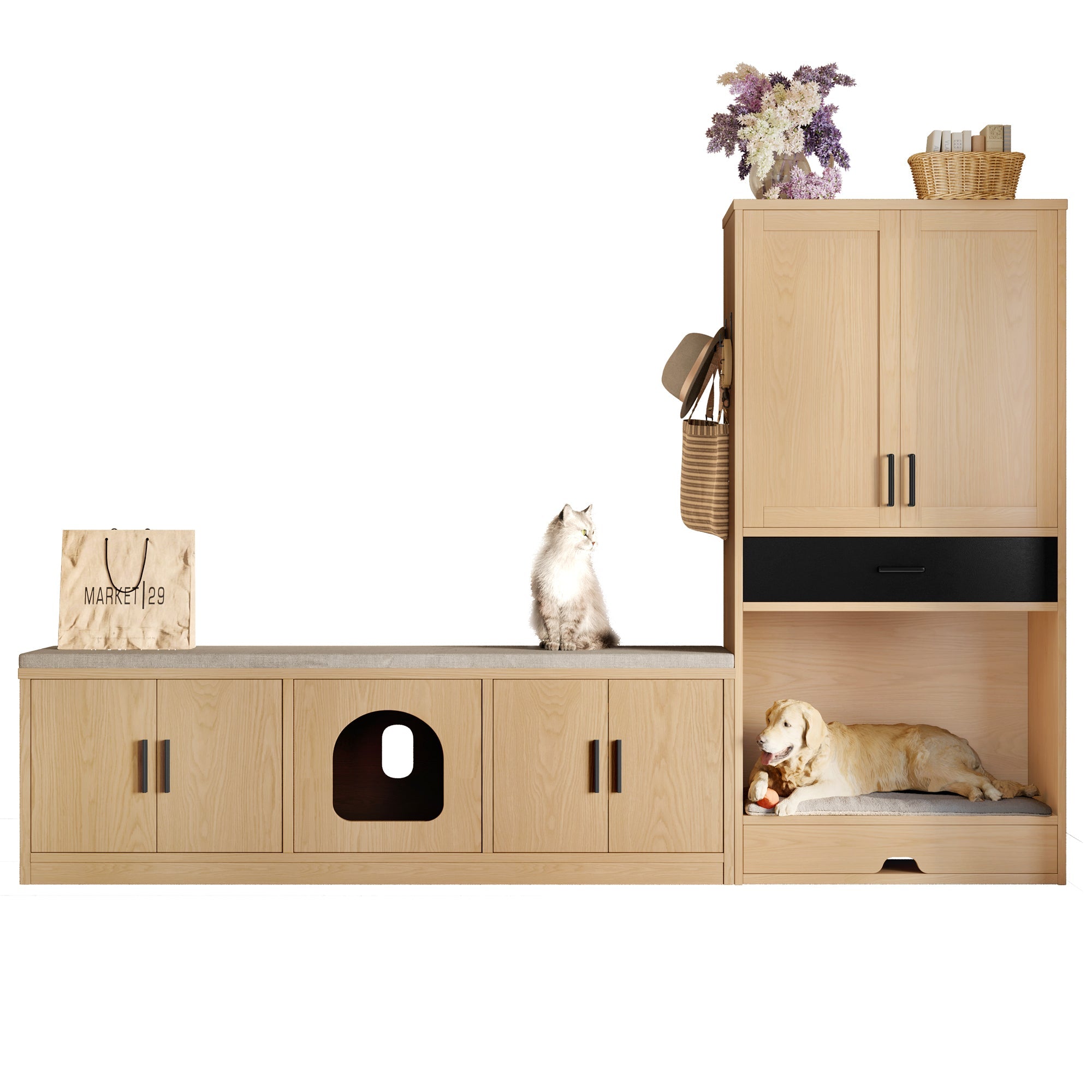 This two-piece pet furniture set combines functionality, style, and a love of animals in one beautifully designed piece. The tall cabinet offers space for dog food, leashes, or clothes and features a cozy dog bed and a pull-out feeding table. Integrated hooks on the side allow for convenient hanging of accessories.