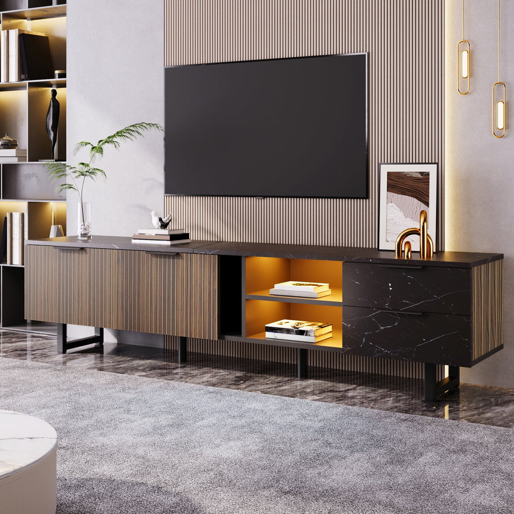 This TV cabinet combines modern aesthetics with natural elements, making it the ideal choice for home decoration and storage. The black marble look adds an elegant atmosphere, while the dark wood grain doors give the design a natural touch. The cabinet is equipped with two doors, two drawers, and two open shelves, offering ample storage space to easily organize household items. In addition, the cabinet features LED lighting that can be adjusted in multiple colors to create a personalized ambiance according to your mood or occasion.