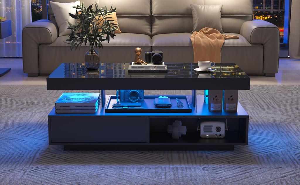 Black High-Gloss Coffee Table with Glass Tops & Drawers