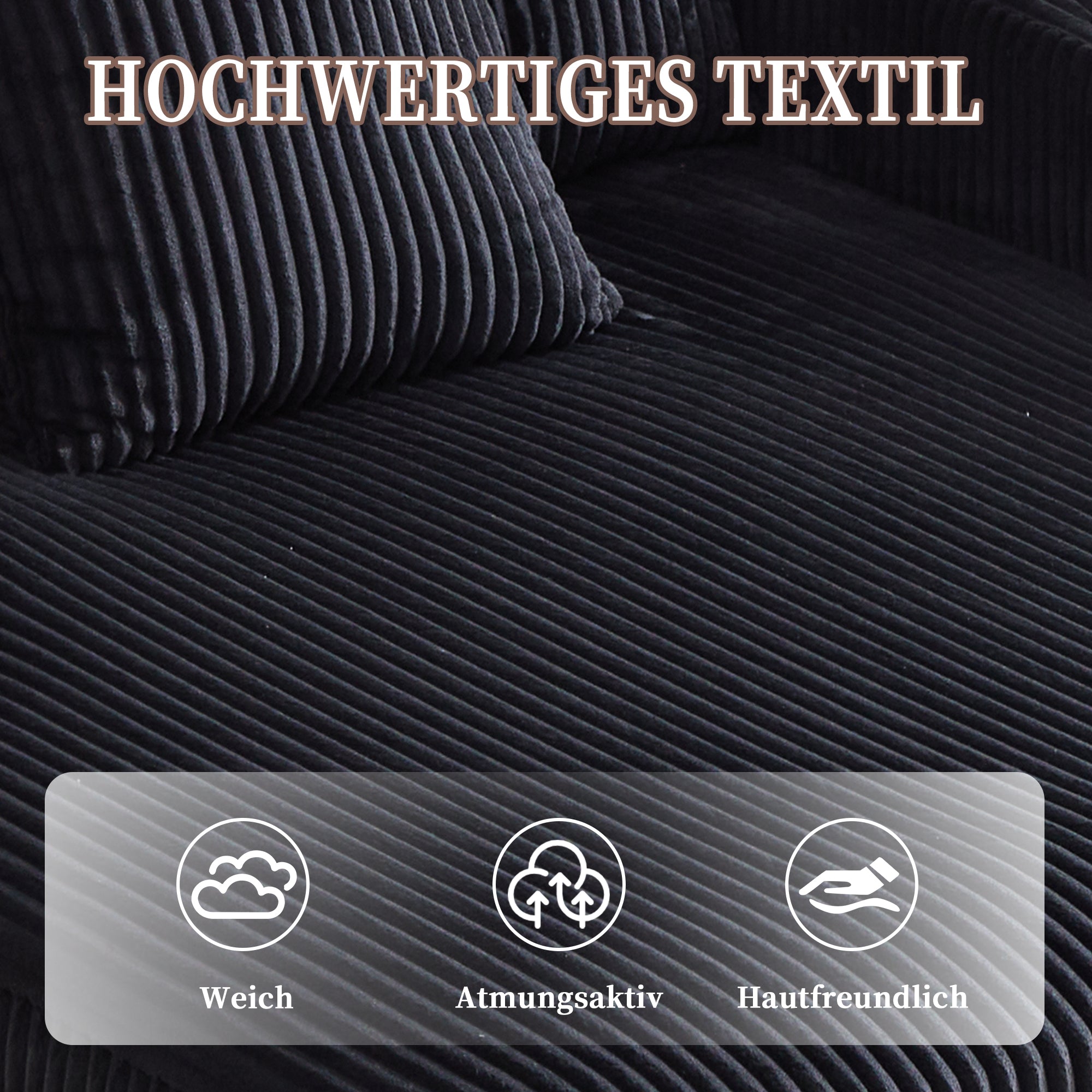 This sturdy indoor recliner is carefully crafted from durable corduroy fabric and a solid wood frame, supporting up to 350 kg. Equipped with three soft cushions and high-resilient foam padding with an embedded spring system, it ensures long-lasting comfort and is an excellent choice for your furniture.