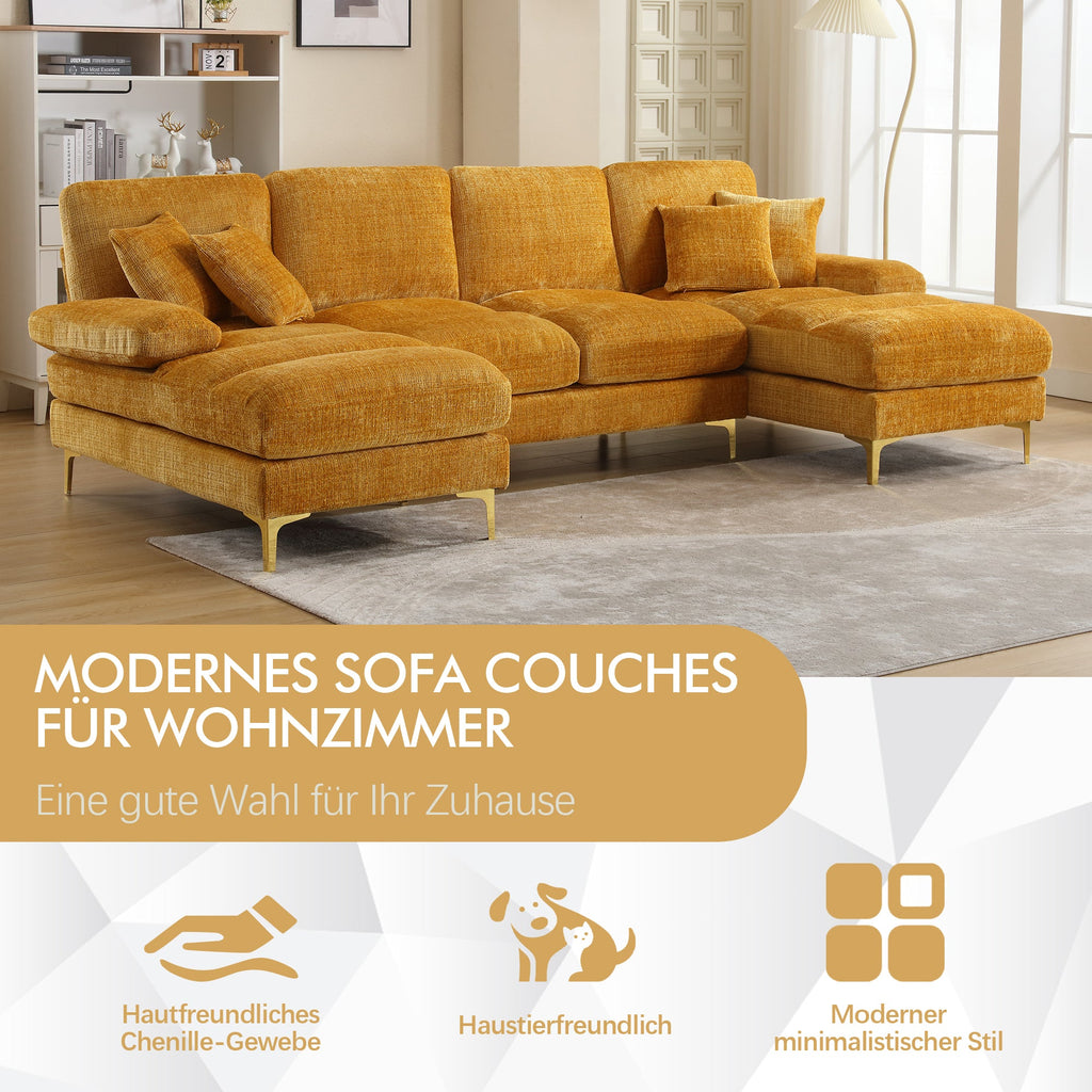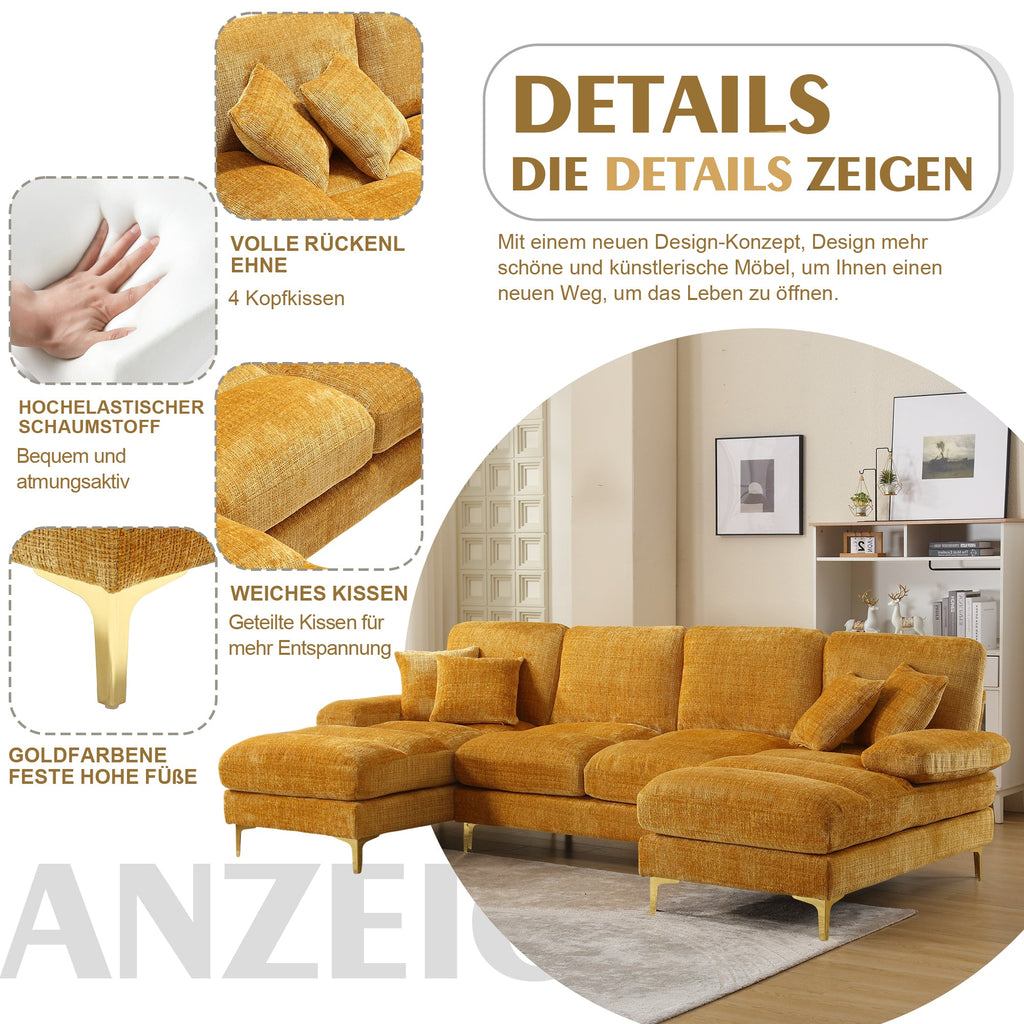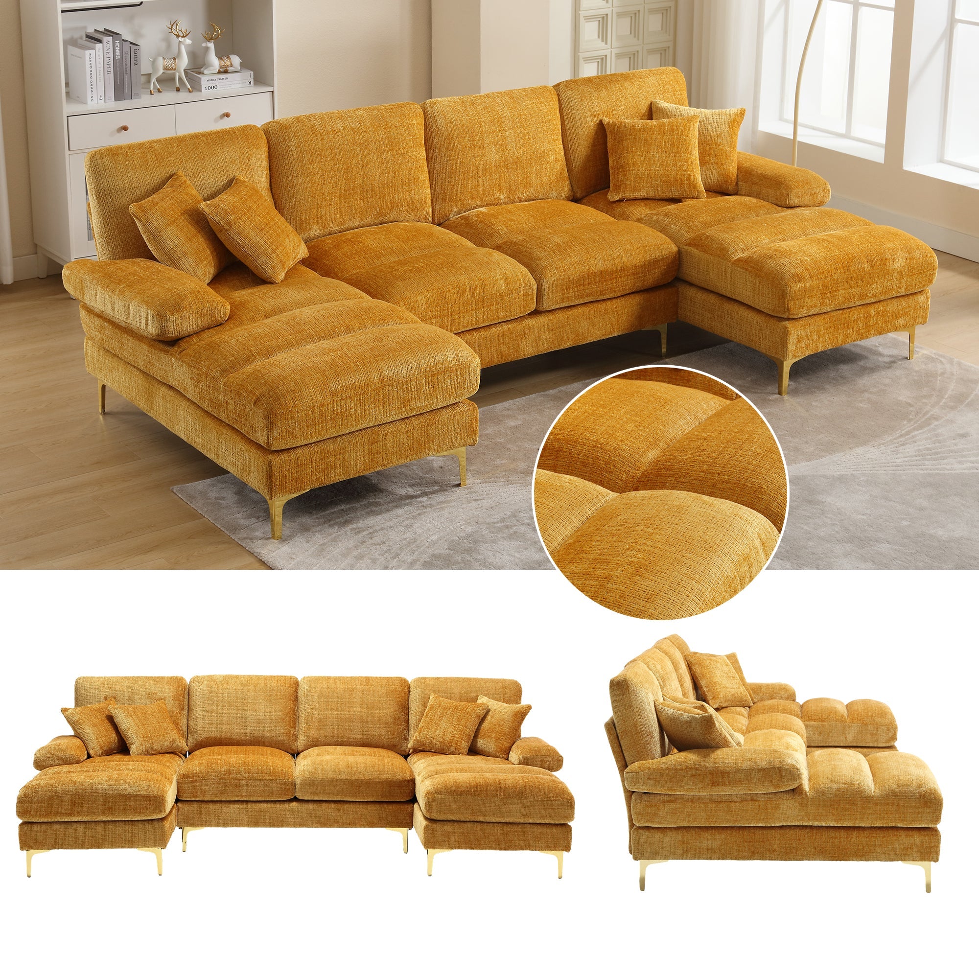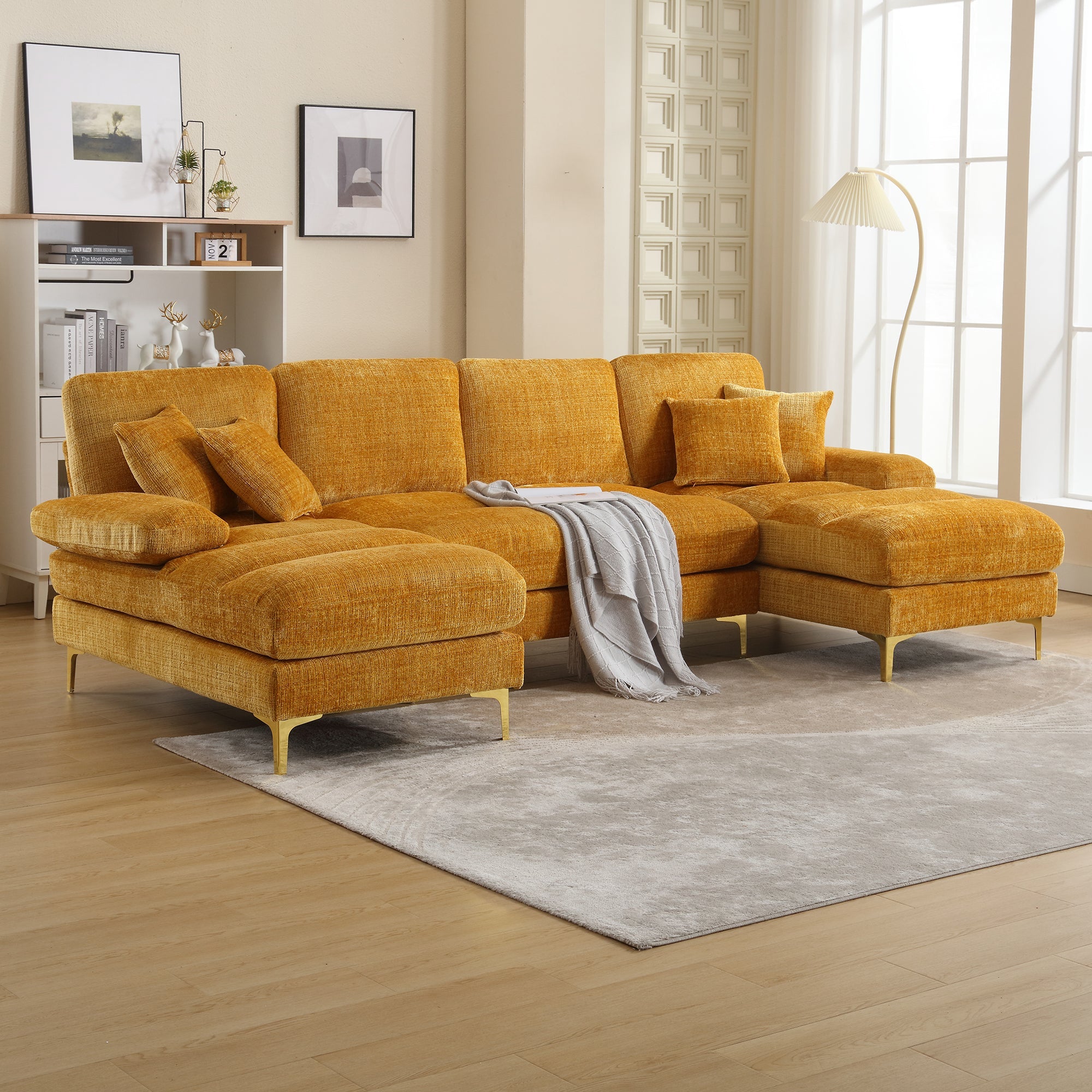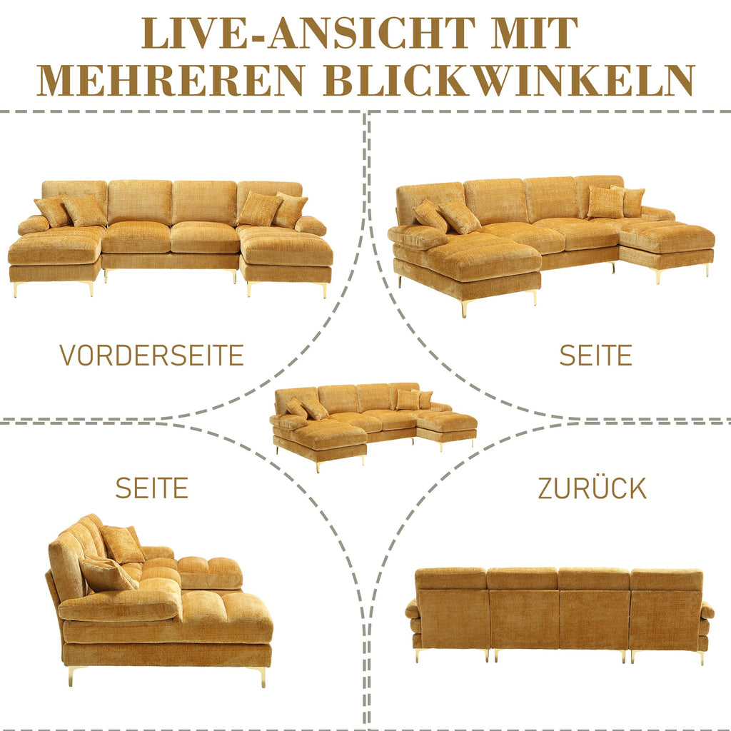 The U-shaped layout makes this sofa ideal for family gatherings, movie nights, or simply relaxing. It is perfect for a variety of rooms. The modern and stylish appearance, a combination of gold metal legs and a sleek, modern design, adds a touch of elegance and style to your living space.