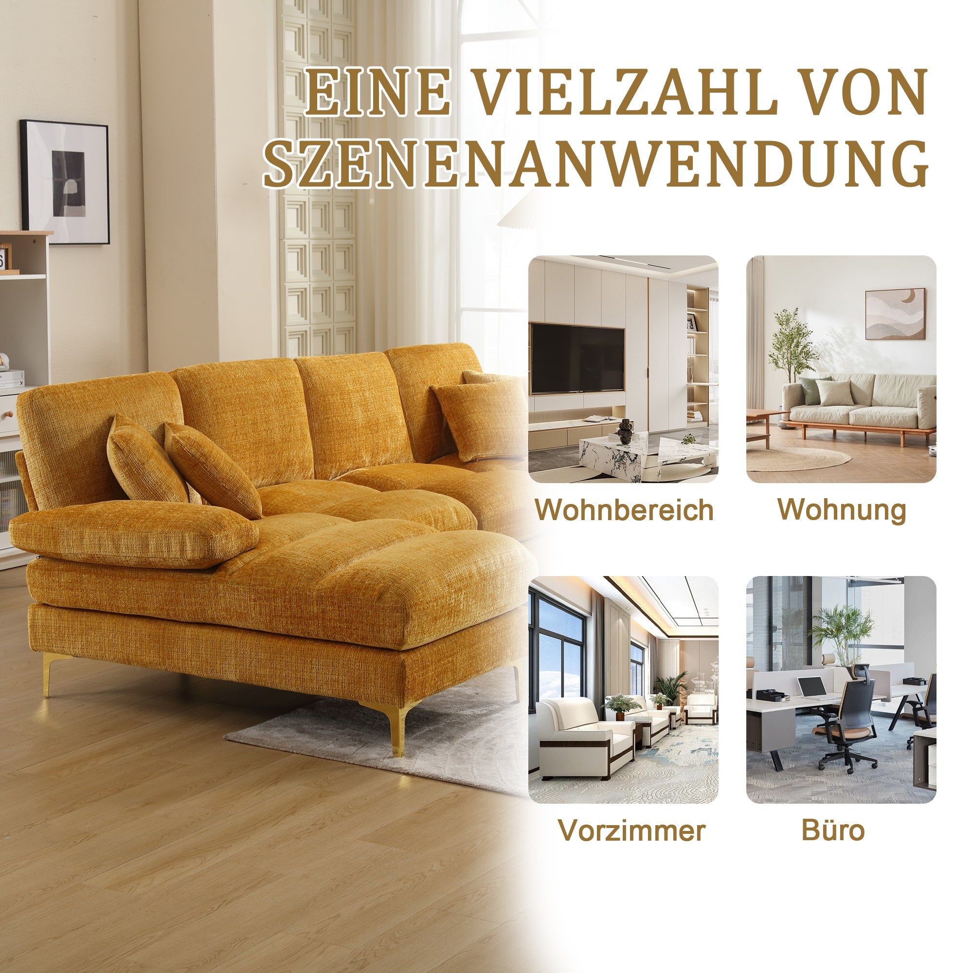 The zoned seating design not only provides additional comfort but also extends the lifespan of the sofa and preserves the shape of the cushions. The 15 cm high gold metal legs not only add a fashionable touch to the sofa but can also be easily cleaned with a robot vacuum cleaner, keeping your home clean.