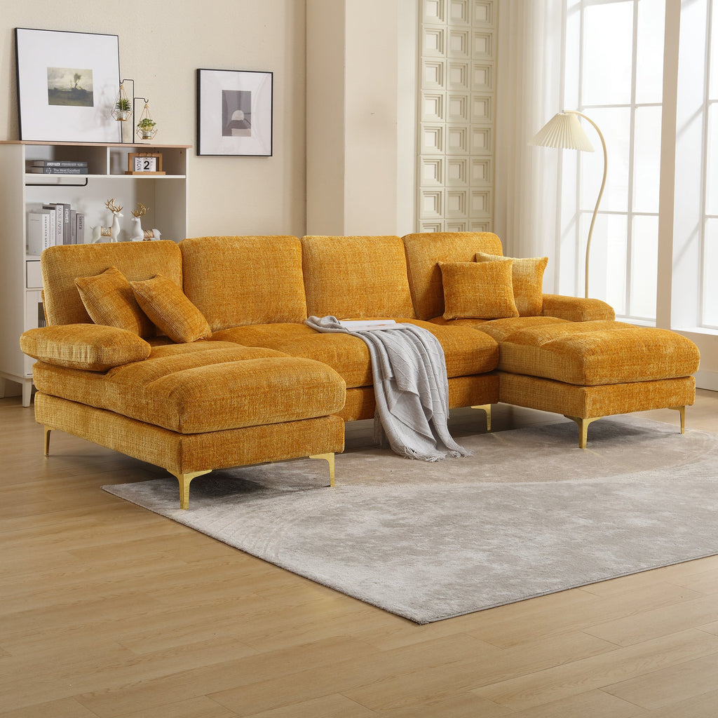 Chenille U-Shape Sectional Sofa, Modern Large Double Reclining, Mustard