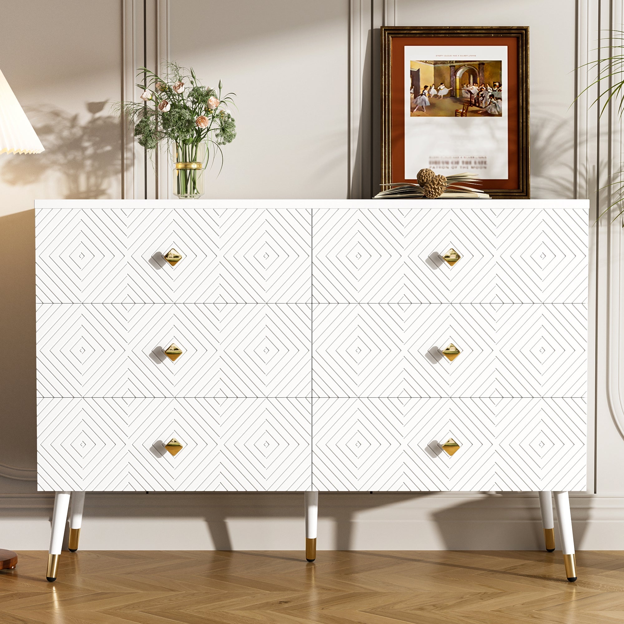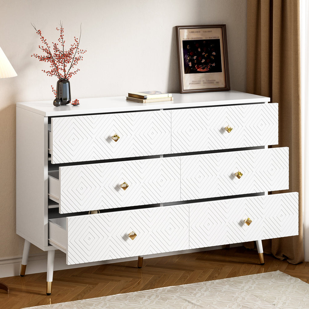 Discover the perfect combination of style, functionality, and quality with this modern 6-drawer chest of drawers. Measuring 120 x 40 x 80 cm, it offers ample storage space and is ideal for a bedroom, living room, or hallway. Its minimalist design in elegant white with a geometric pattern on the drawers adds a sophisticated touch to any room. The diamond-shaped handles harmonize perfectly with the delicate structure and create an appealing overall appearance.