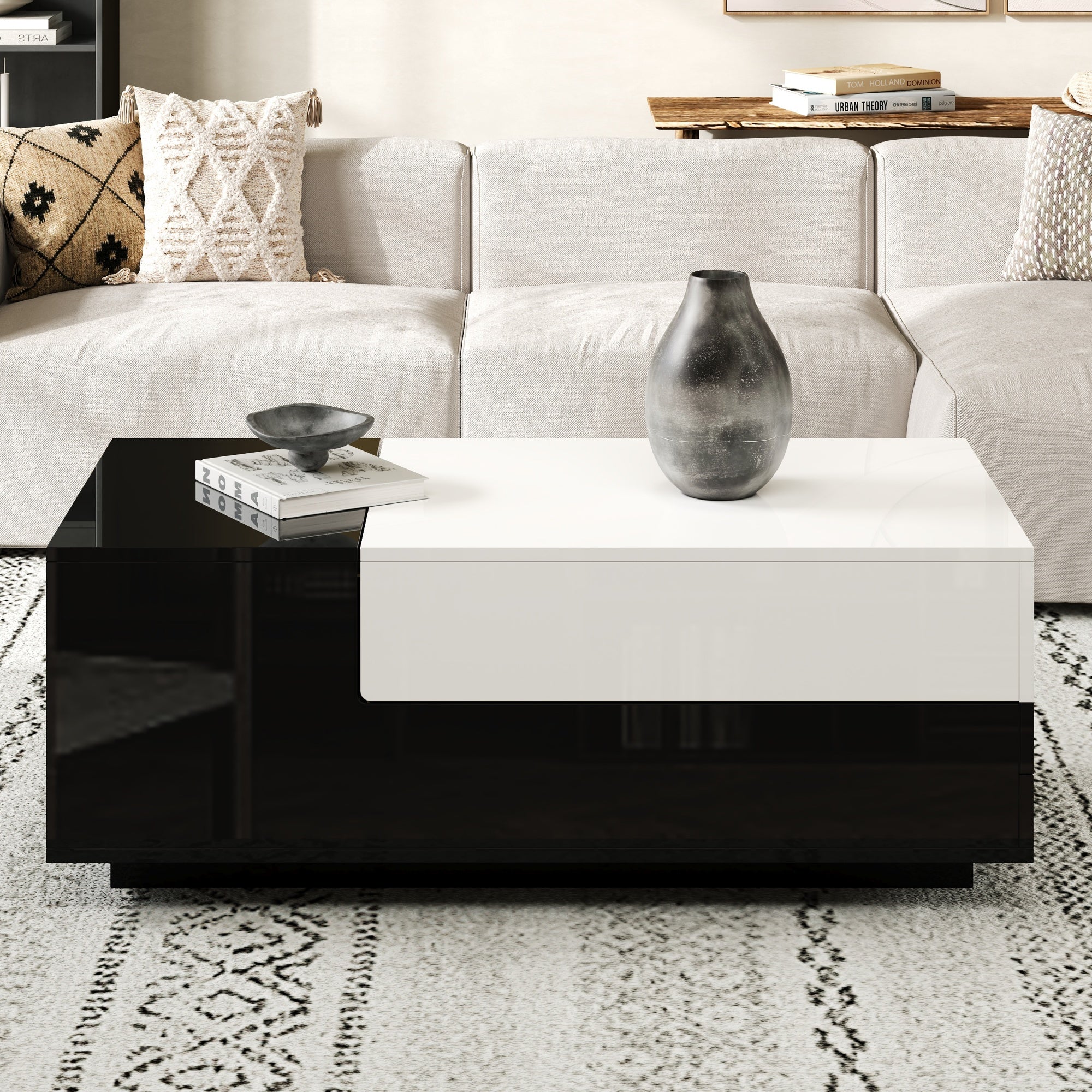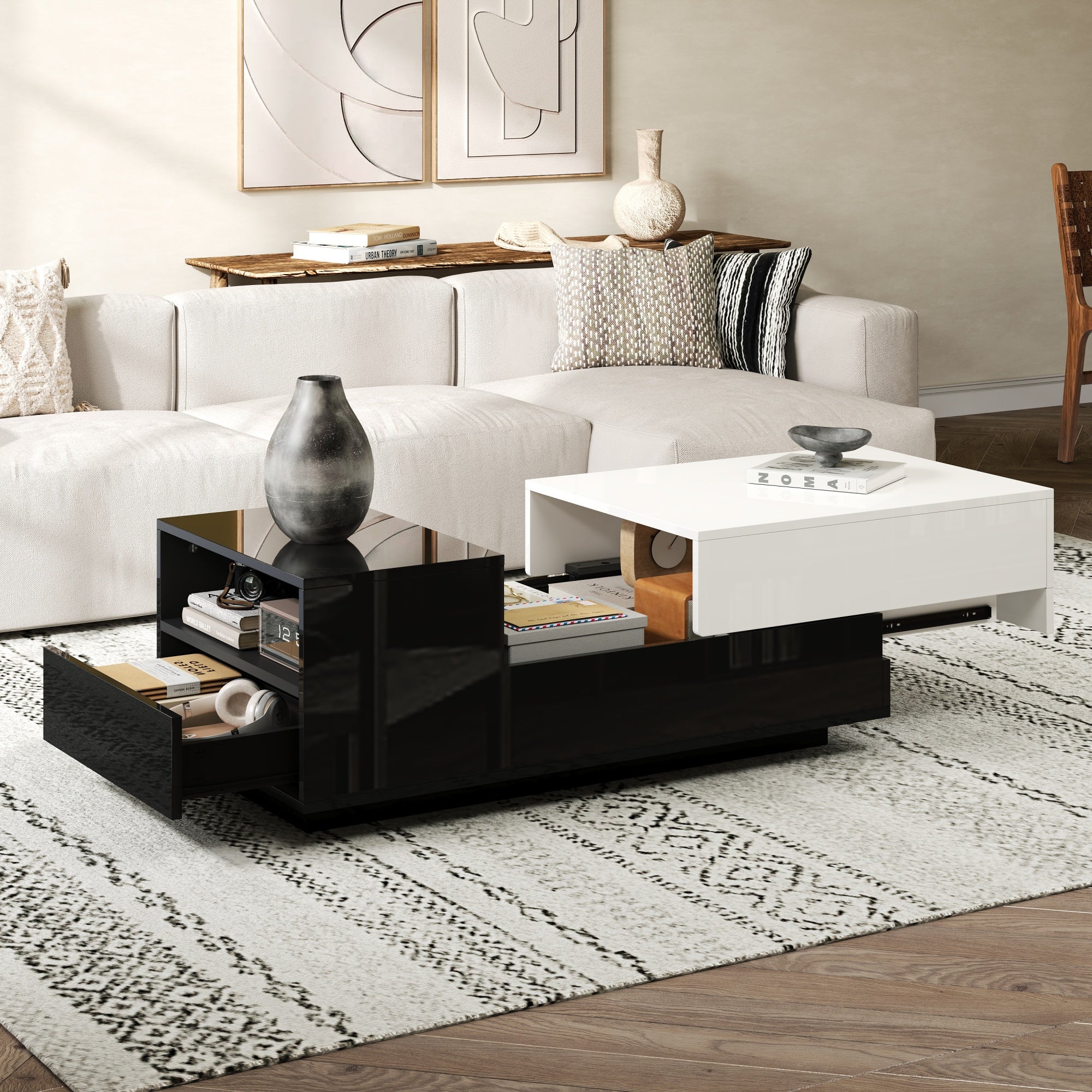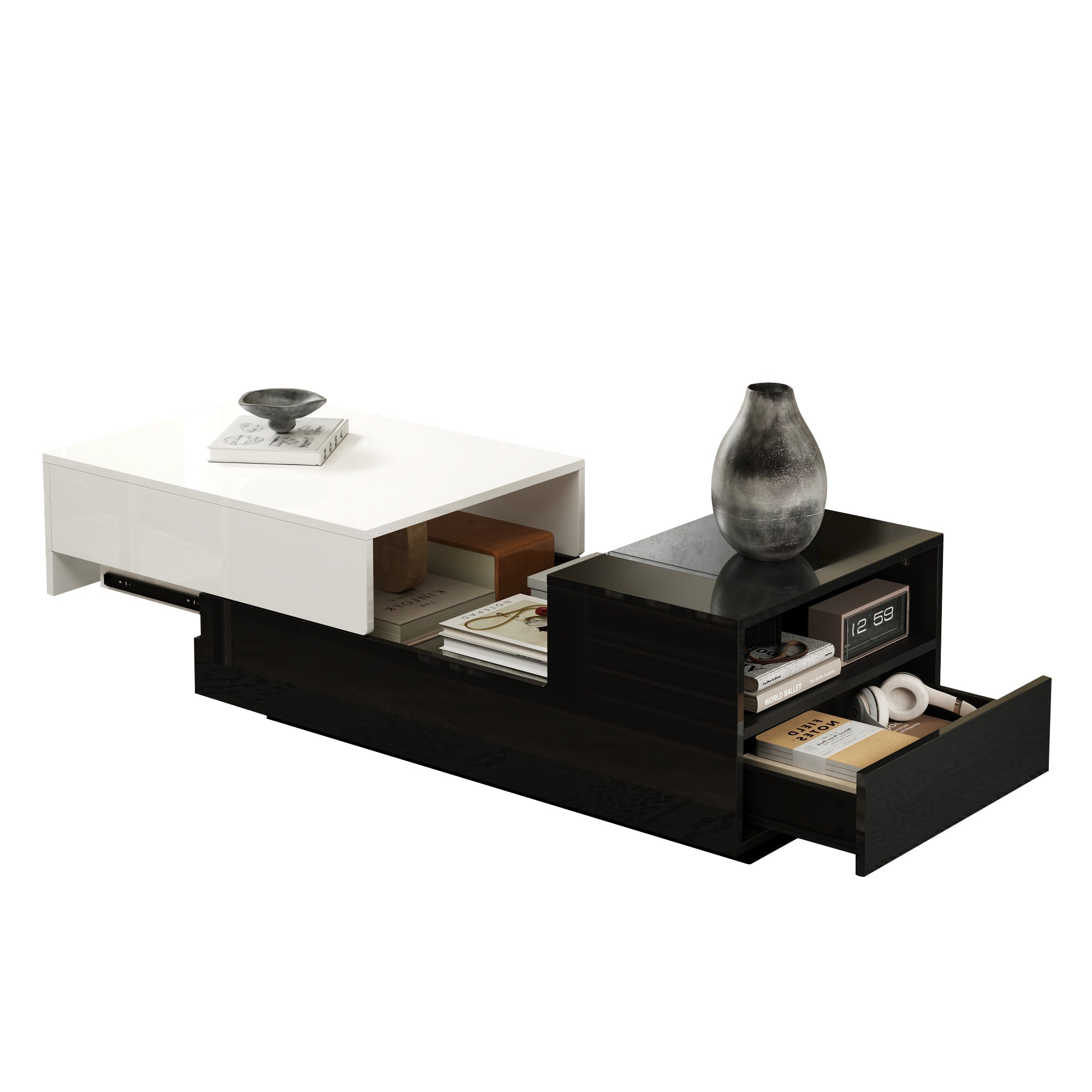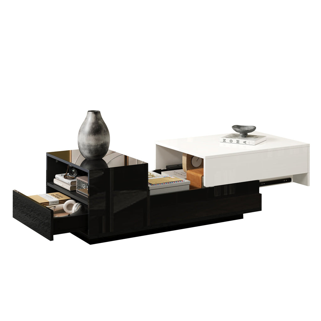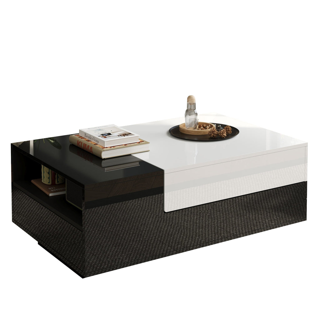 Coffee Table 100x50x38cm, High-Gloss with 1 Drawer & Sliding Top, Black and White Stitching