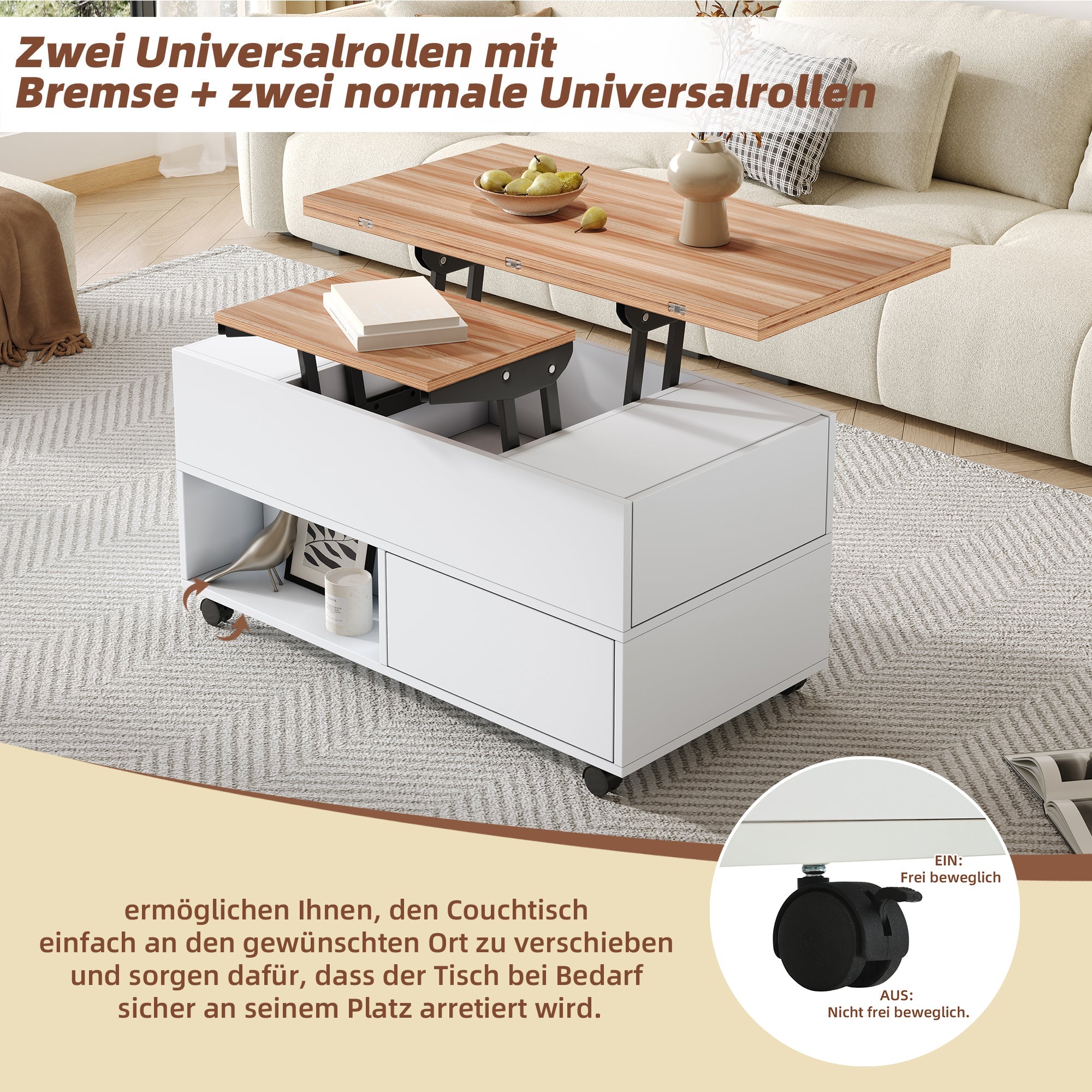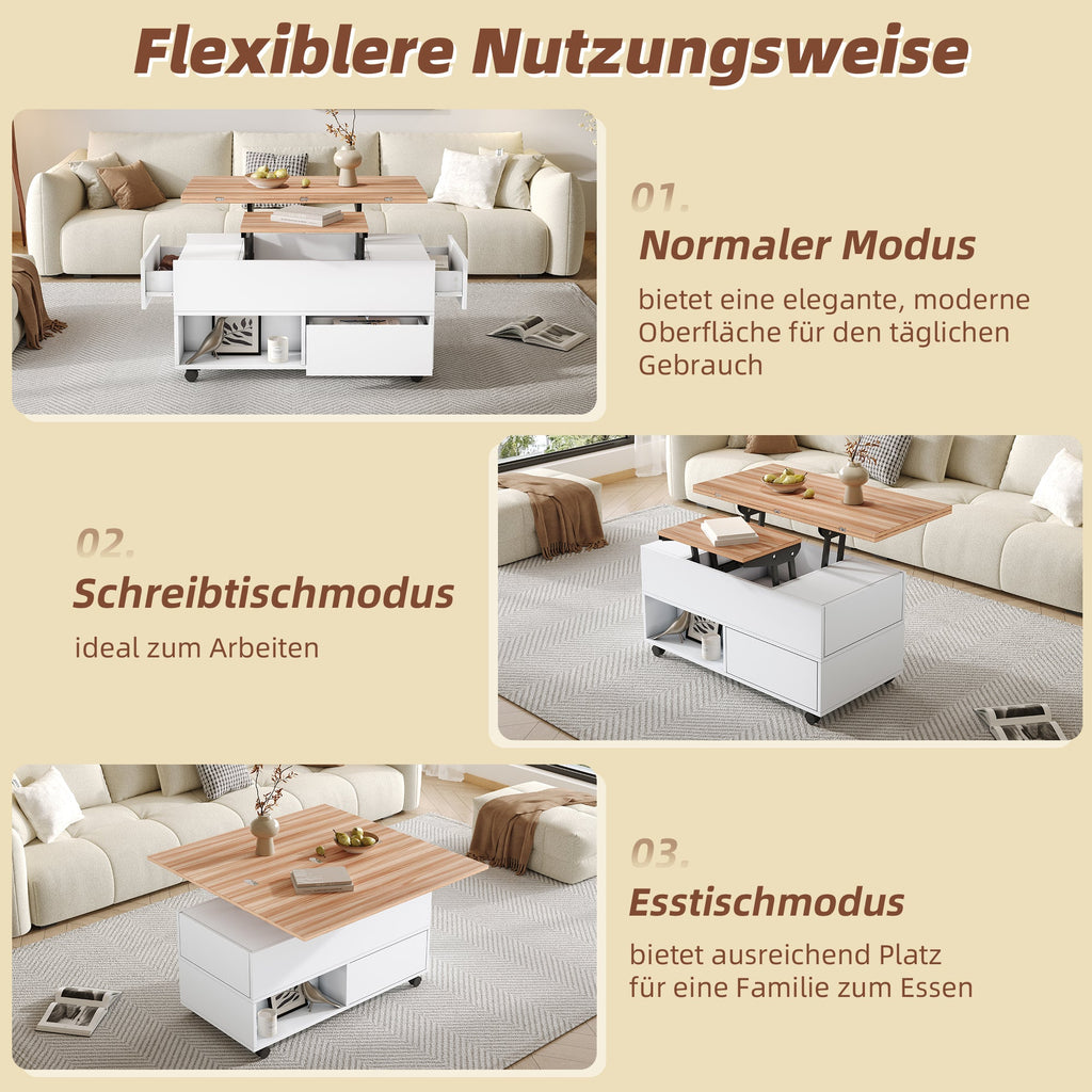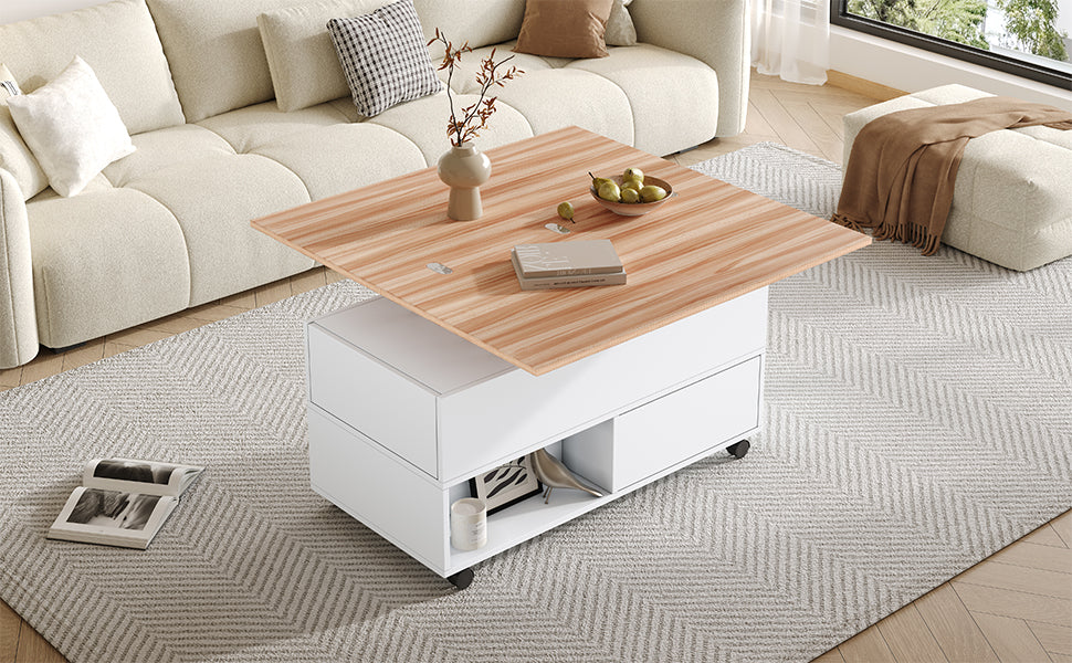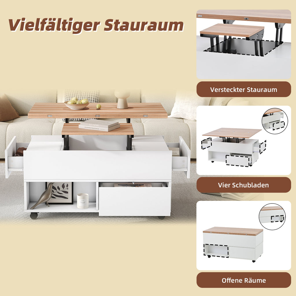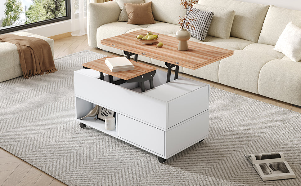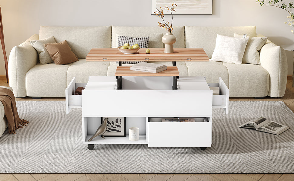 Coffee Table, 100x50x52cm Lift-Top with 4 Wheels & Drawers, White & Wood