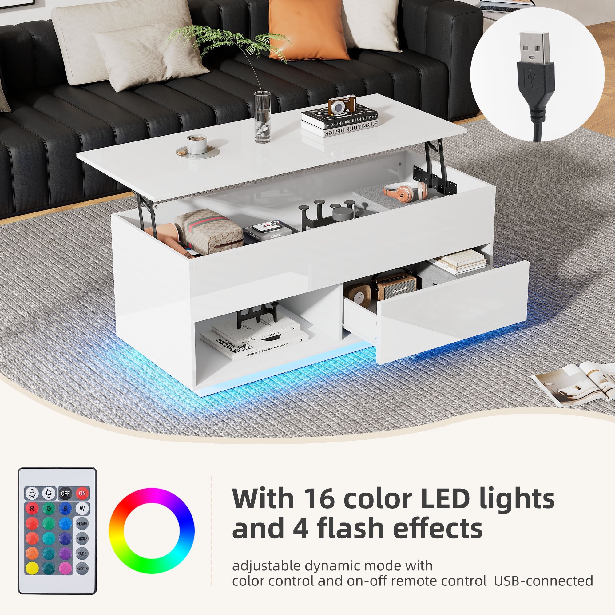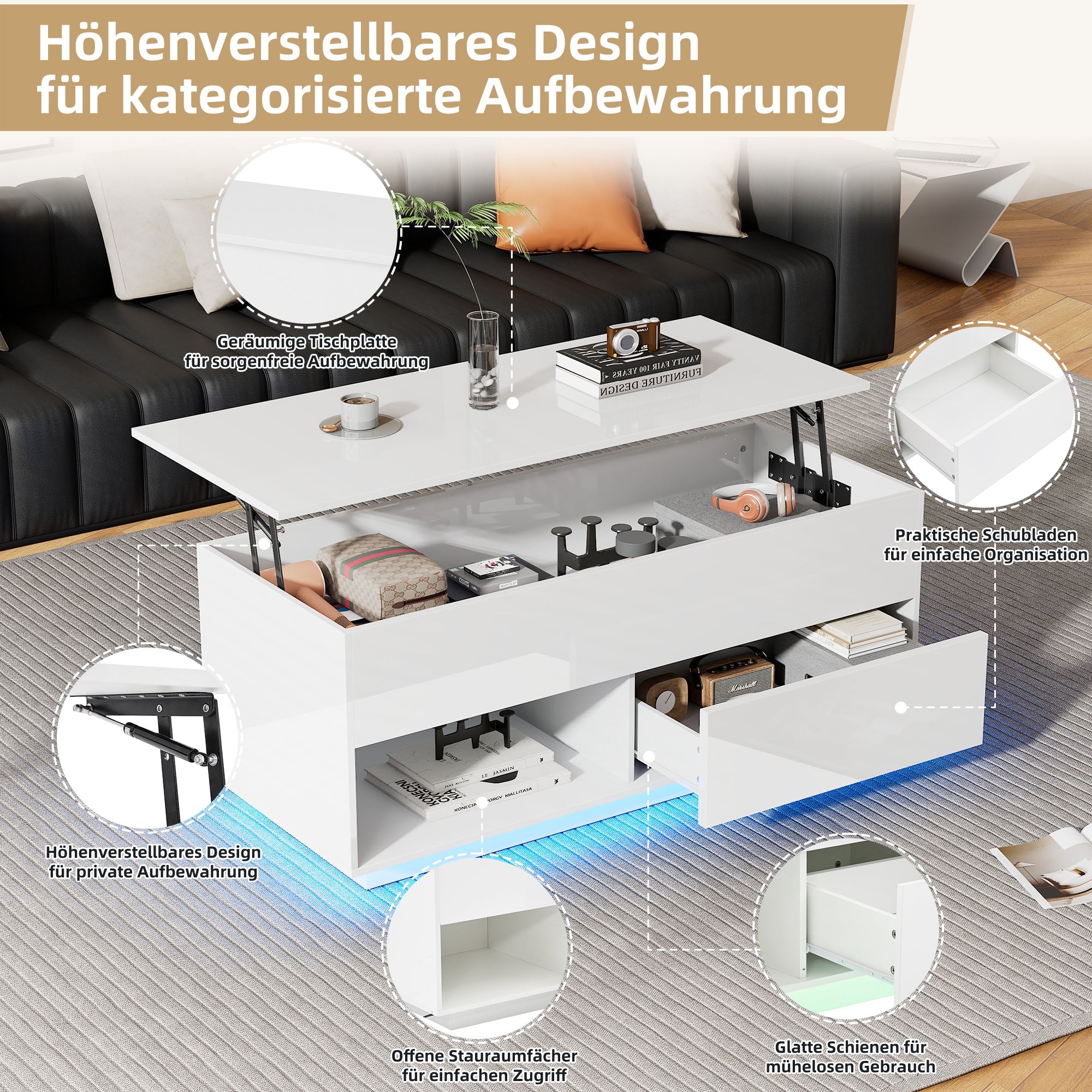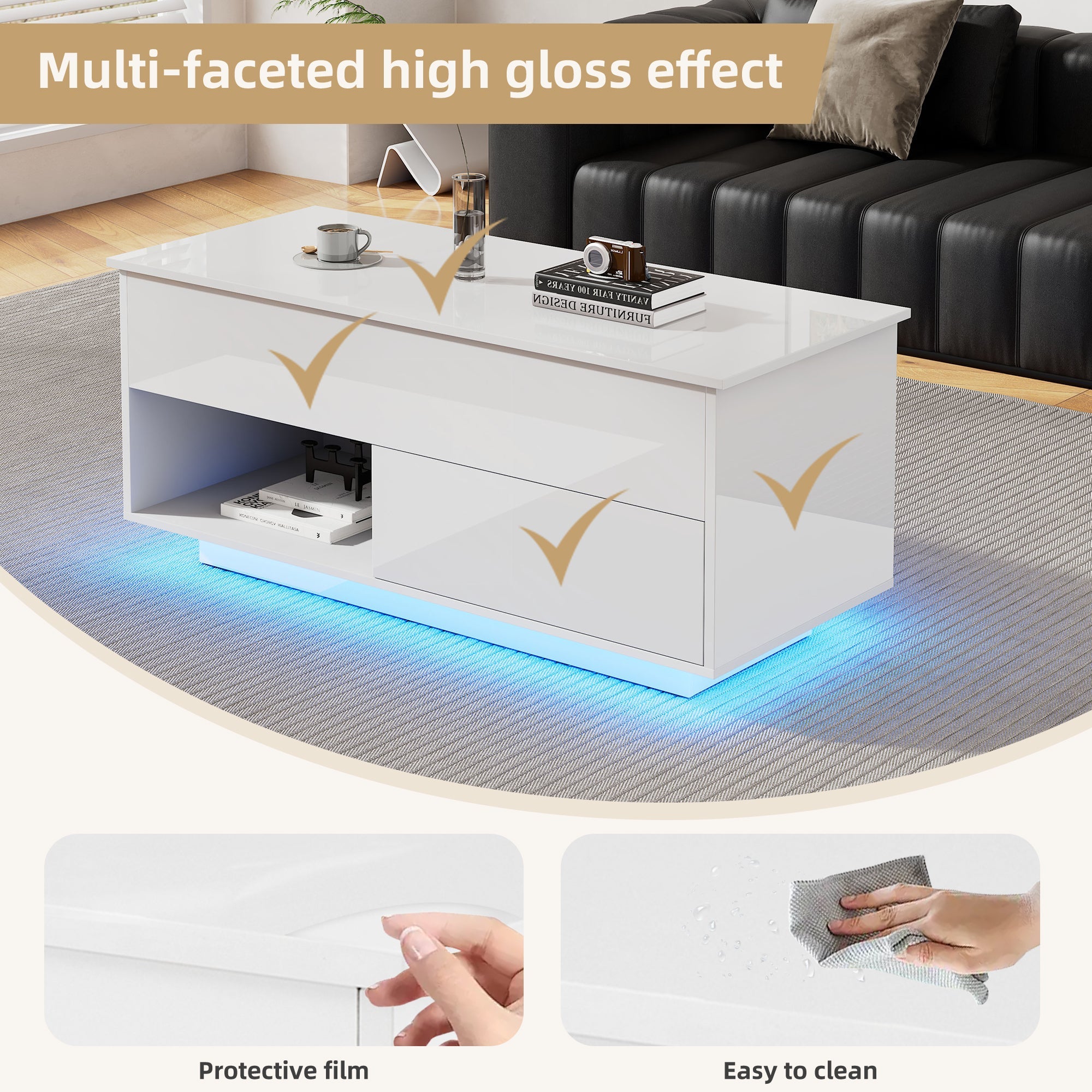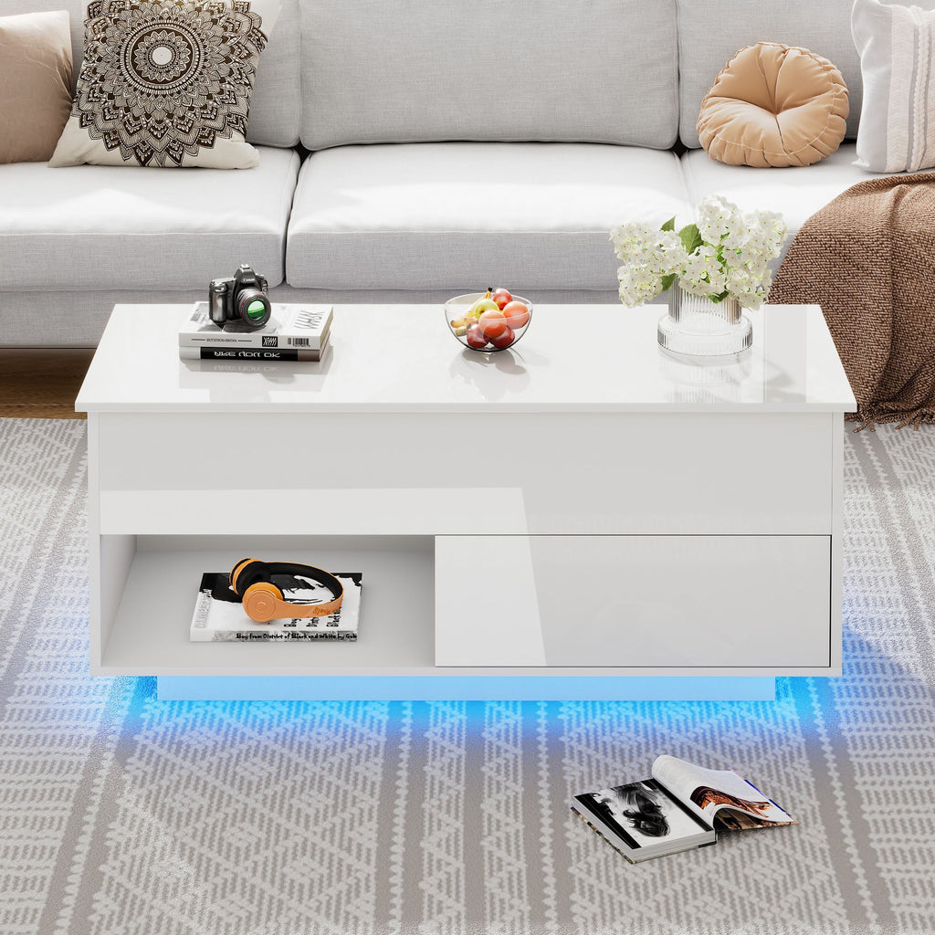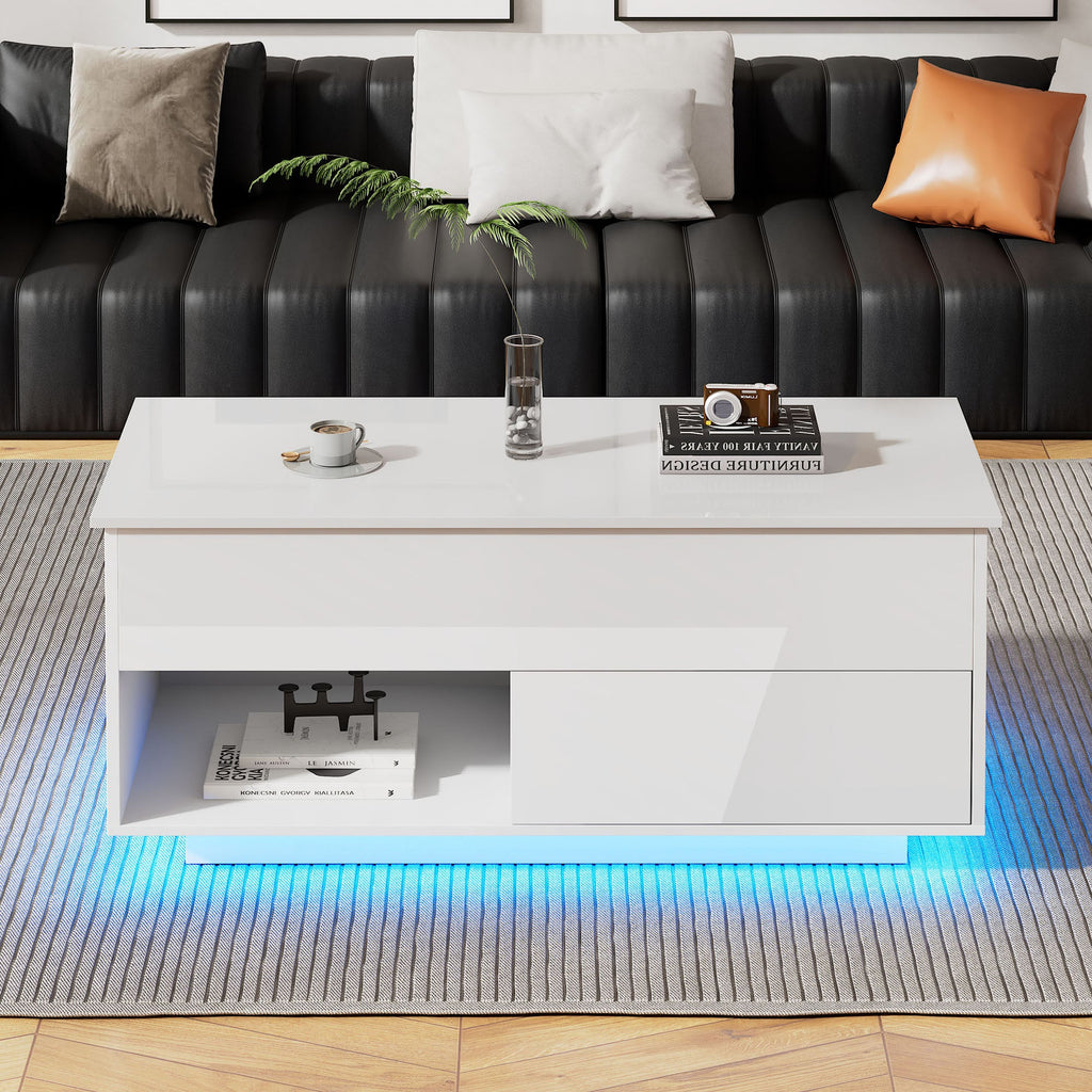 Coffee Table, 100x50x55 cm Lift-Top with LED, 1 Drawer, 50 kg Capacity, High-Gloss