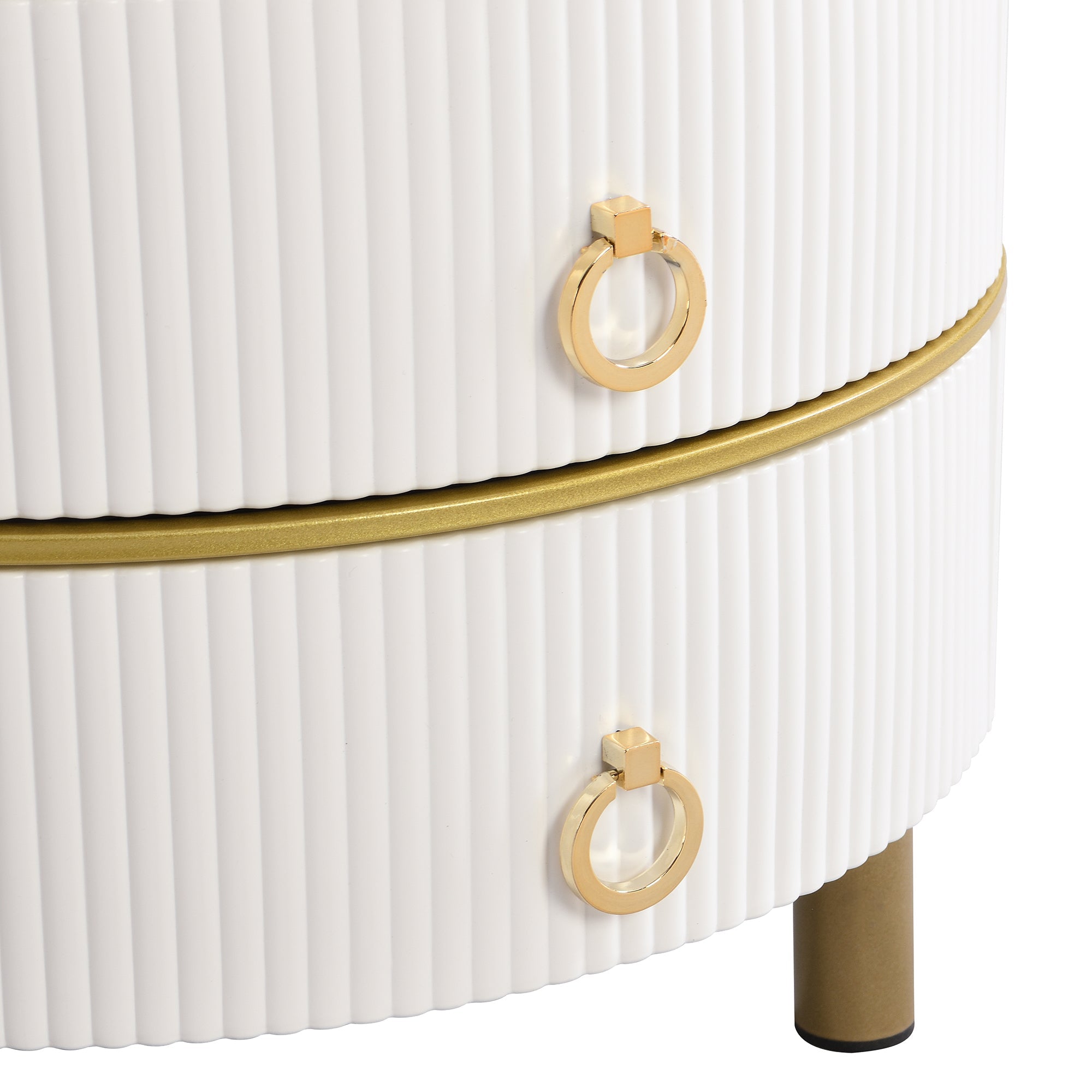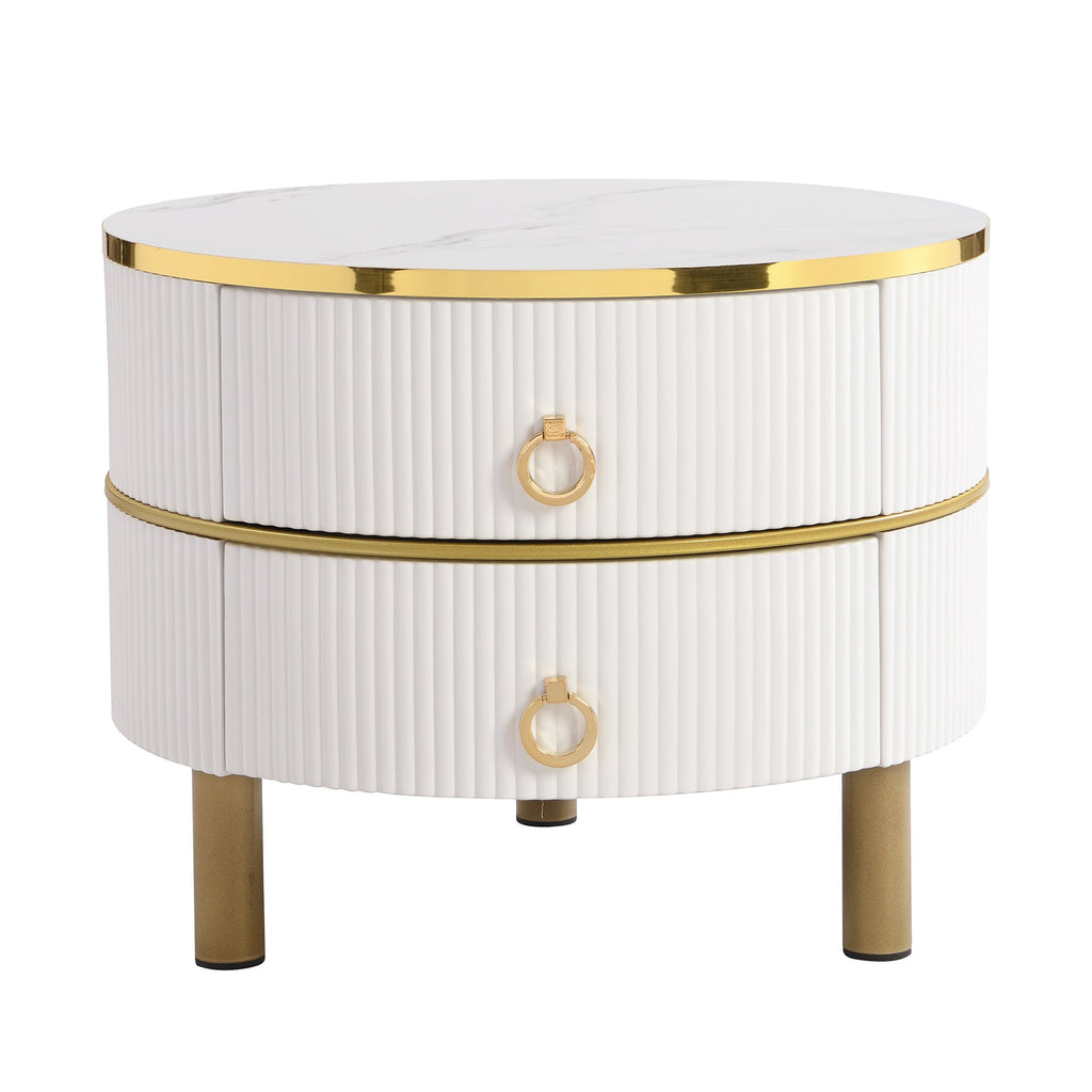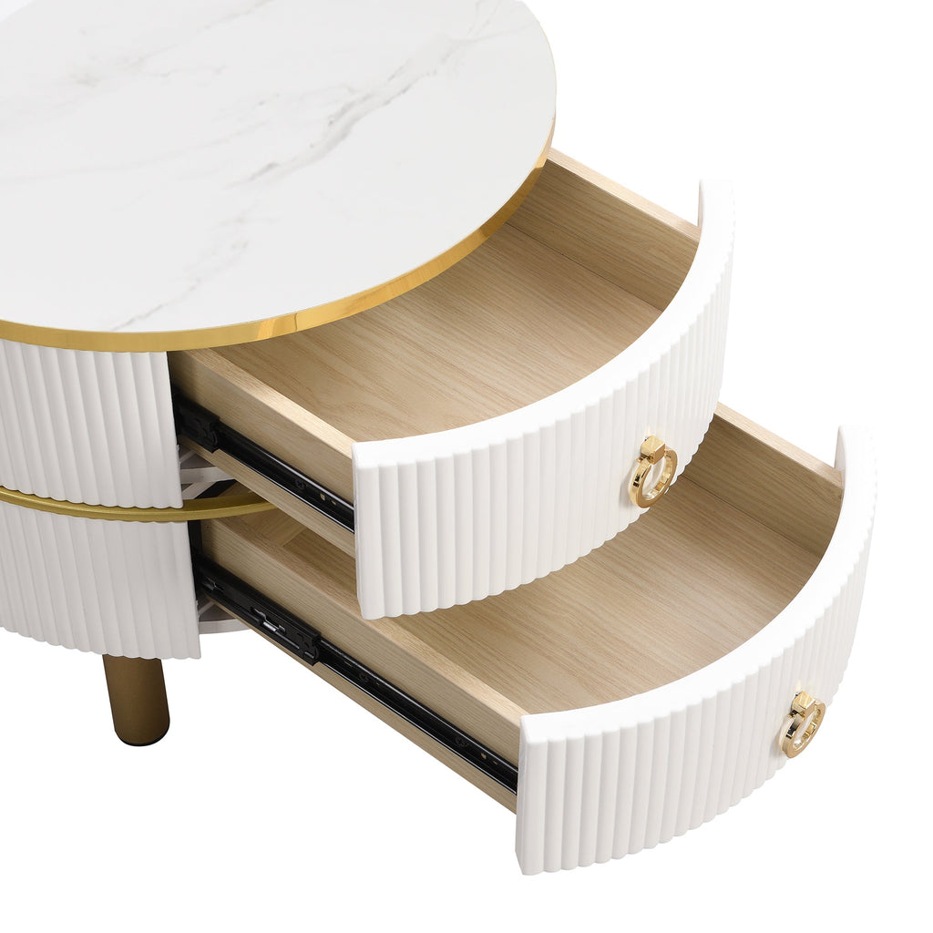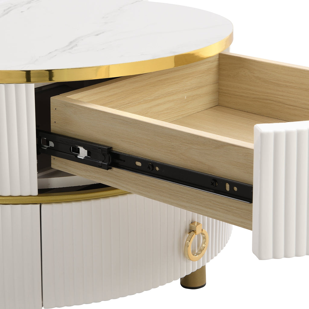 Coffee Table, 2-in-1 Round MDF & Tempered Glass with 2 Drawers, White & Brown