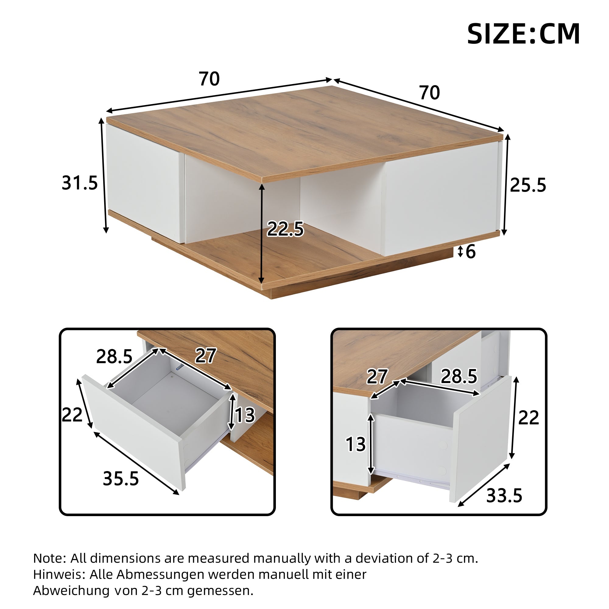 This square coffee table (70 x 70 x 31.5 cm) offers practical storage with three drawers and a semi-open compartment. It features a stylish design with wood-colored top and bottom sections, and a white middle drawer. The drawer fronts and outer panels are highlighted, and all drawers are equipped with secure spring locks. Made from durable particleboard, this table has a recommended load capacity of 30 kg. Gross weight: 25.7 kg; Net weight: 23.55 kg.