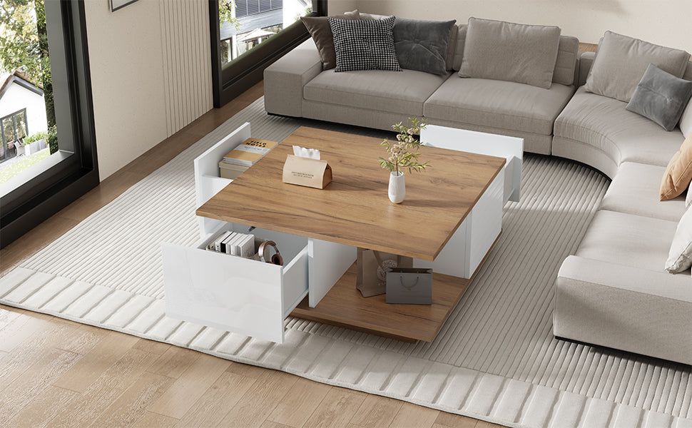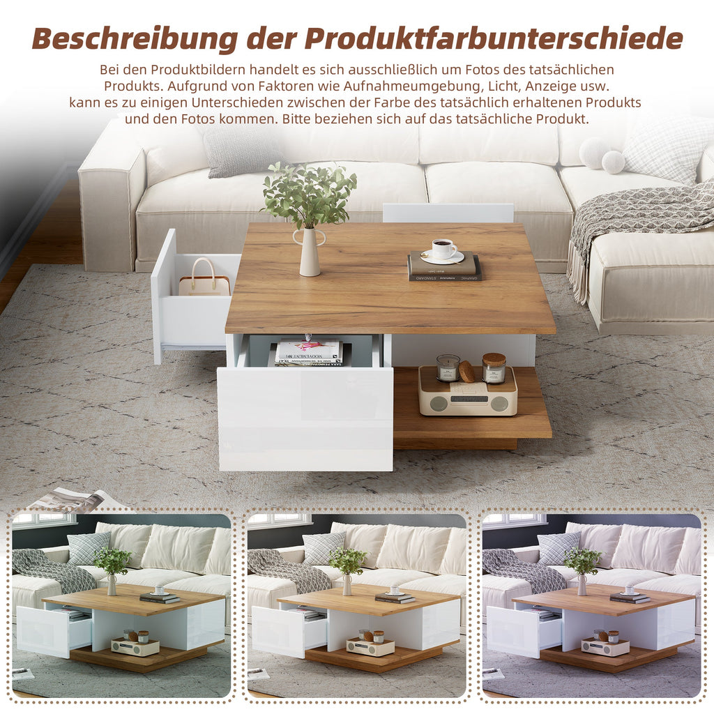 Coffee Table 70x70x31.5cm, 3 Drawers, High-Gloss, White & Original Wood Color
