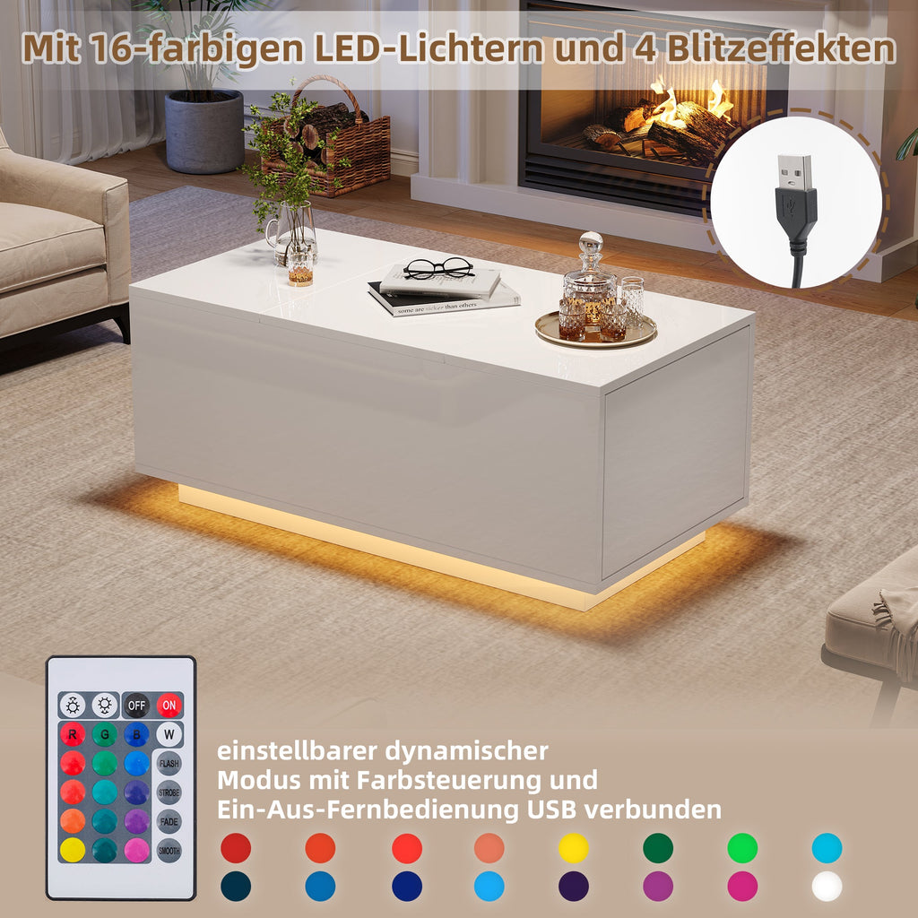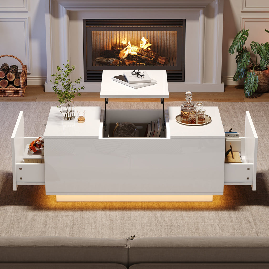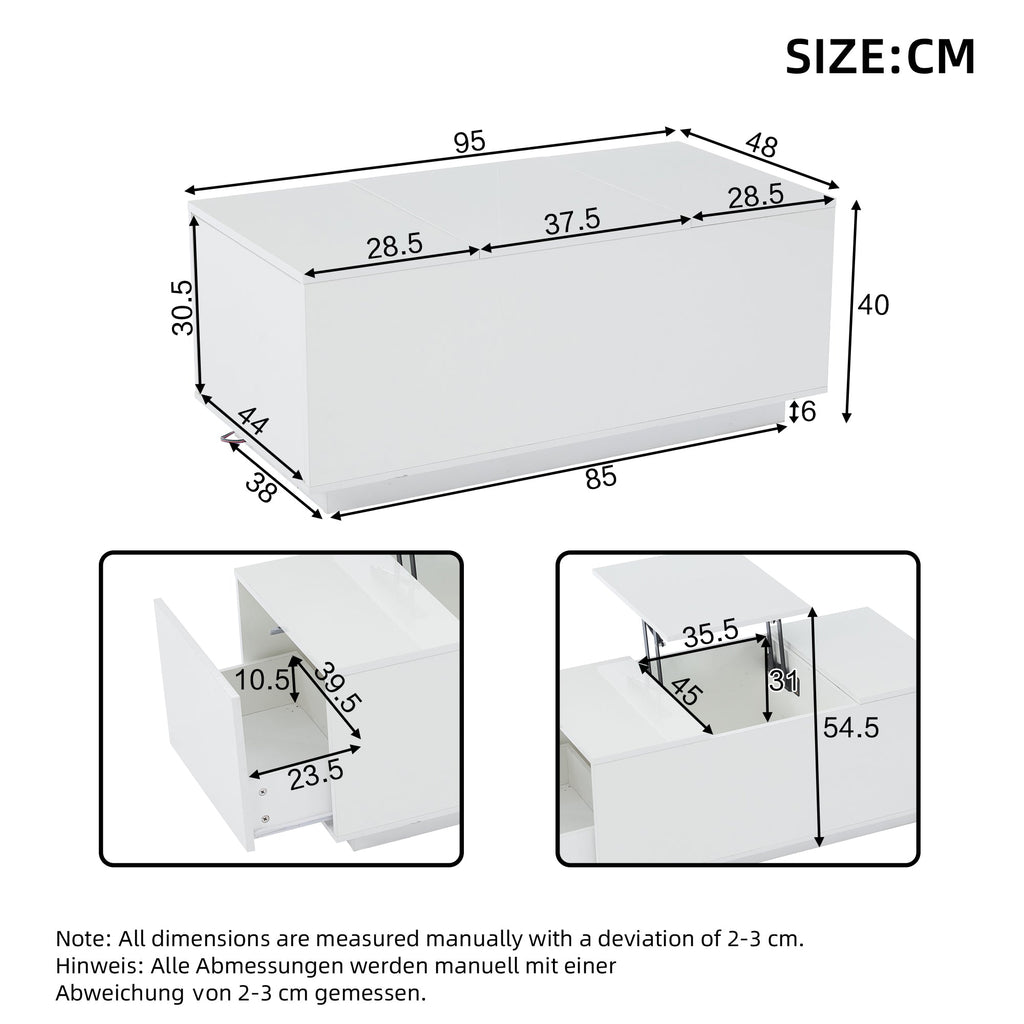 Coffee Table 95*48*40cm, Lift-Top, Height-Adjustable, Extendable, with 2 Drawers, LED, White