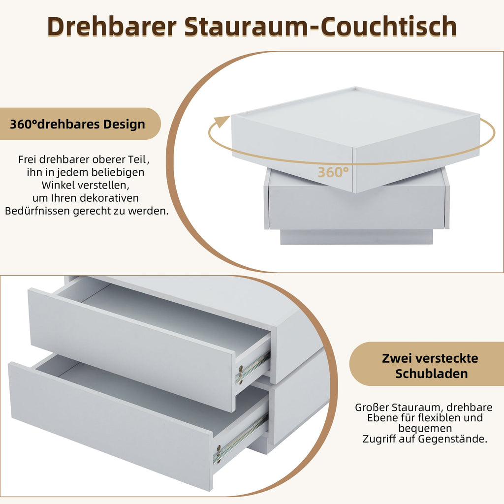 Transform your living space with our functional and stylish coffee table. Featuring a 360° rotating tabletop, you can effortlessly adjust it to any angle to meet your storage and decorating needs. This rotation creates ample space on the tabletop, perfect for displaying decor, organizing books, or serving coffee and refreshments. Its sleek white design seamlessly blends with various interior styles, making it a versatile addition to any home.