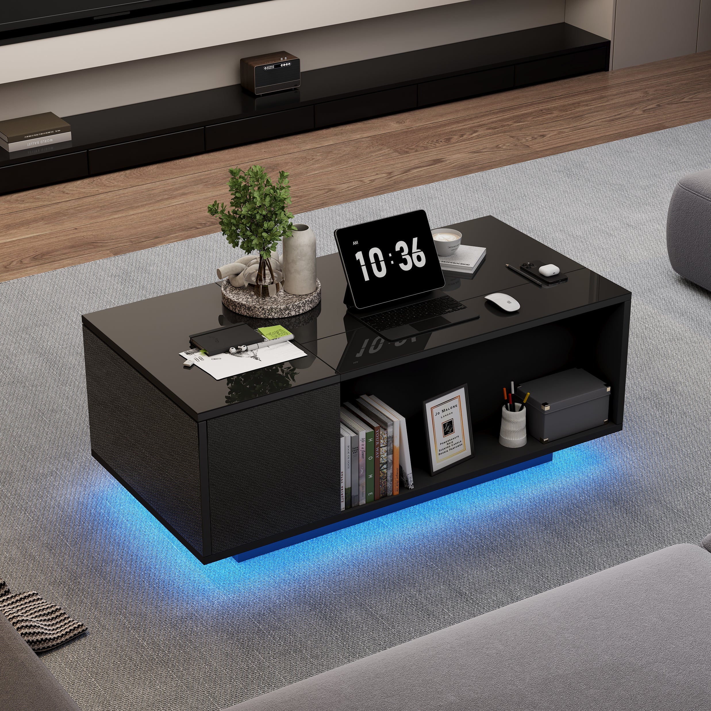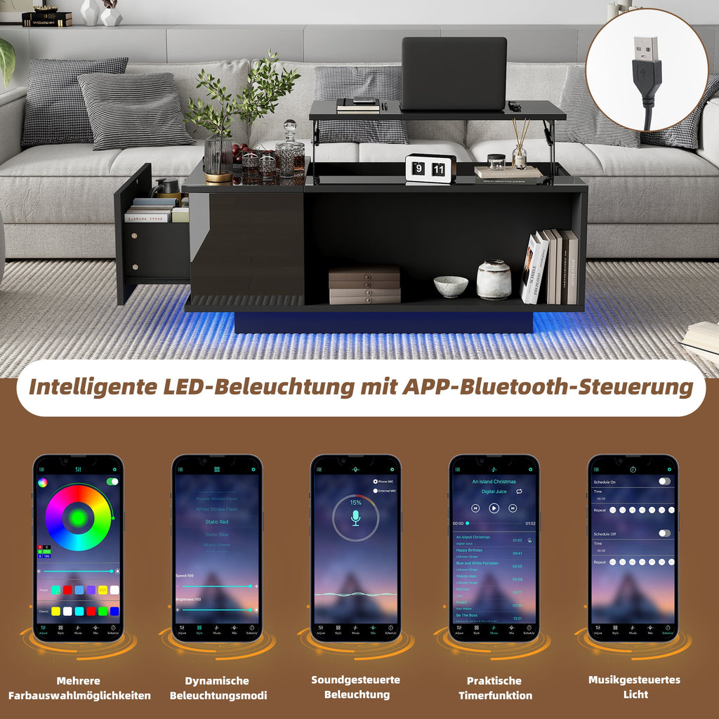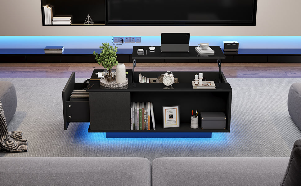 Coffee Table, Height-Adjustable with Hidden Storage & LED Light, Black