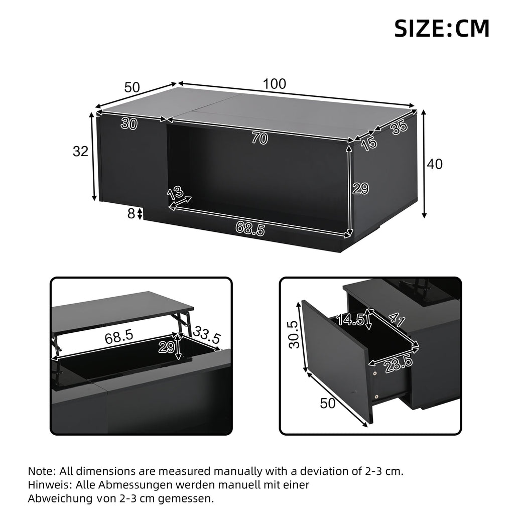 This 100 x 50 x 40 cm coffee table offers a practical layout perfect for any living space. It features a hydraulic lifting top for flexible use and convenient hidden storage underneath. Large drawers on the side and a semi-open platform at the back provide ample space for organizing and storing various items and books. The high-gloss finish on the top and edges is exquisite and easy to clean. An integrated Bluetooth LED light strip, adjustable via a mobile app, allows you to customize the color and create a unique ambiance. Constructed from sturdy and durable particleboard, its black appearance effortlessly complements modern, Nordic, and other interior styles. This coffee table combines functionality with beauty, adding warmth and sophistication to your living room.