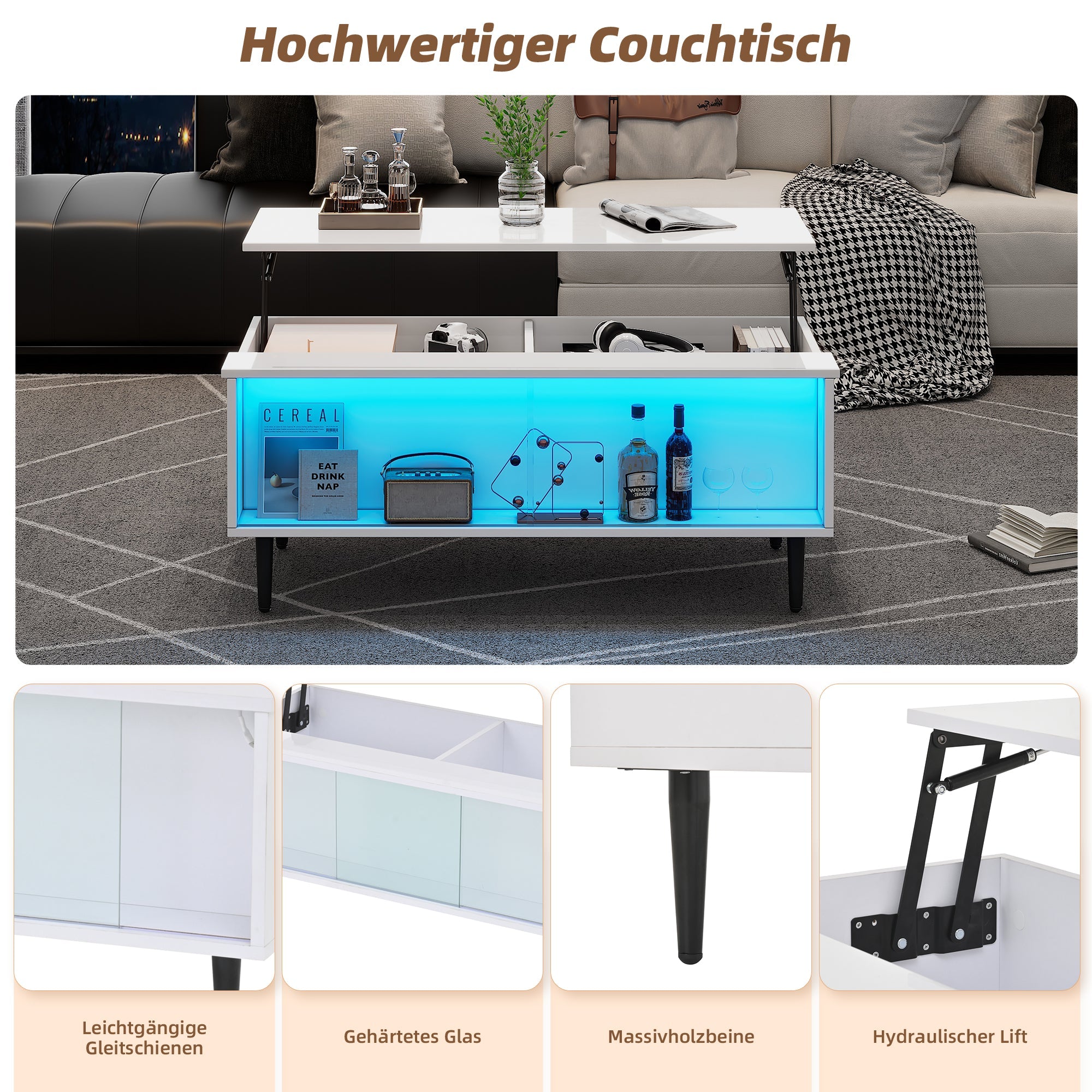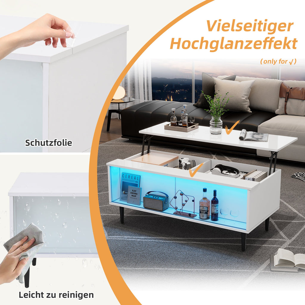 * Key Features: Liftable, Hidden Storage, Divided Storage, Display Storage, LED Illumination, High-Gloss Finish