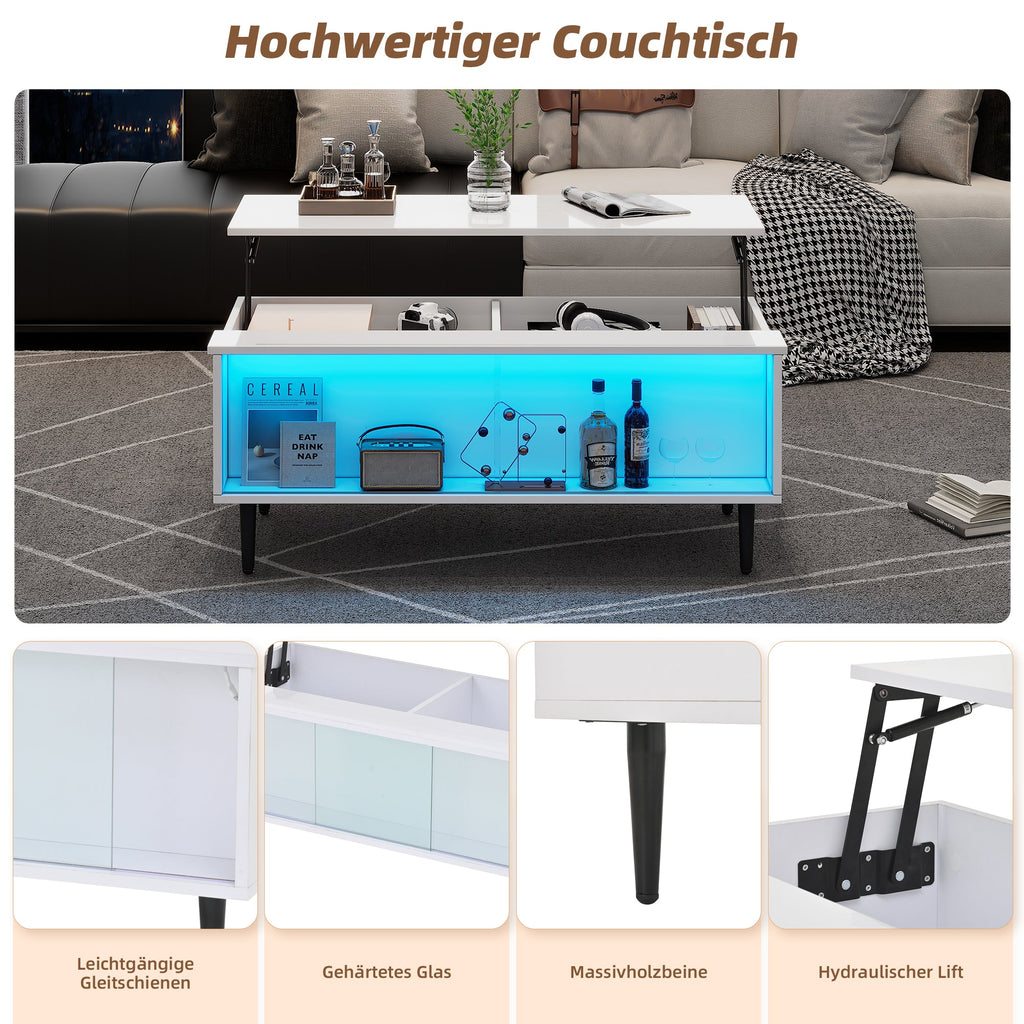 Coffee Table, Height-Adjustable with Hidden Storage & LED Light, White Tempered Glass
