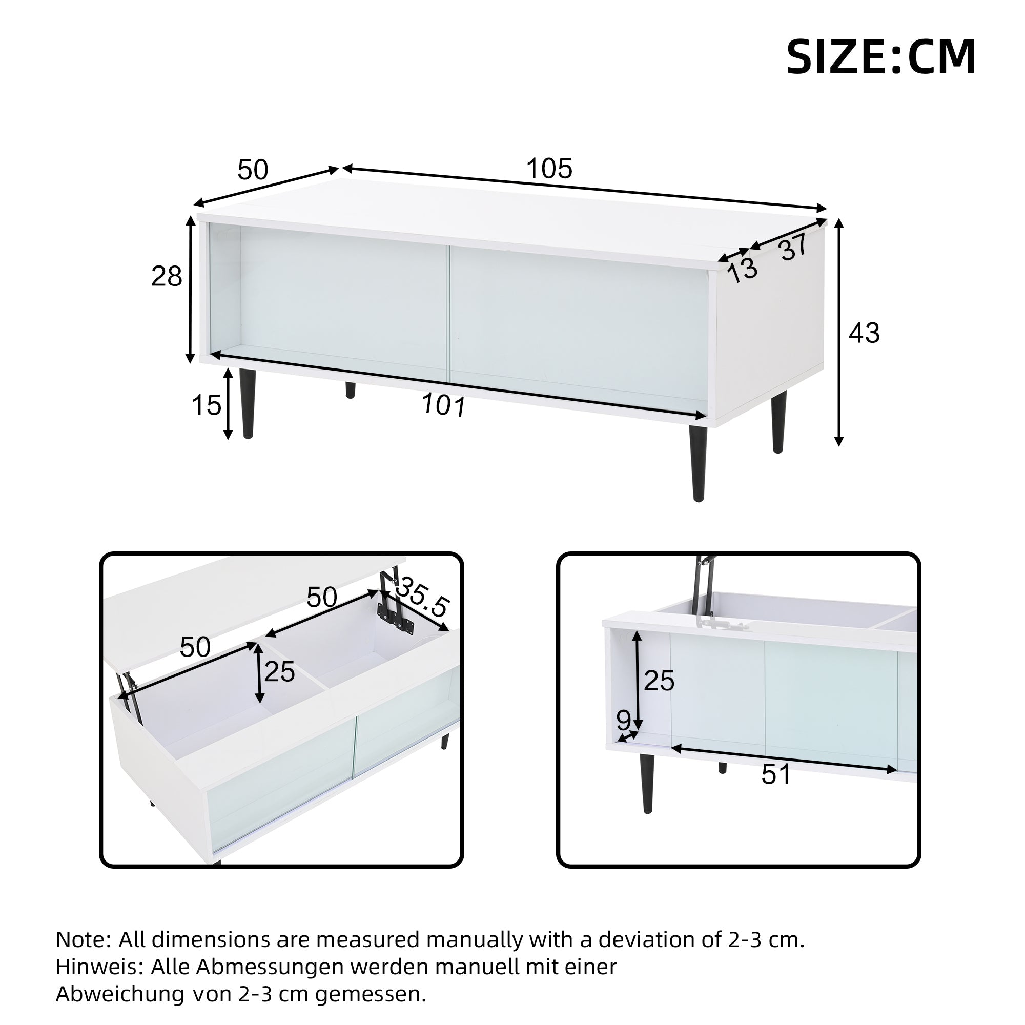 Elevate your living space with our versatile coffee table, featuring overall dimensions of 105 x 50 x 43 cm. This innovative table can be easily raised to 58 cm, offering adaptable functionality for various uses. Discover ample storage solutions with divided compartments and two hidden shelves beneath the tabletop. Two tempered glass sliding doors on the front provide additional display or storage space, perfect for showcasing decor or stowing essentials.