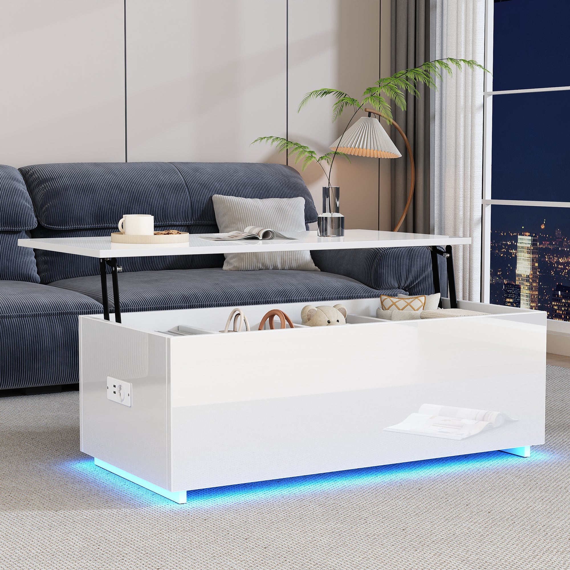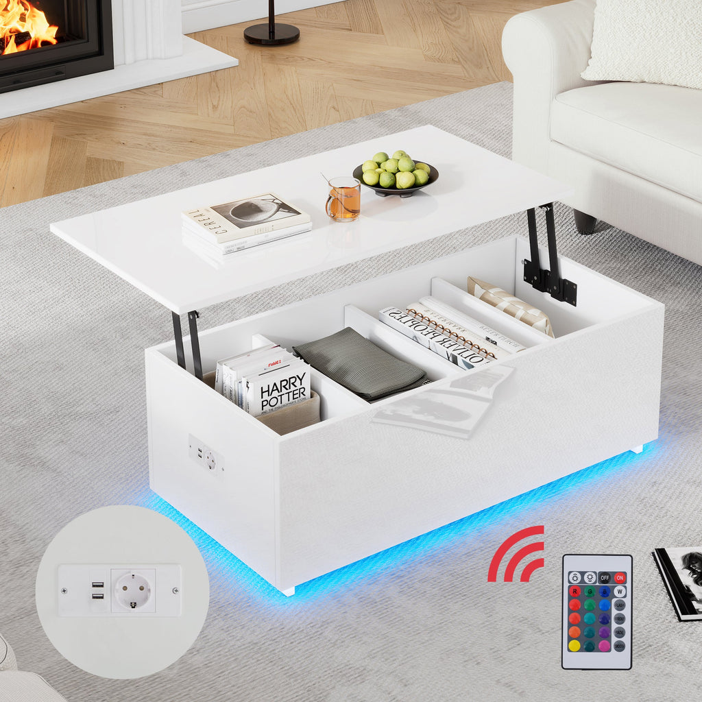 Coffee Table, High-Gloss with LED Lighting & Storage, White