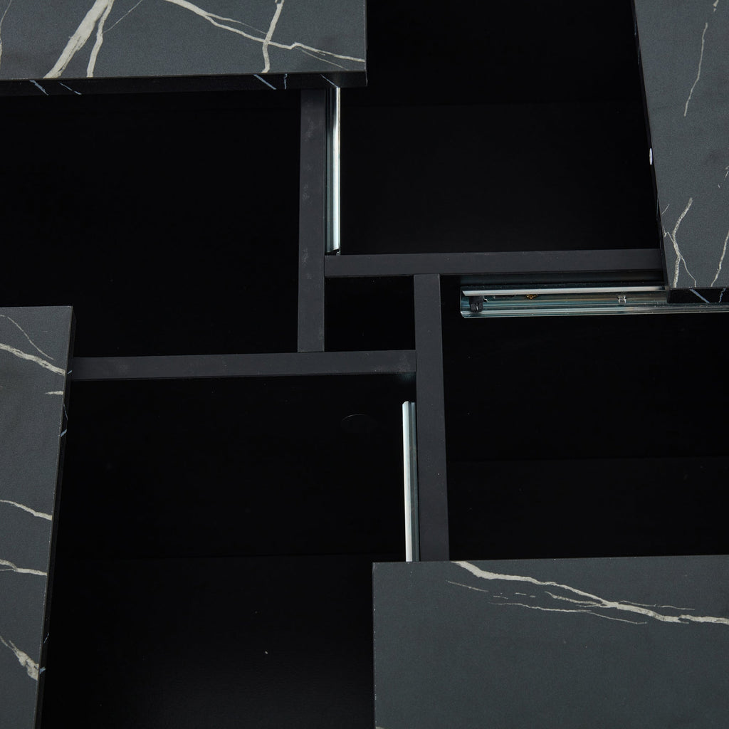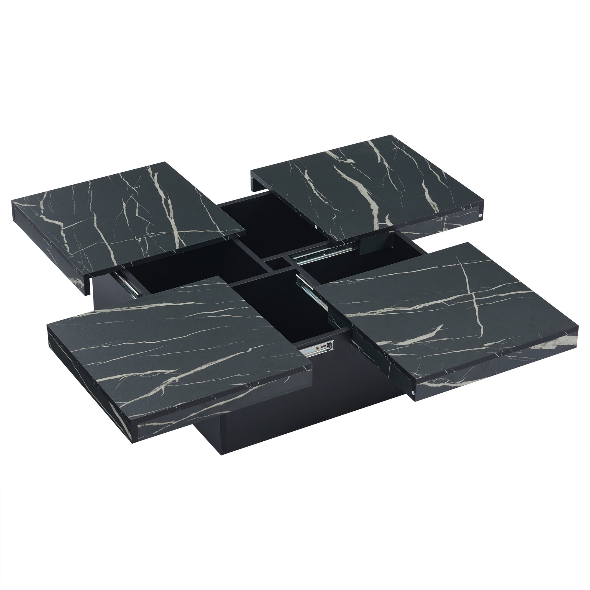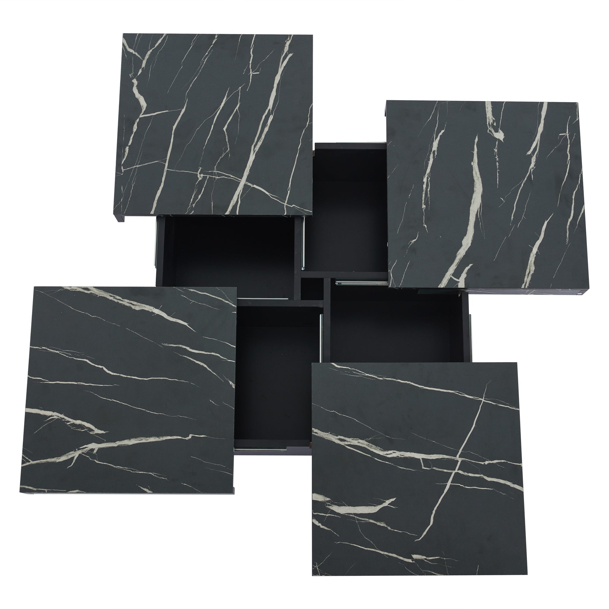 Coffee Table, Square 90x90x25cm with Four Drawers, Sliding Tabletop, Black Marble Look