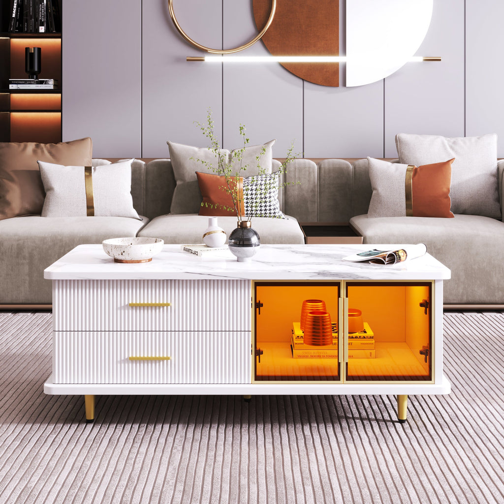 Coffee Table, TV Cabinet, Modular Living Room Furniture with Tempered Glass Door, Aluminum Alloy Frame, Wave Texture Drawers, Gold Handles and Legs, Marble Texture Tabletop
