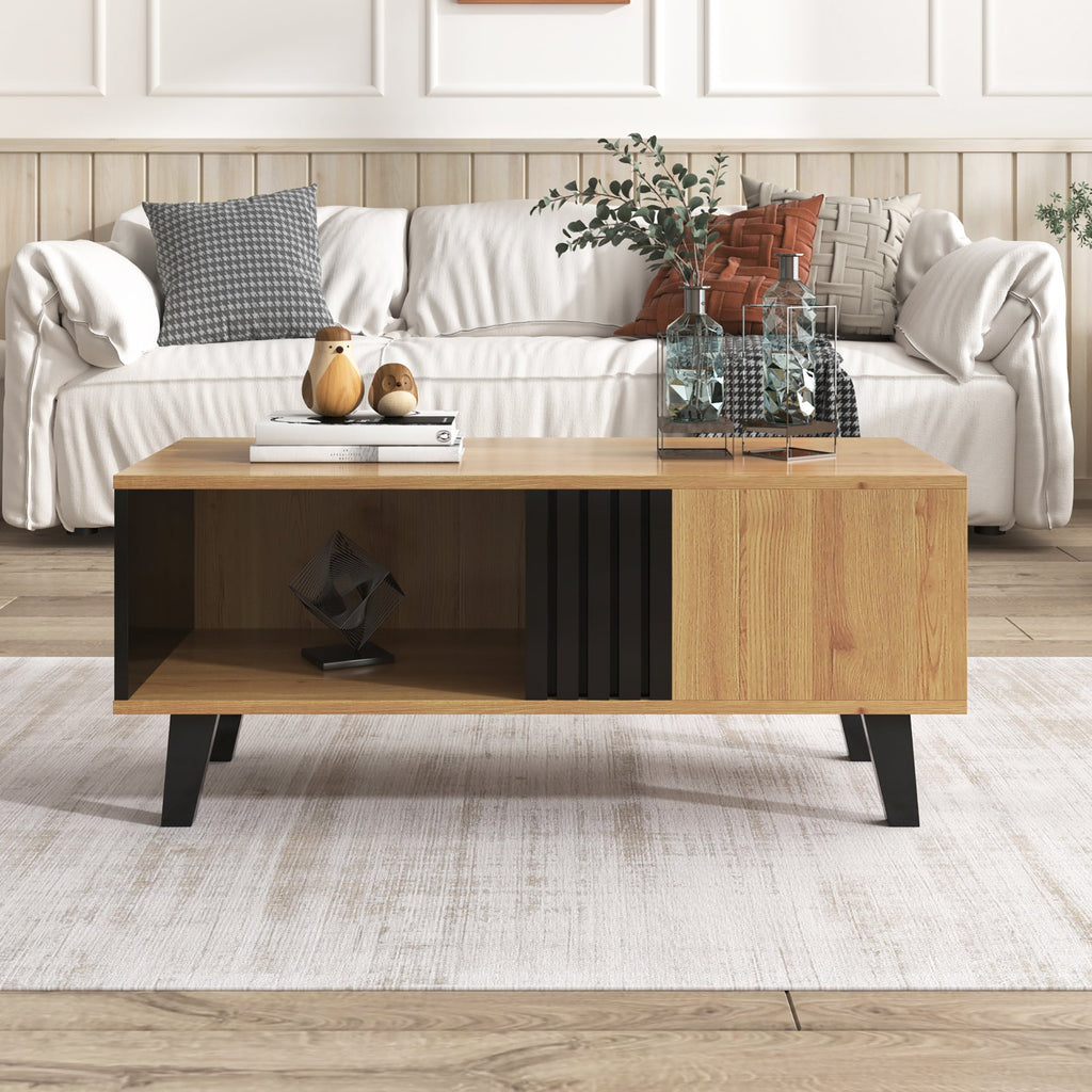 Our designer coffee table in wood and black invites you into a world of timeless elegance. The perfect combination of wood tones and deep black gives this piece a unique aesthetic. The natural striped wood texture and black wooden legs complement the wood-colored surface, creating a warm and modern look.