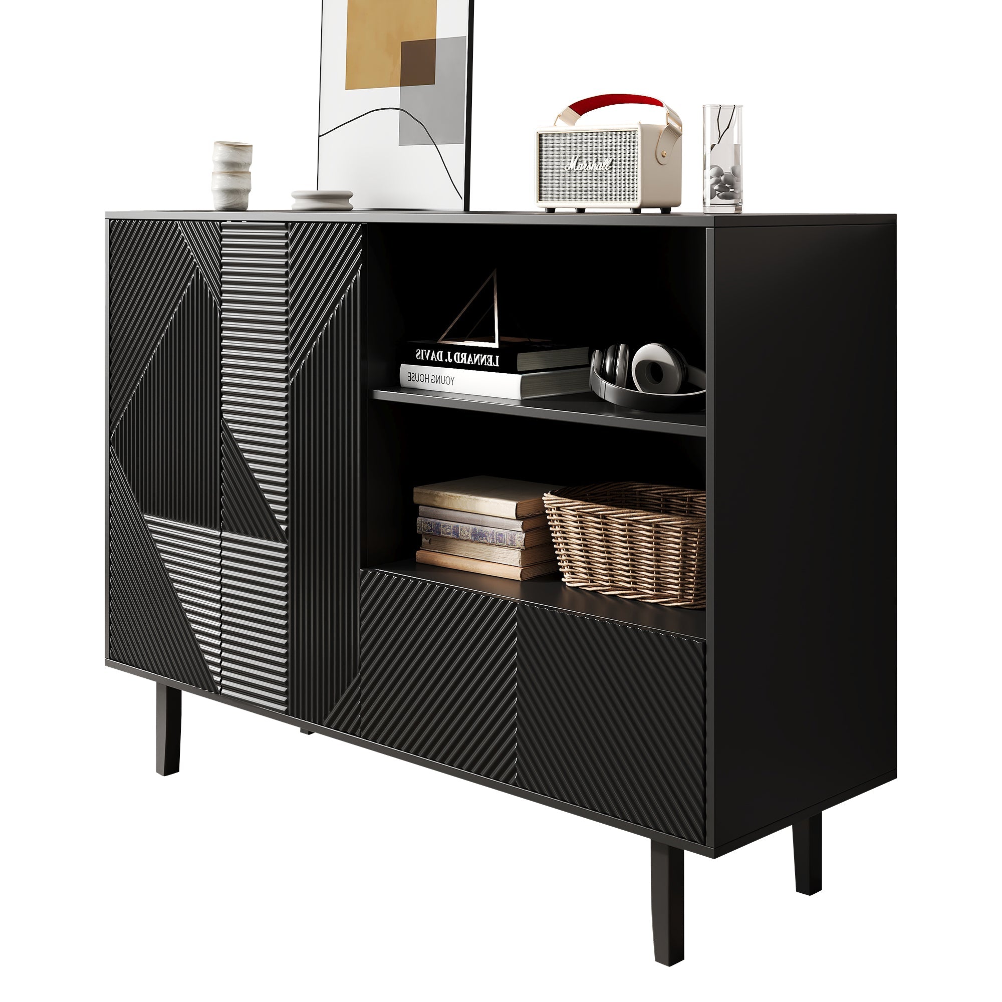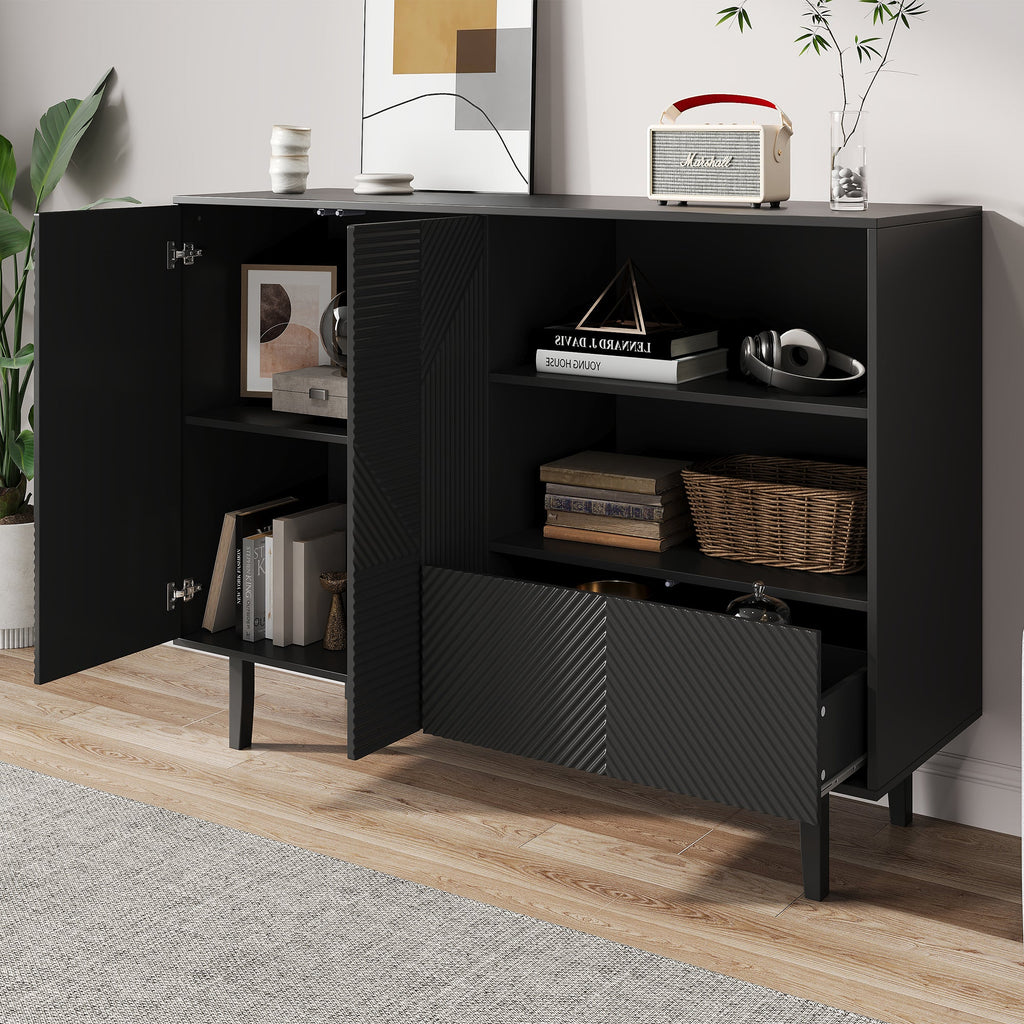 Decorative Cabinet with Geometric Pattern, 2 Doors & 1 Drawer, Matte Black
