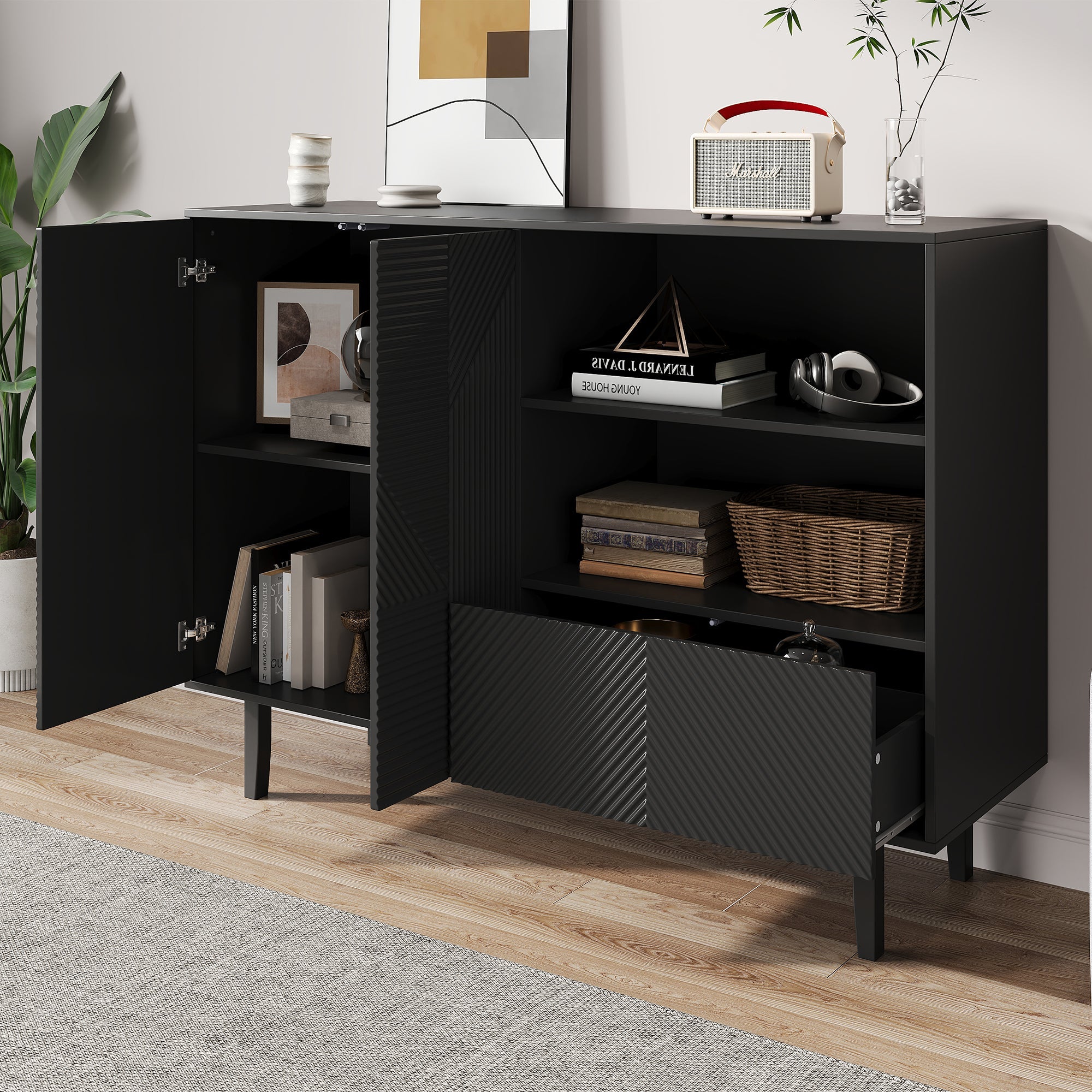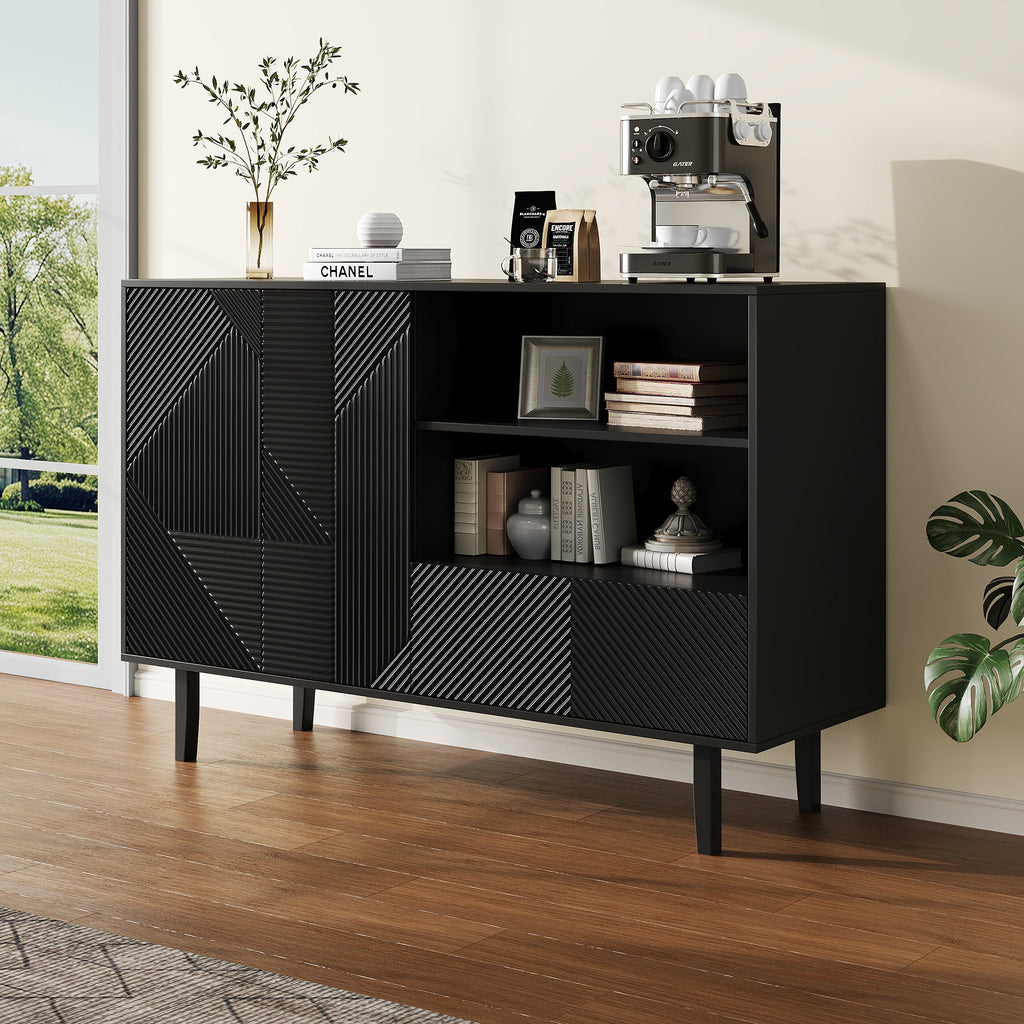 Four solid wood bases provide strong support and protect against moisture damage. The storage cabinet boasts an elegant and modern design with a beautiful straight wave pattern on its doors, adding a unique touch to any room and interior style. This versatile sideboard can be used as a dining room cabinet for dishes and food, as storage for books, bags, and home decor in the living room, or even as a shoe rack in your entryway or hallway.