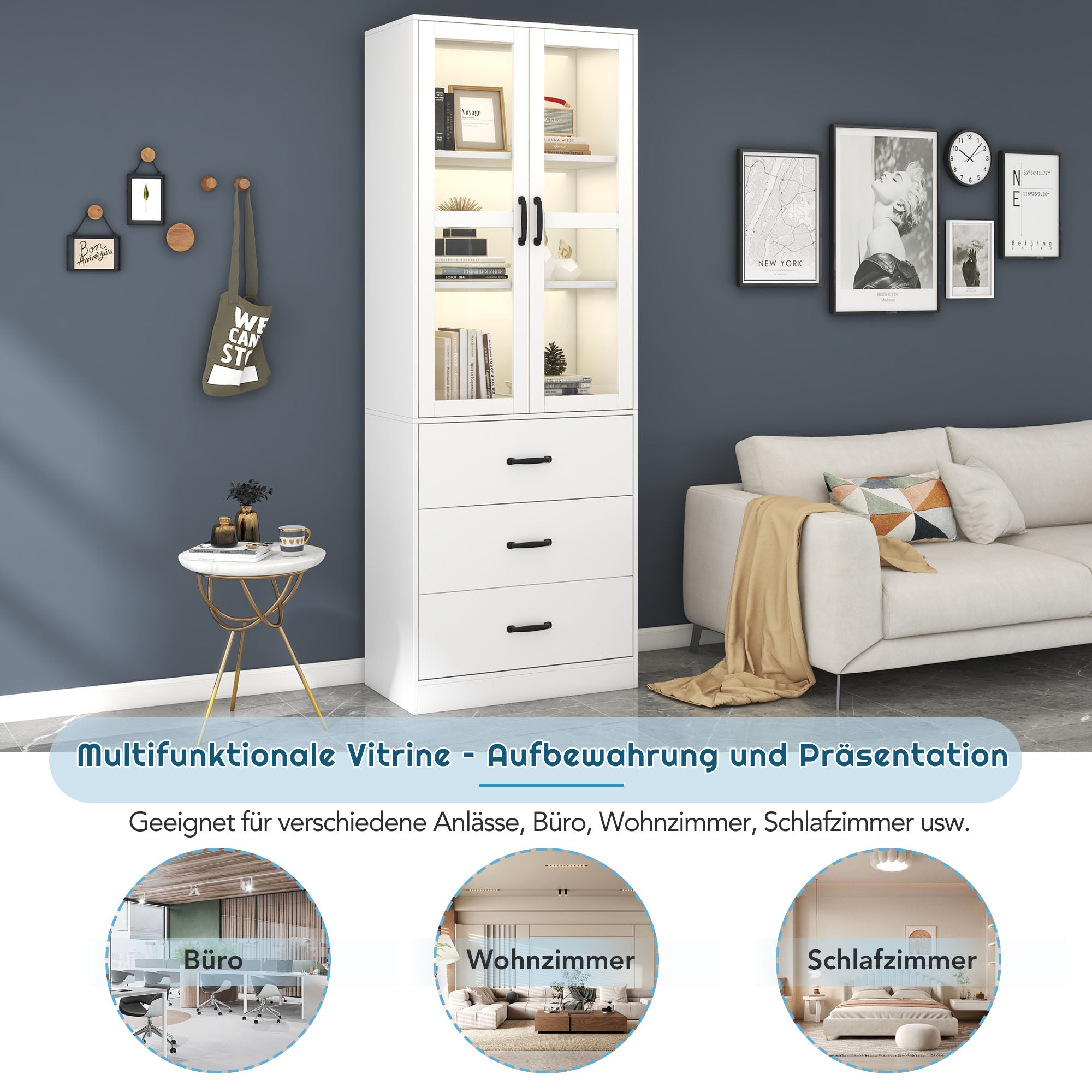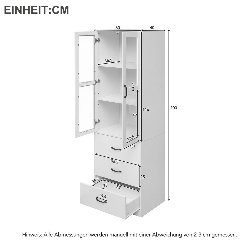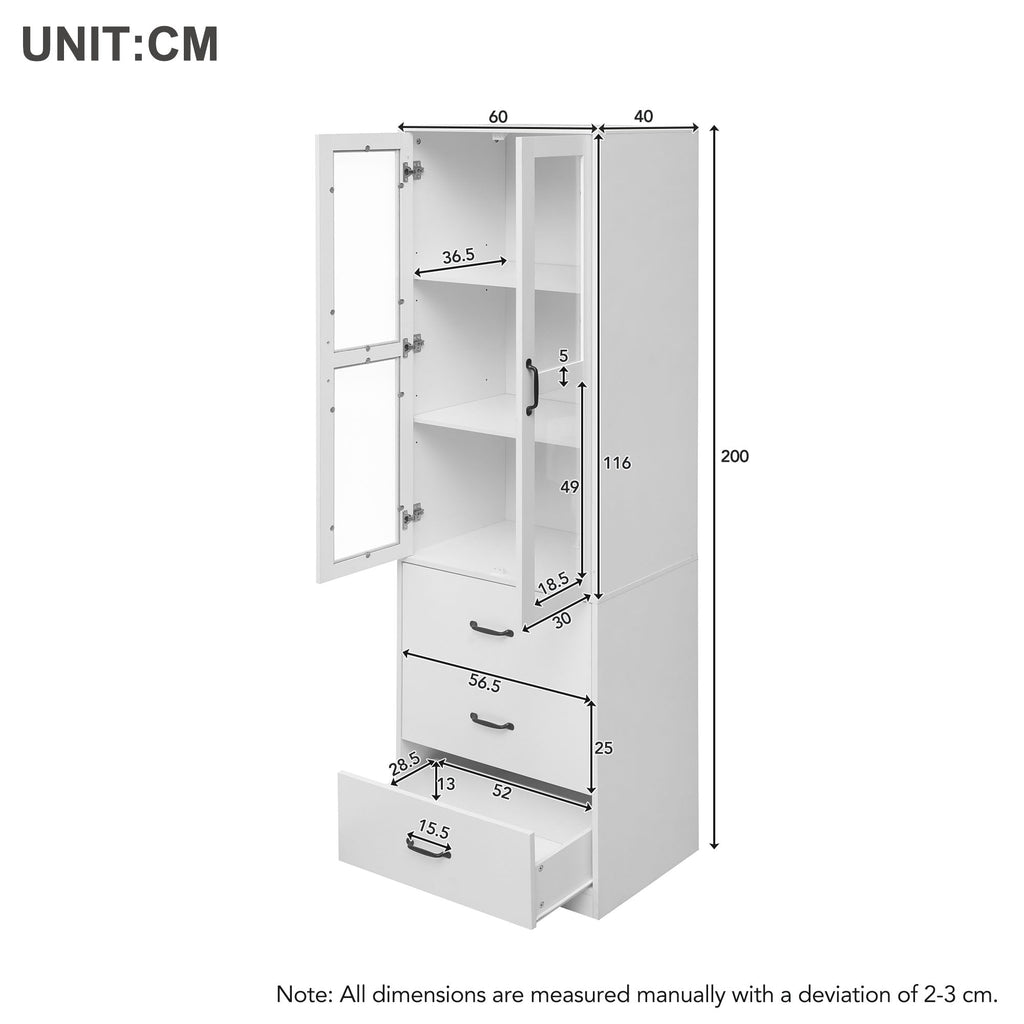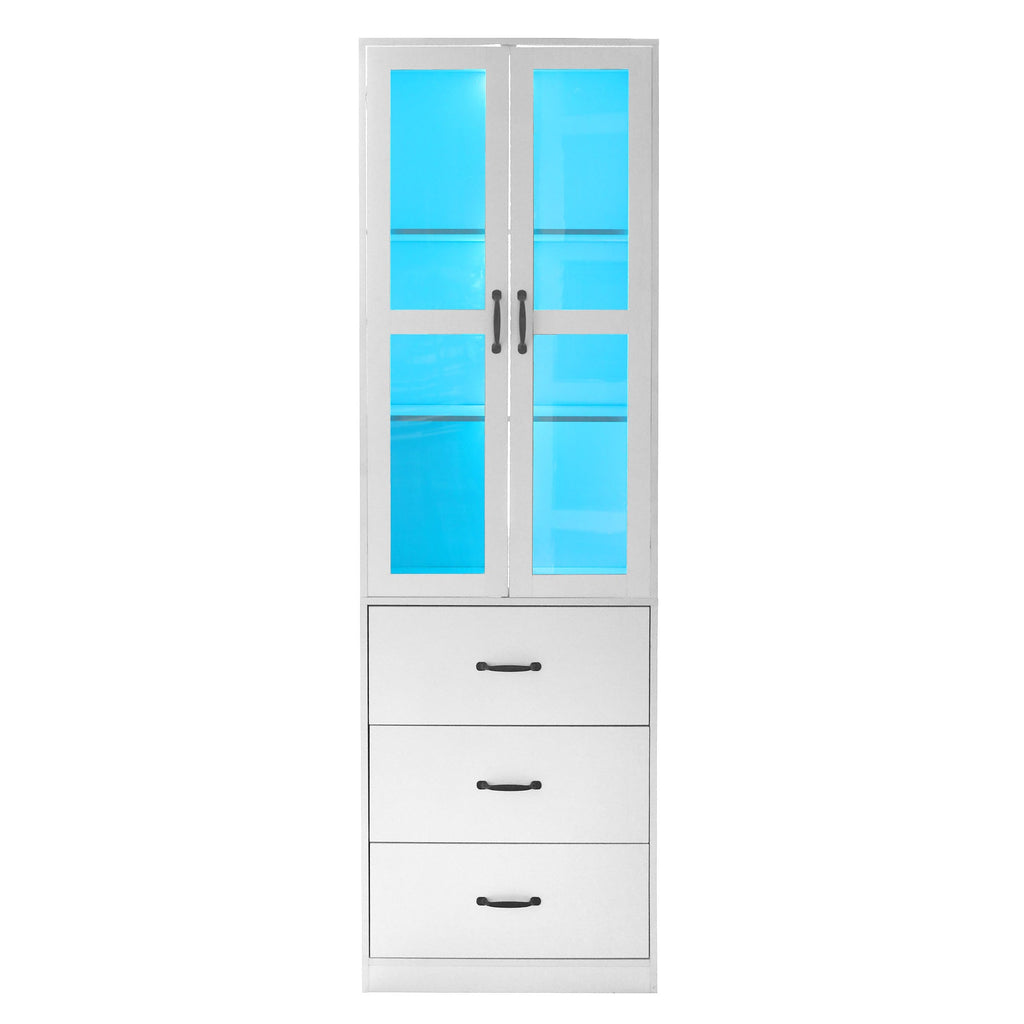 Take your home or business to the next level with our stunning white display cabinet, measuring 200 cm high and 60 cm long. This versatile cabinet features two glass doors with two adjustable shelves behind each door for a customized, three-tiered display. Three drawers underneath provide ample storage space. The cabinet is equipped with a 16-color LED strip and sleek black handles on each drawer and door.